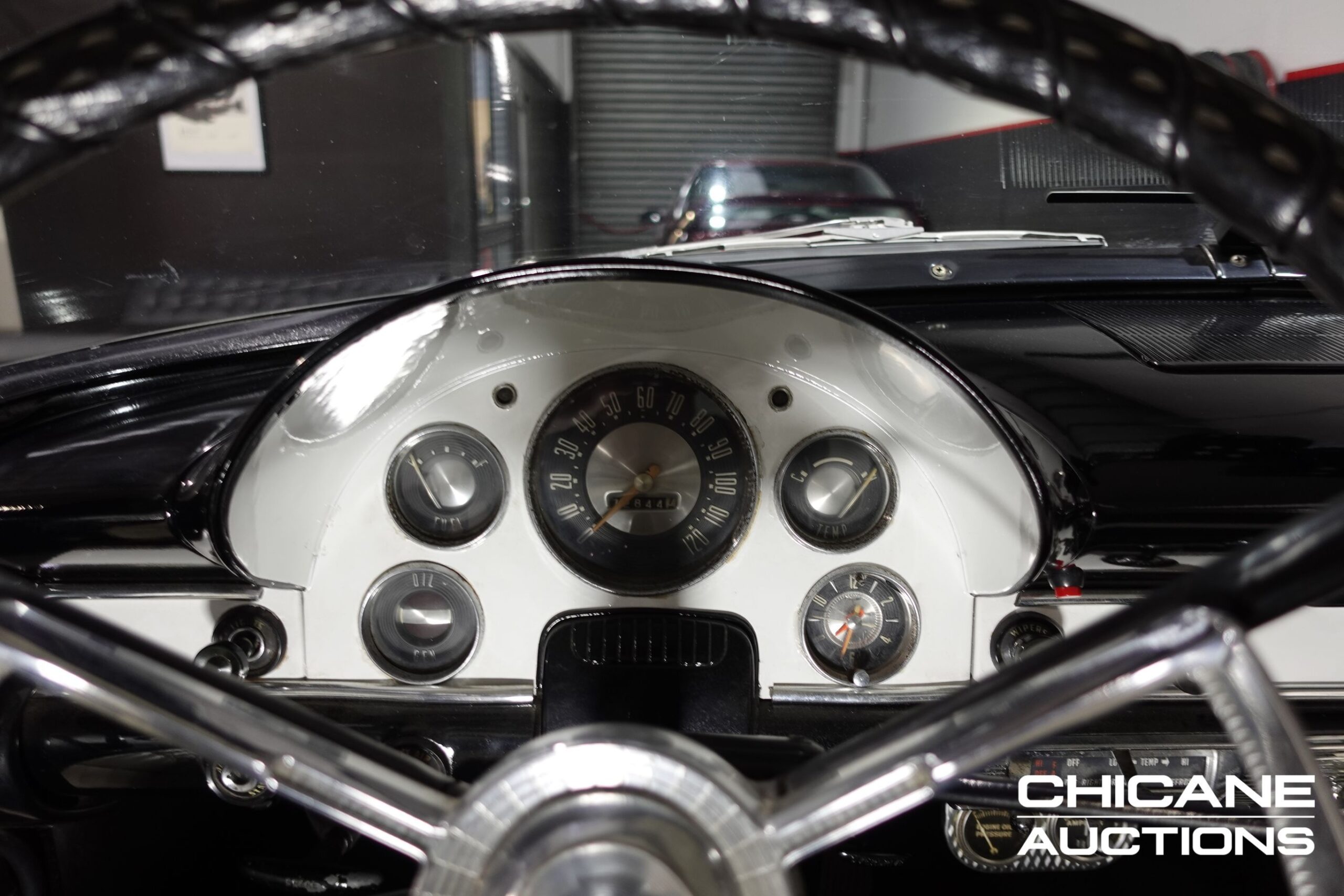The car retains its original steering wheel and column shifter, with no visible aftermarket modifications. The presence of factory power steering adds refinement to the driving experience without interrupting the car’s period charm. Overall, the cabin is an inviting, authentic space that reflects the craftsmanship of mid-century American automotive design.