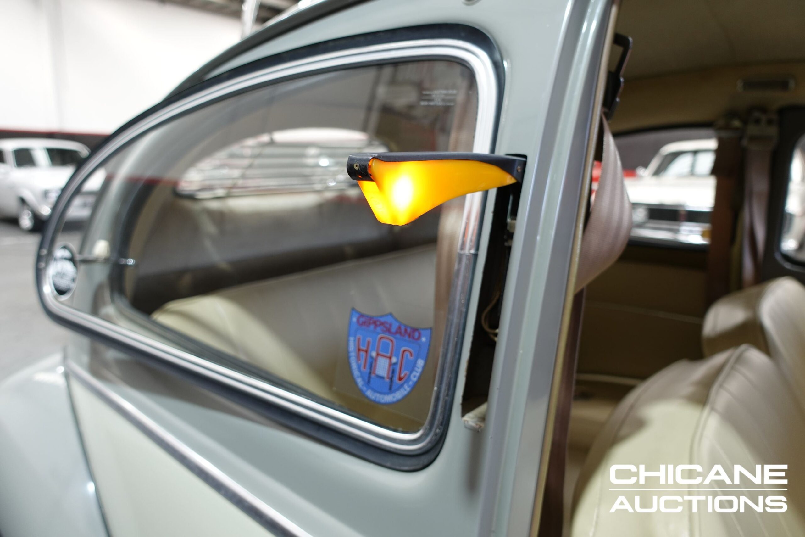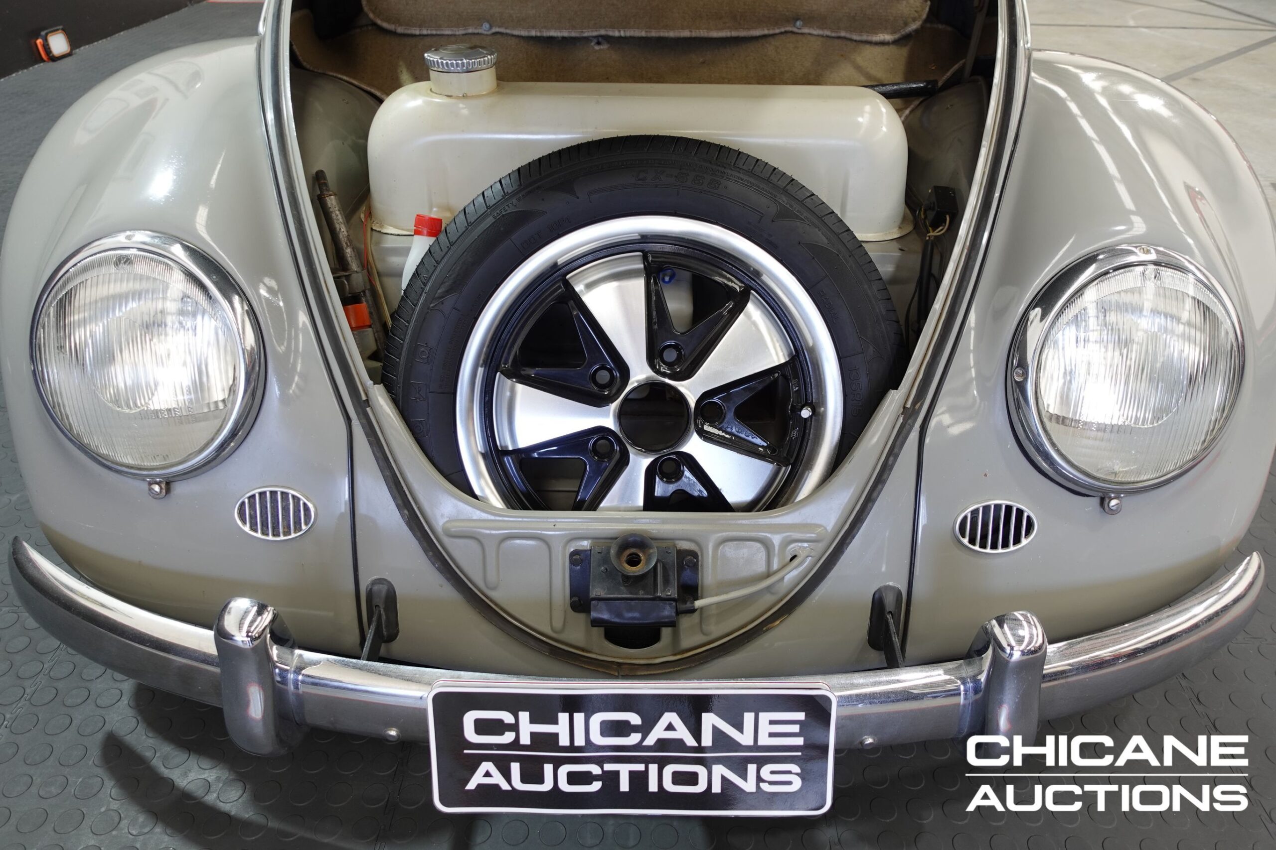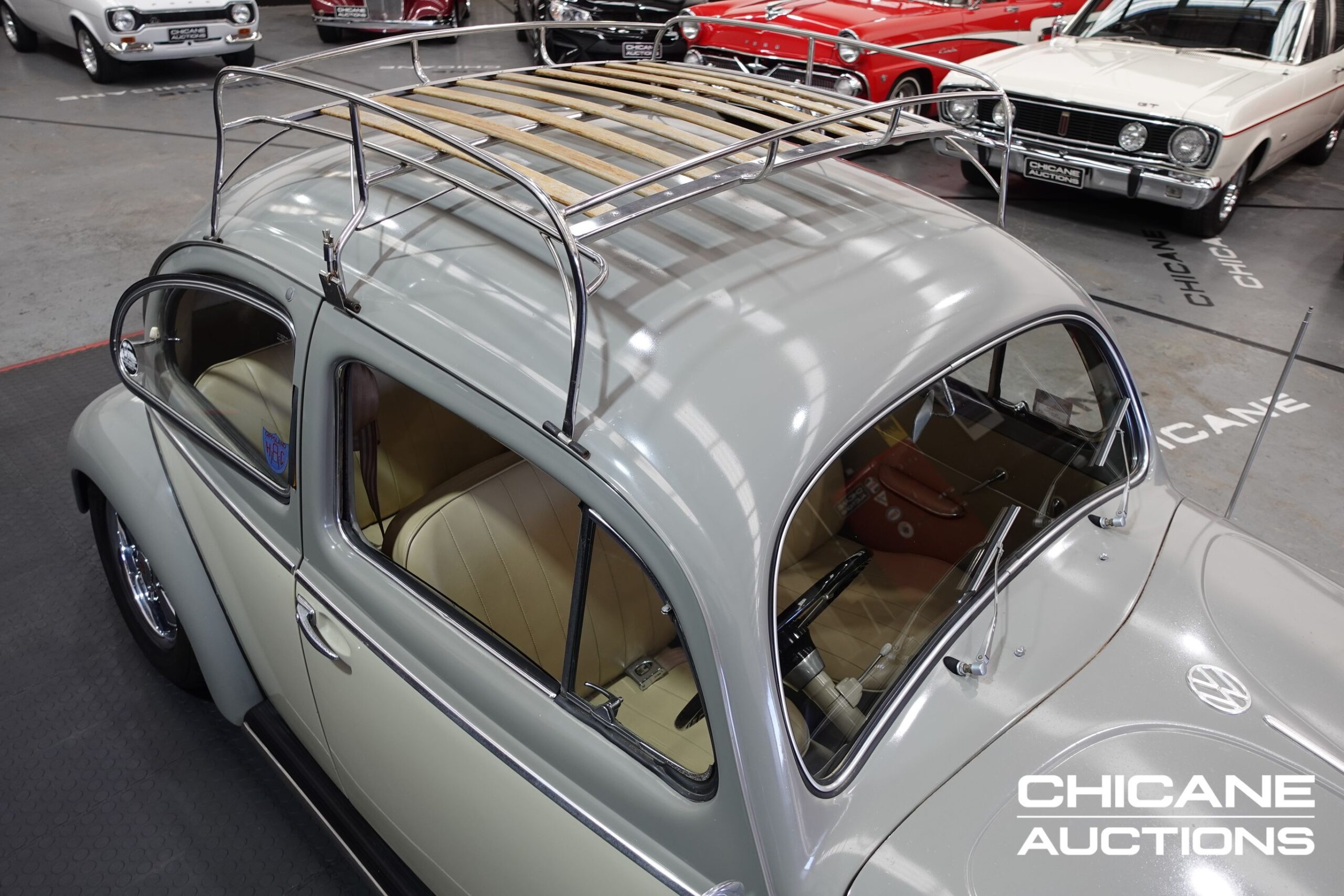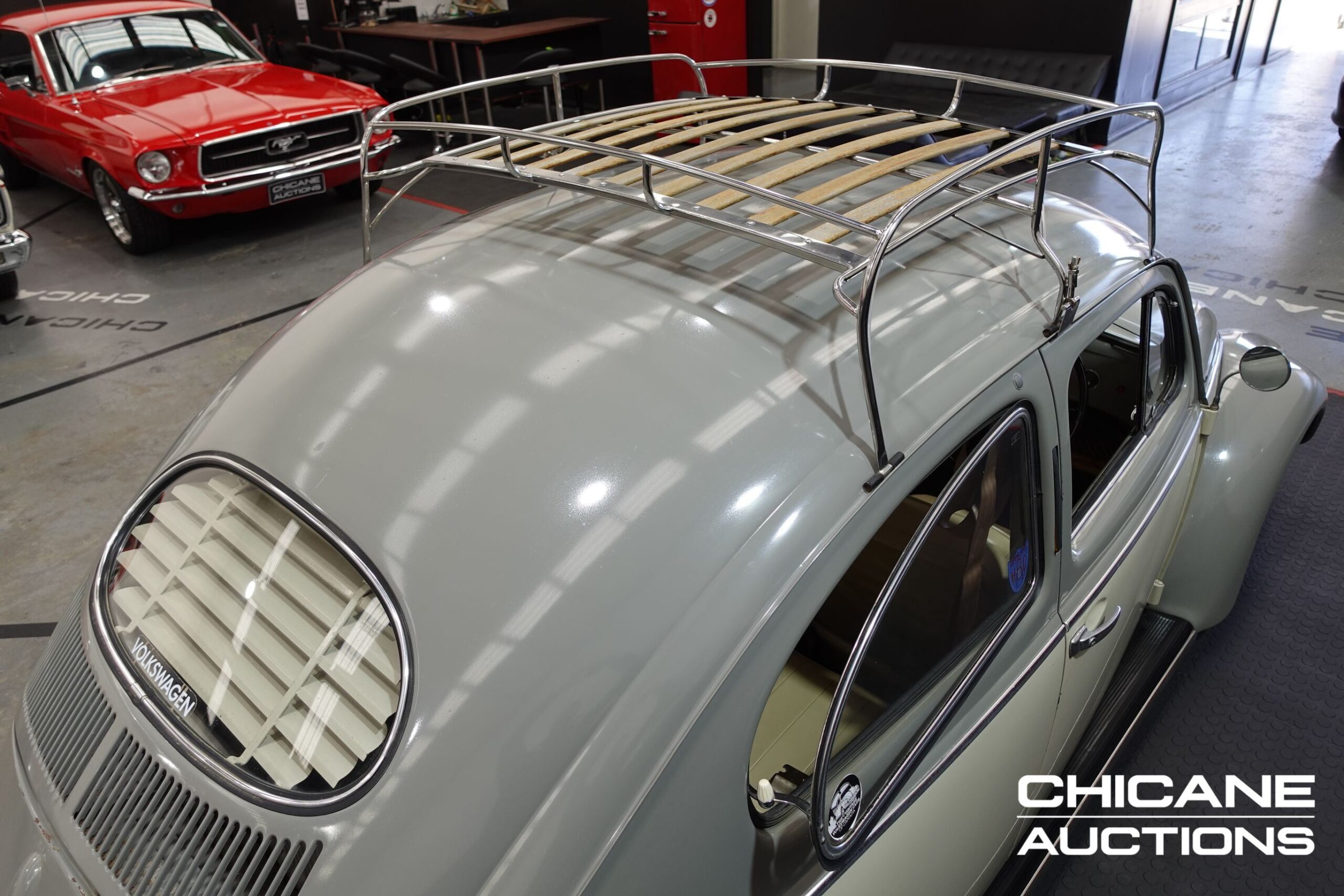 The car rides on 15-inch Porsche-style Fuchs wheels, offering a subtle performance flair that complements its stance and visual presence. The roof is fitted with stainless steel and timber slat racks, adding a classic surf-era look and enhancing practicality for weekend getaways. Factory-original style rear pop-out quarter windows are fitted and functional, providing extra ventilation and a desirable period-correct detail. This Beetle retains its original semaphore indicators, which extend from the B-pillars and illuminate properly — a signature factory feature of early Beetles, in full working condition.