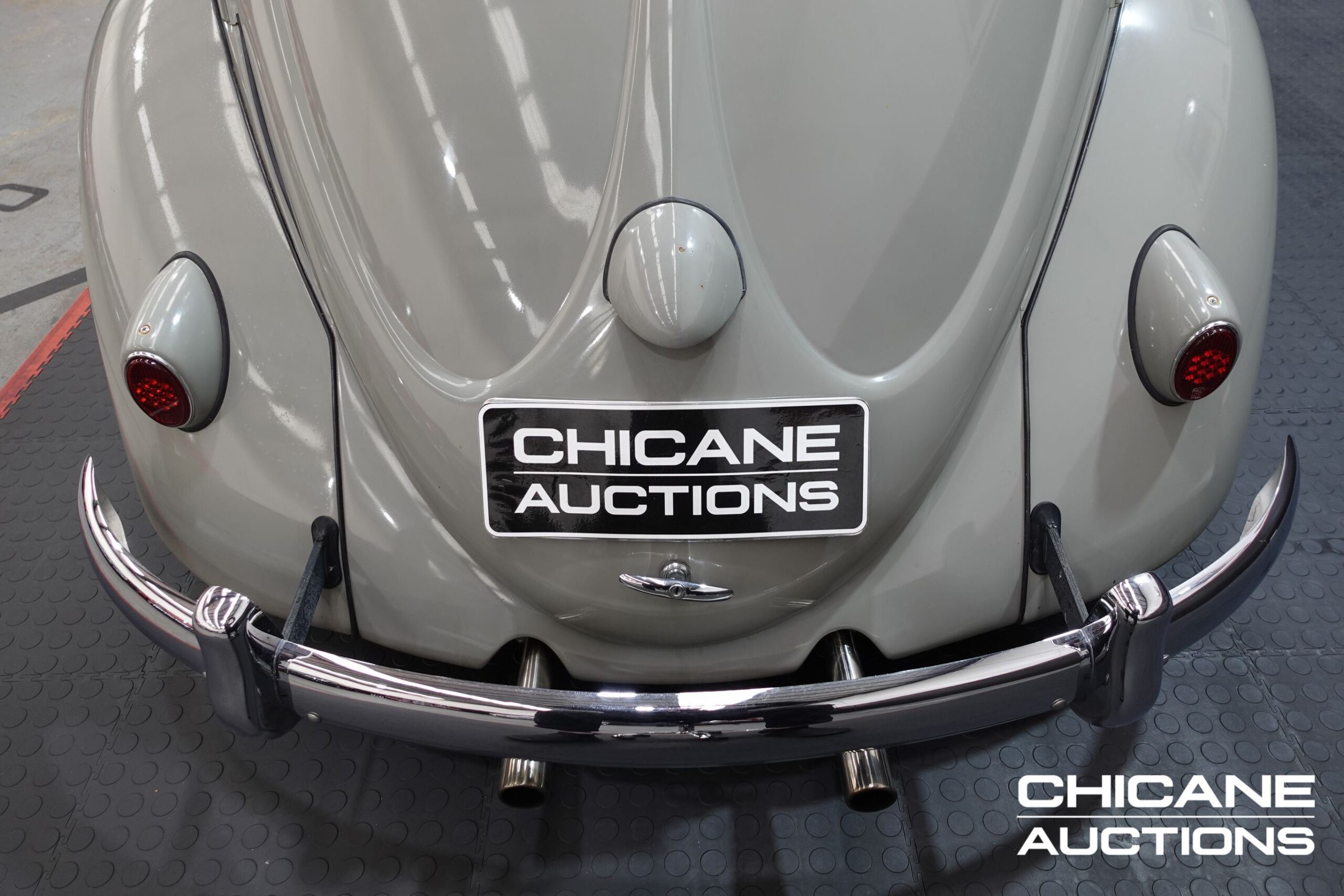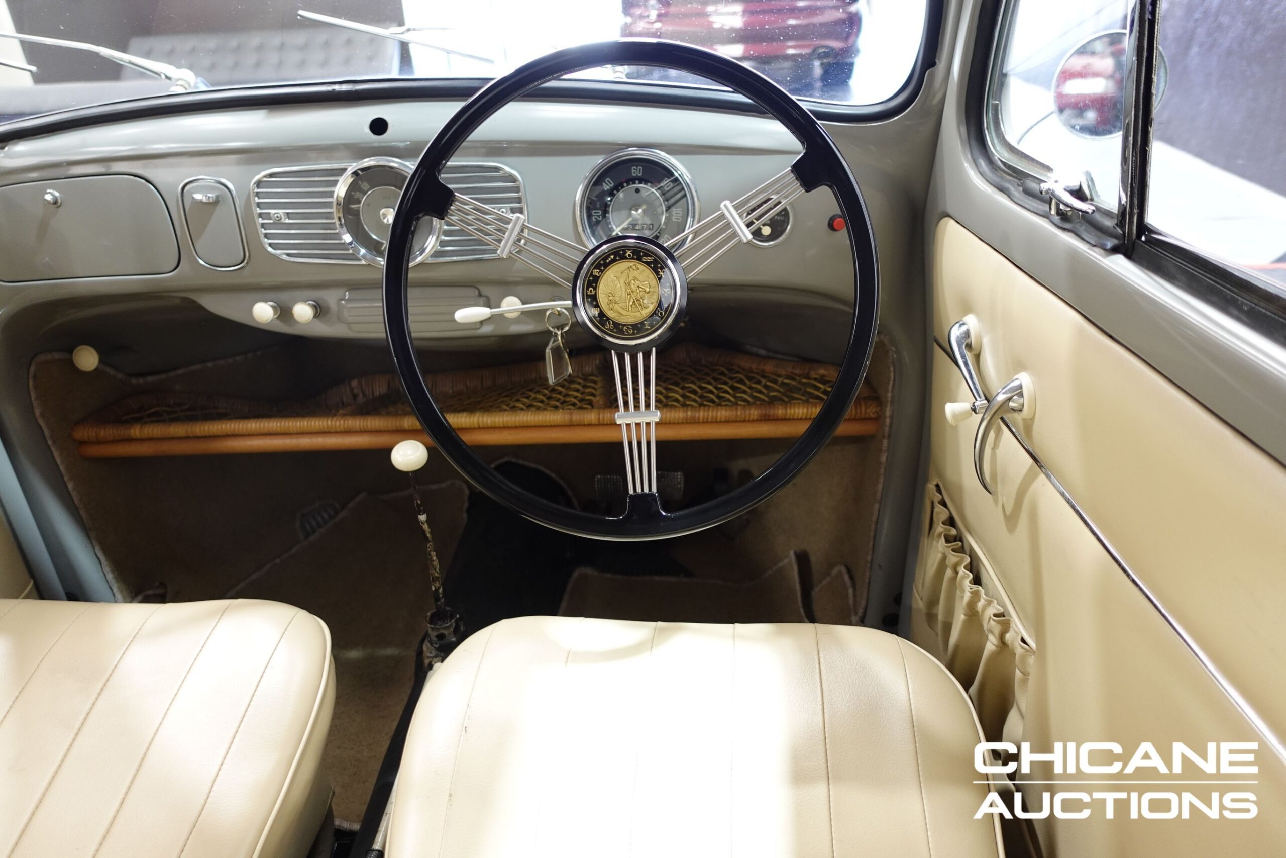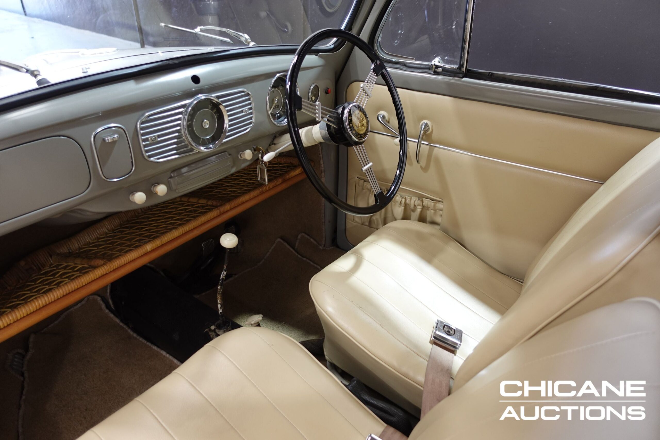 This 1956 Volkswagen Beetle is a beautifully presented oval-window model that blends period charm with well-considered mechanical enhancements. Retaining its original factory semaphore indicators, a rust-free structure, and lightly patinated two-tone paint, it maintains its visual authenticity while offering real-world usability thanks to a 1600cc twin-port engine, 12V electrics, disc brakes, and a renewed suspension setup.