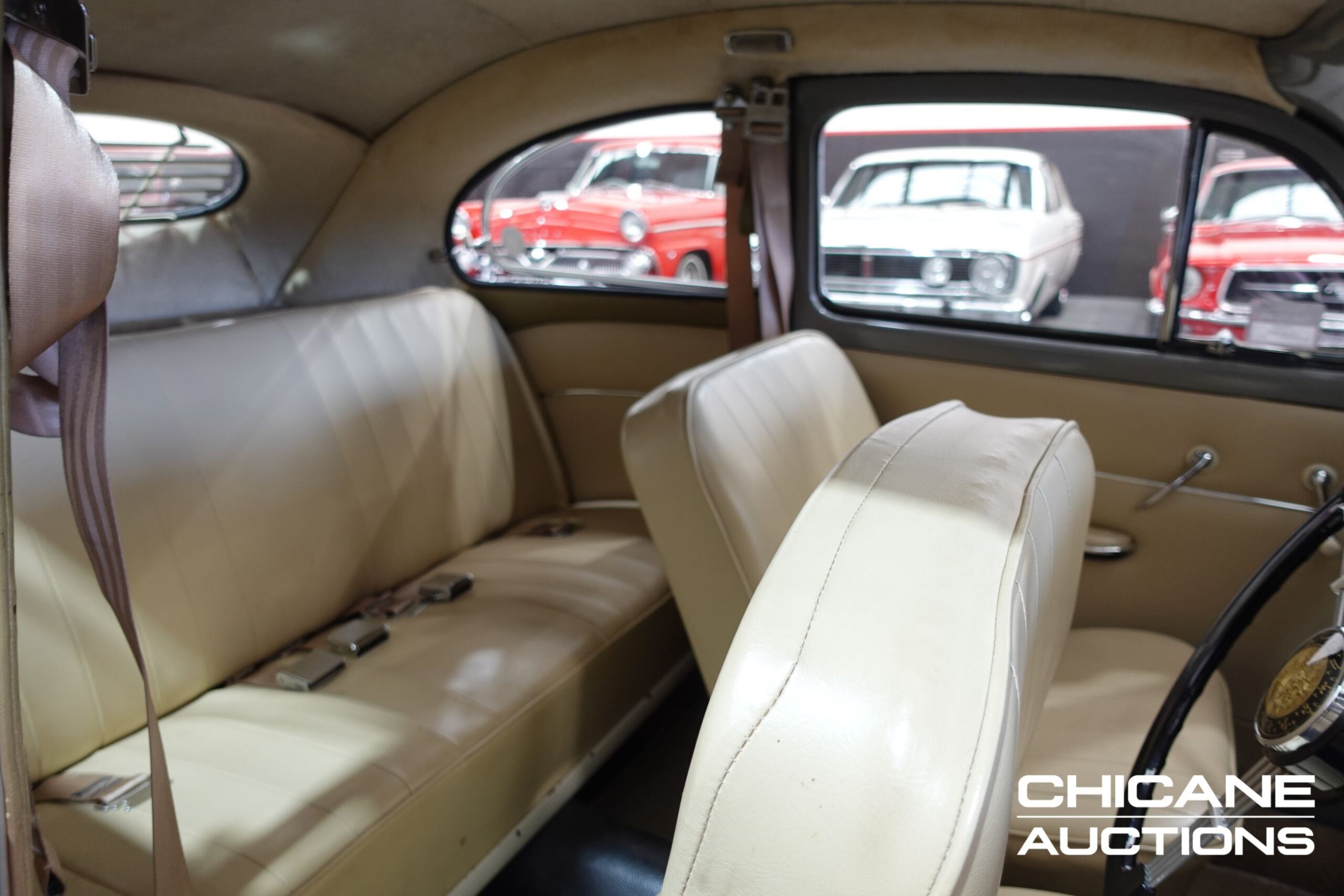 Instrumentation is clear, functional, and correct for the model year, with no aftermarket modifications detracting from the factory look. Added additions of a wicker dash shelf and fantastic little Venetian blind for the rear window add character. The feel of the cabin is both welcoming and authentic, combining 1950s simplicity with thoughtful preservation.