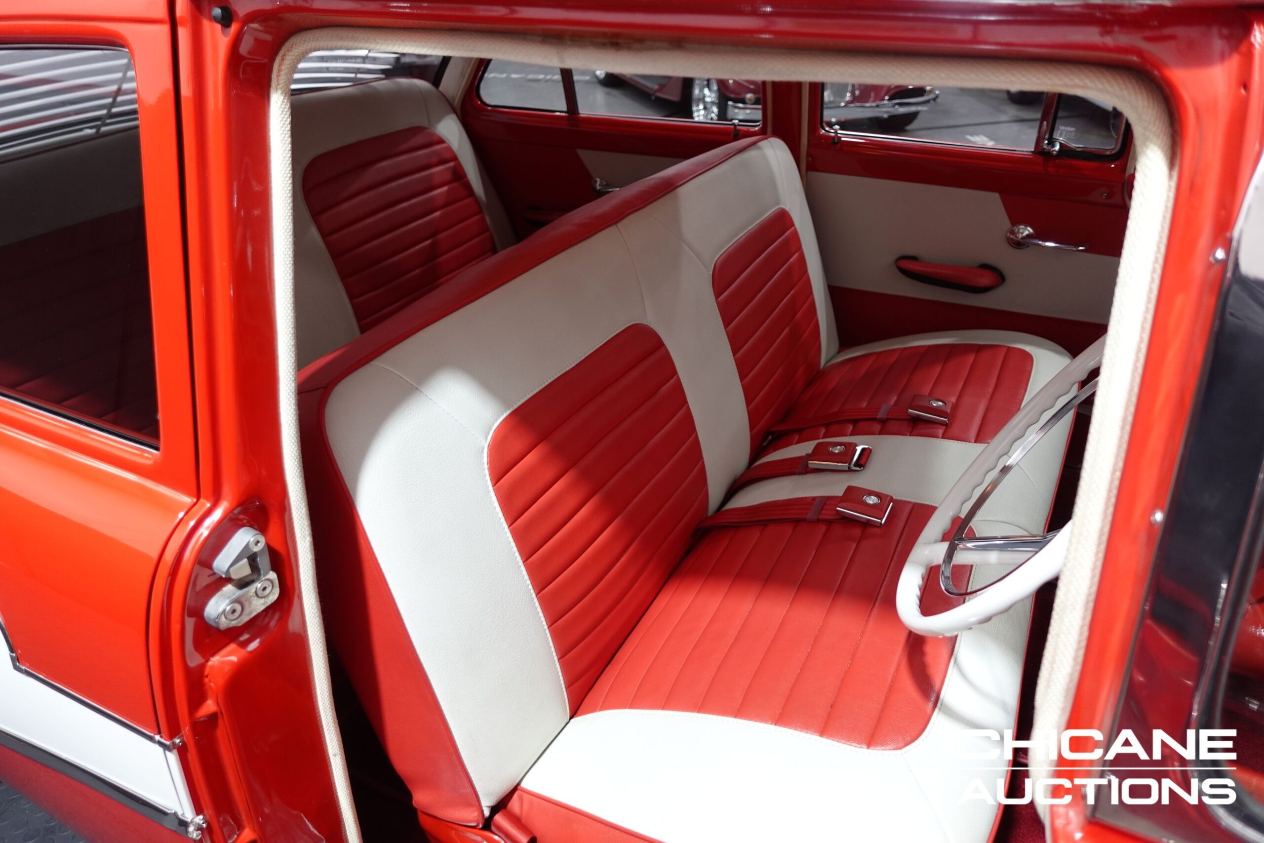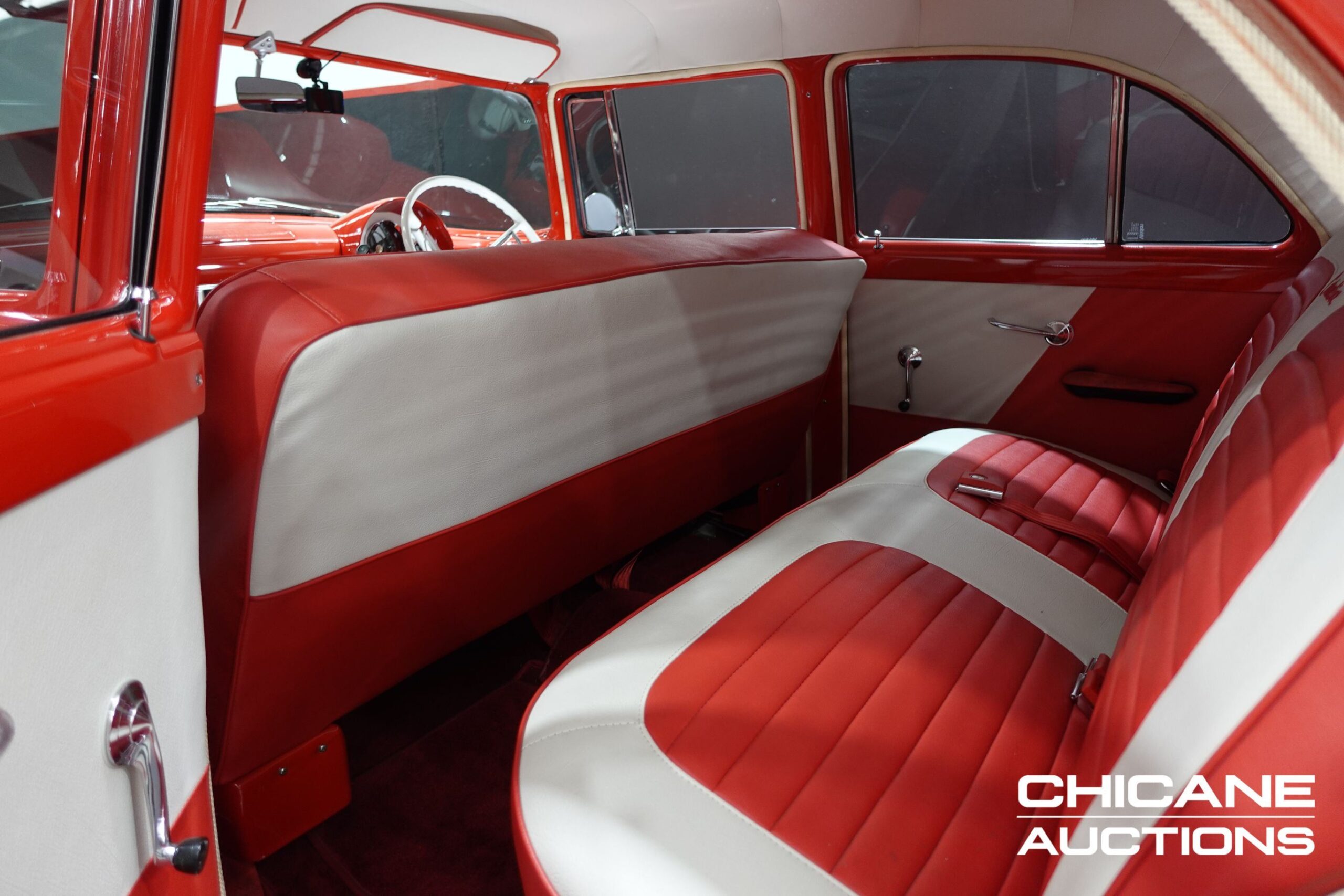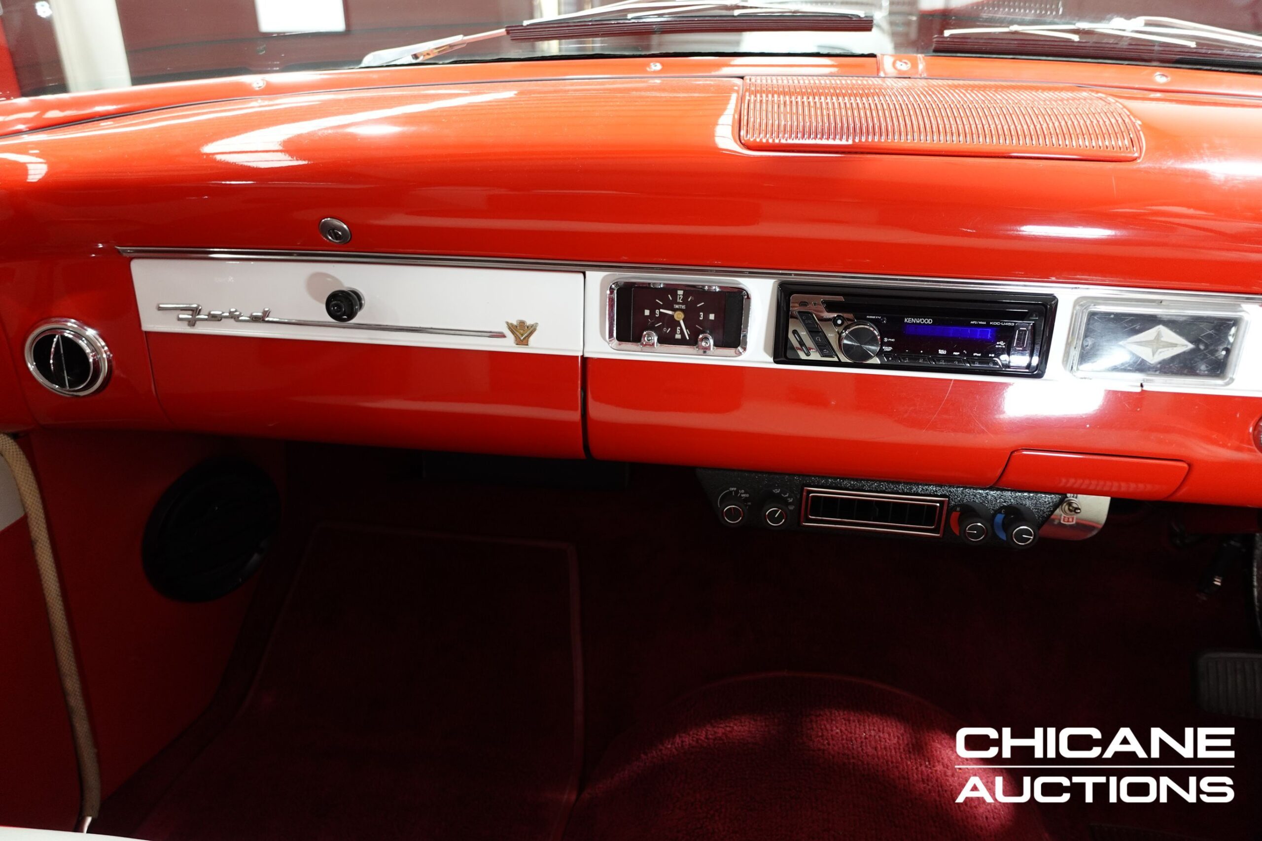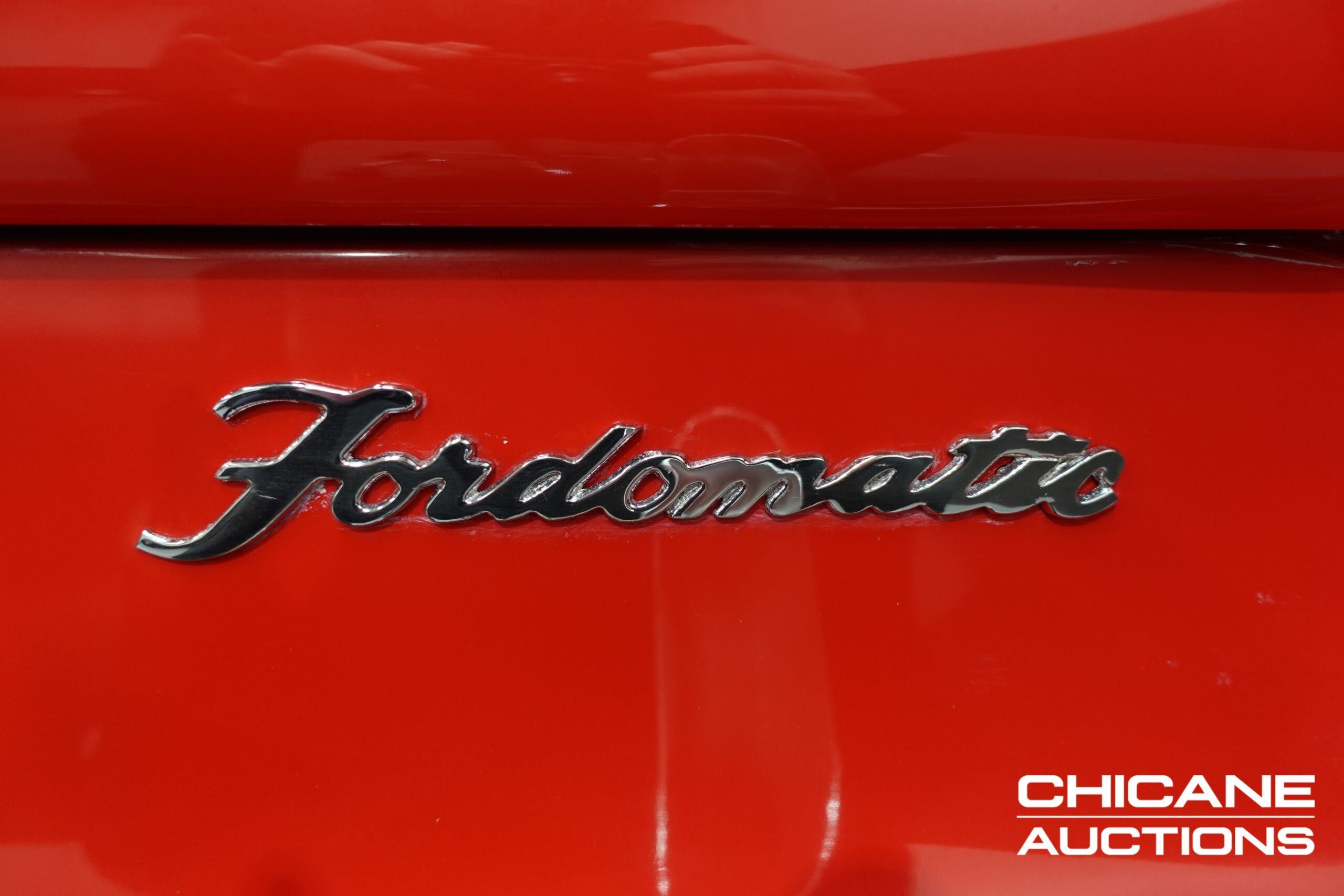 The cabin of this Customline has been the subject of a complete and professional interior refurbishment, carried out to an exceptional standard. The seats and door cards have been fully reupholstered in beautifully matched red and white vinyl, perfectly complementing the car’s exterior colour scheme and evoking the glamour of 1950s motoring.