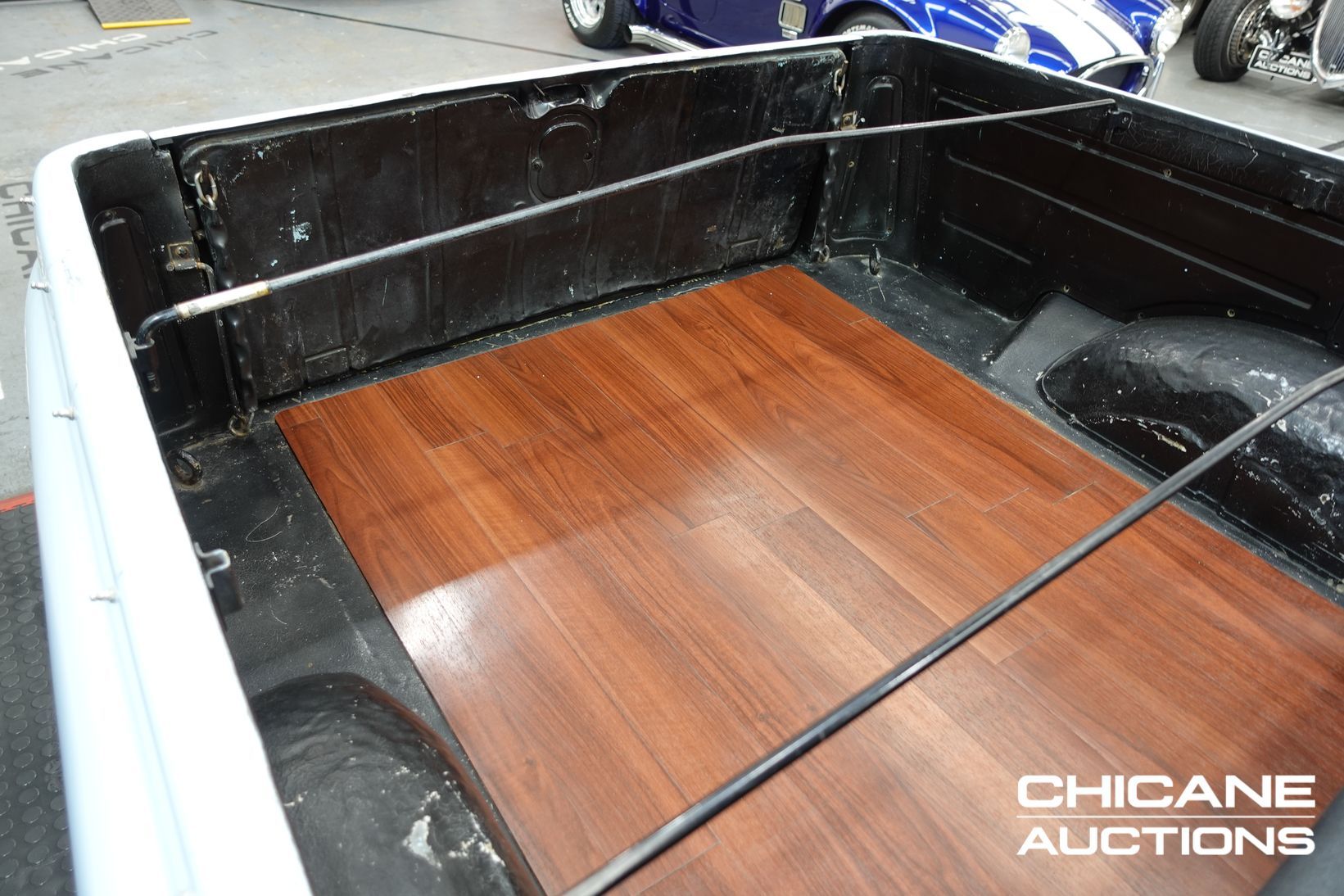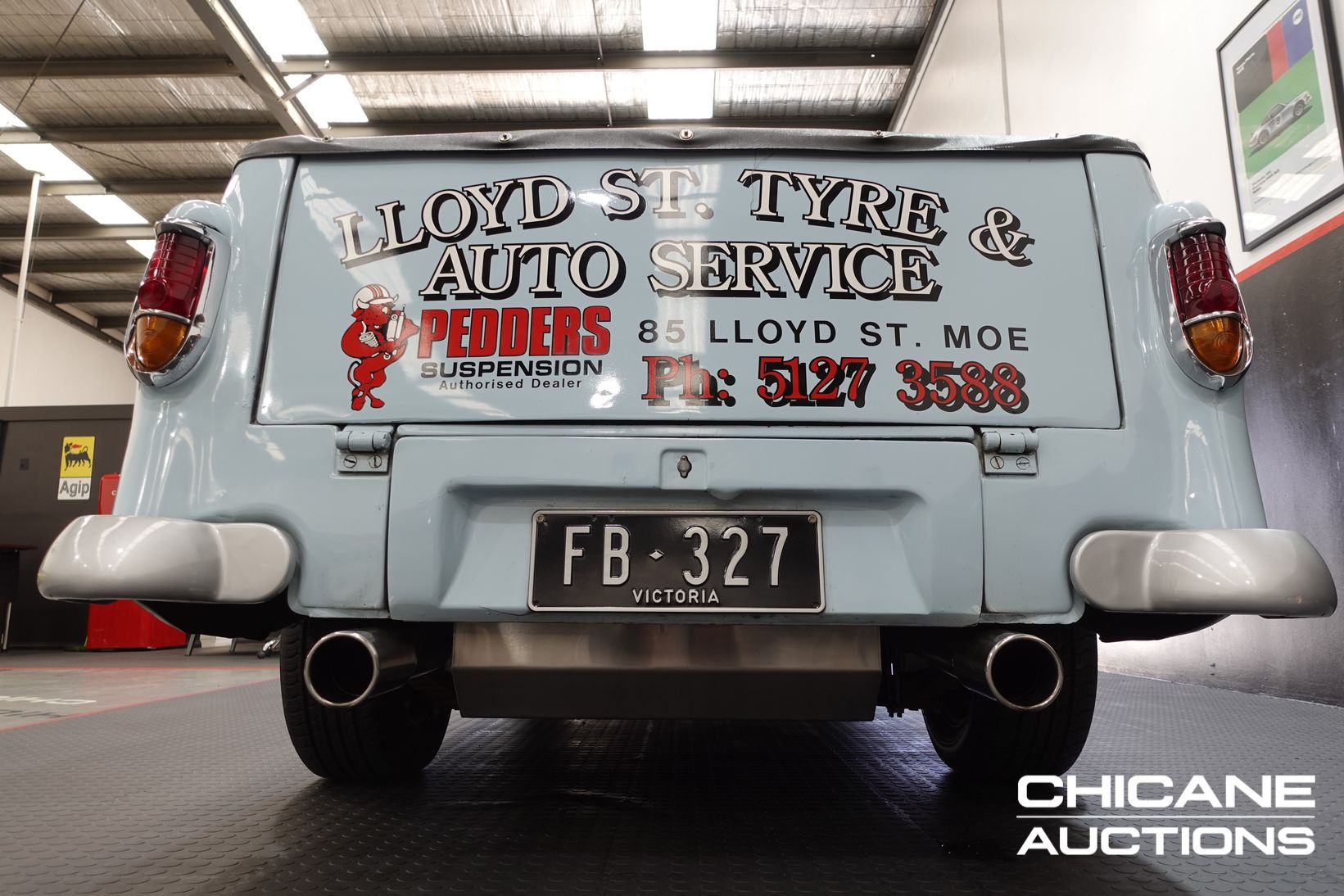 The FB Utility’s body retains its original vintage patina shop truck style in its original color of Wedgewood Blue with various blemishes all over that add character. The Rear Tub features nice wood panelling, and the tonneau cover with bows, are in good condition. Bumper bars are painted in matt silver. The light lenses are all in good condition. The car rides on Weld alloy wheels — 15x6-inch front and 15x7-inch rear, which give just the right stance without overplaying the visual aggression. Signwriting on doors and tailgate are only stickers and are easily removed.