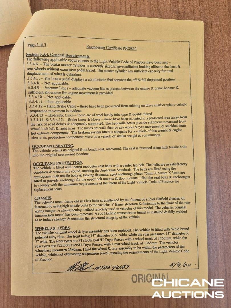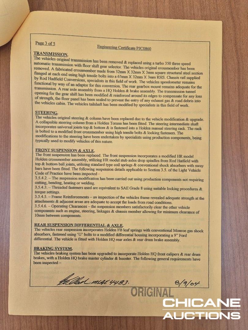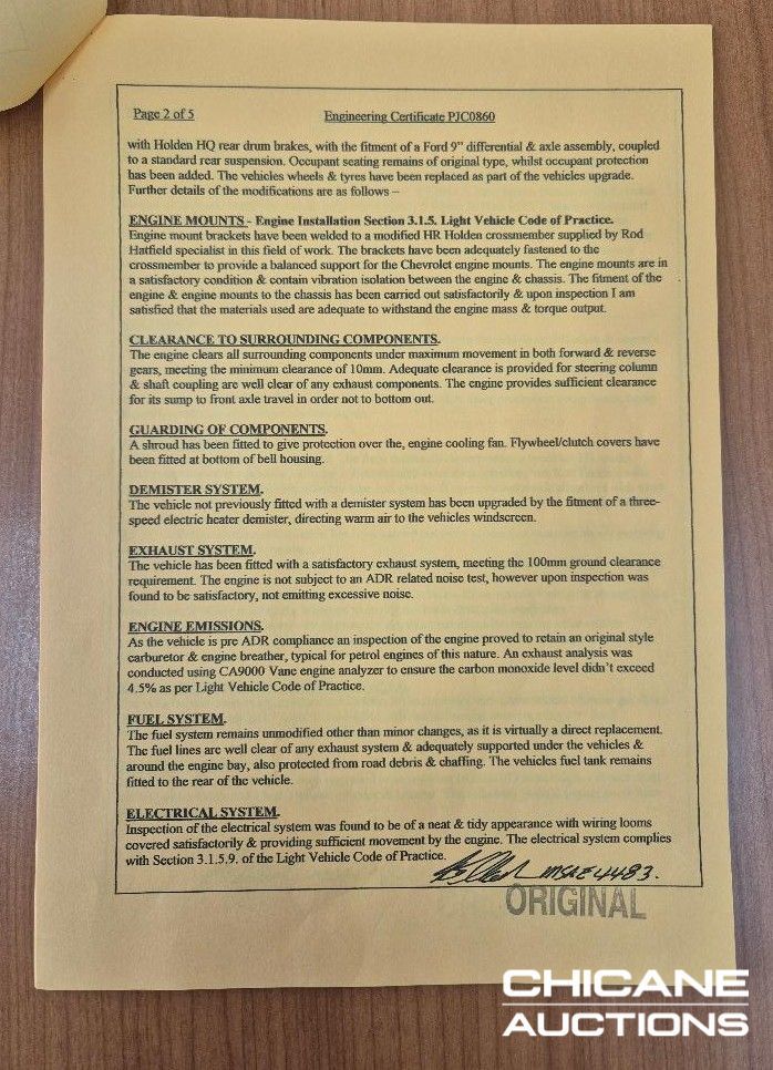 The Chevrolet 327ci small-block V8 is built with TRW forged pistons, fuellie double hump port flowed / matched cylinder heads, stainless steel valves, roller rockers with guide plates, a Victor Junior intake manifold, a Lunati solid camshaft, Comp valve springs, ARP fasteners, MSD ignition, a lightened flywheel, Holley 750 Demon, and a high-energy sump with Rod Hadfeild extractor and big twin exhaust. This high-performance combination produces an estimated 400+ horsepower. Power is sent through a Turbo 350 with HD stall converter with a floor shifter, mounted using a fabricated high-tensile crossmember. The floor has been reshaped and reinforced to house the Turbo 350 transmission and shifter while maintaining structural strength. The rear end features a Ford 9-inch differential fitted with HQ rear axles and drum brakes, coupled to the original FB leaf springs with Monroe gas shock absorbers. Steering is via a collapsible Holden Torana column and manual rack and pinion steering, connected with universal joints and high-tensile fixings for strength and precision. The HR Holden front suspension incorporates coil springs, a sway bar, and a disc brake setup for improved stability and stopping power. All modifications, from the reinforced chassis, diff housing to the transmission tunnel, have been engineered to ensure correct clearances, ground height compliance, and long-term durability. A SS drop tank is also fitted to complete the package.