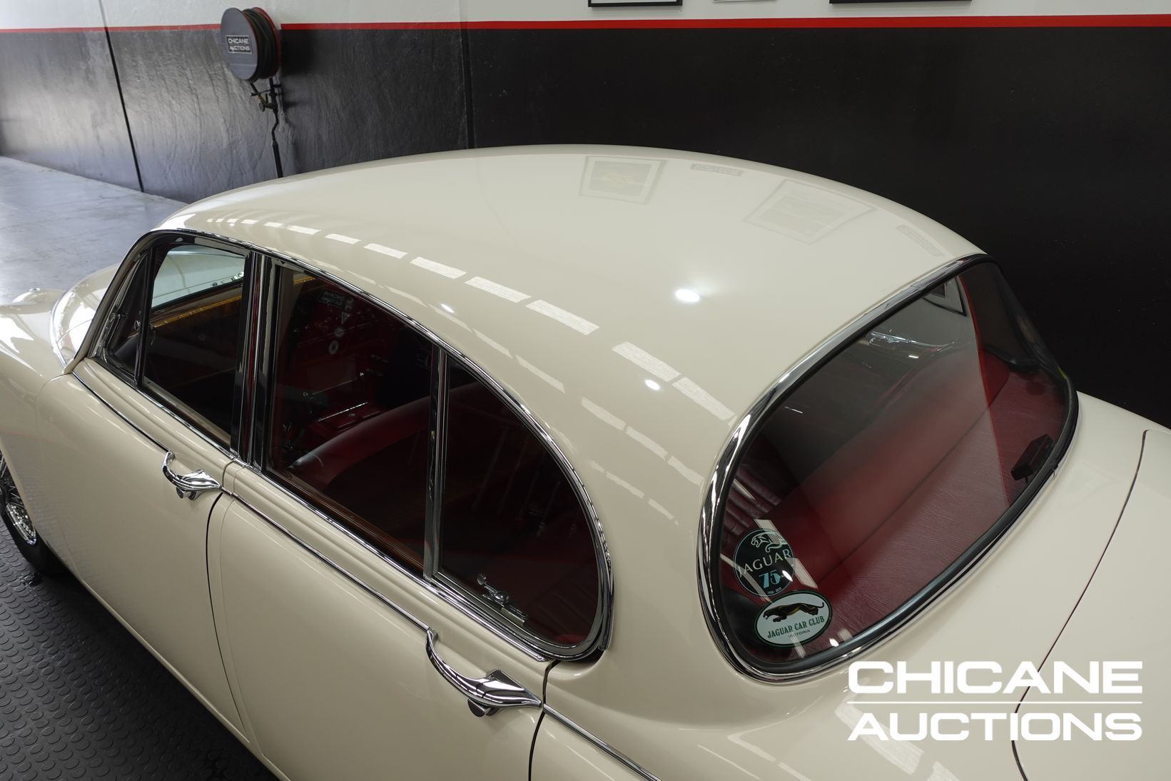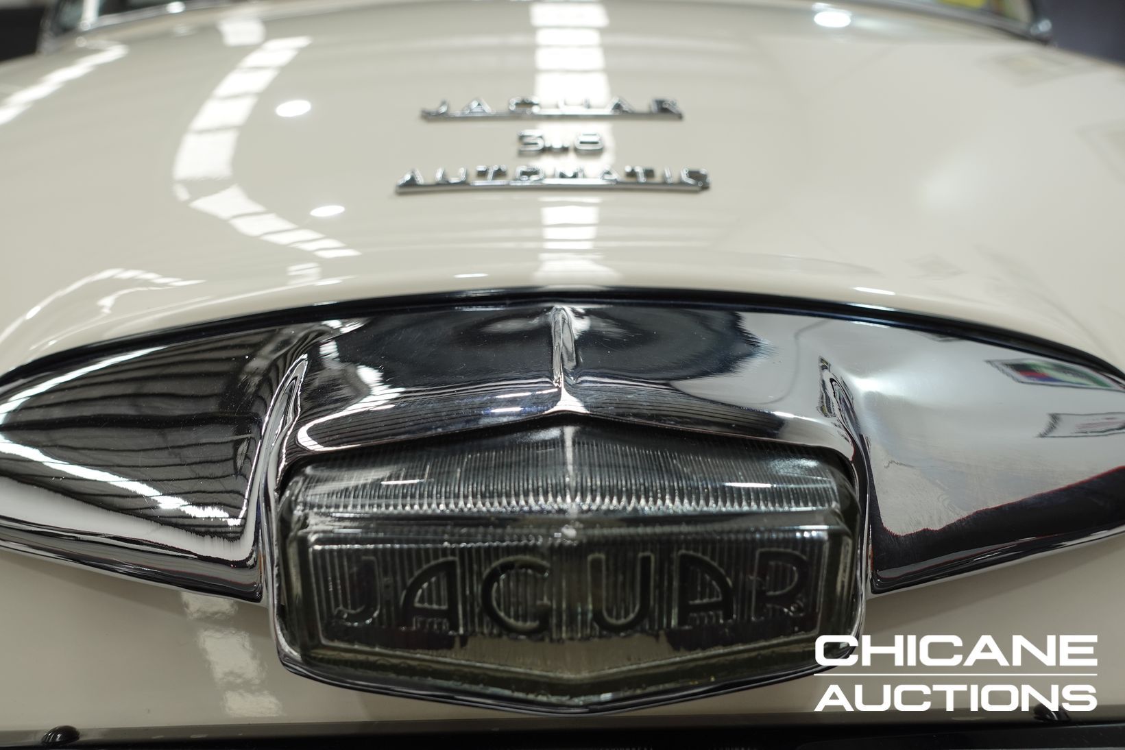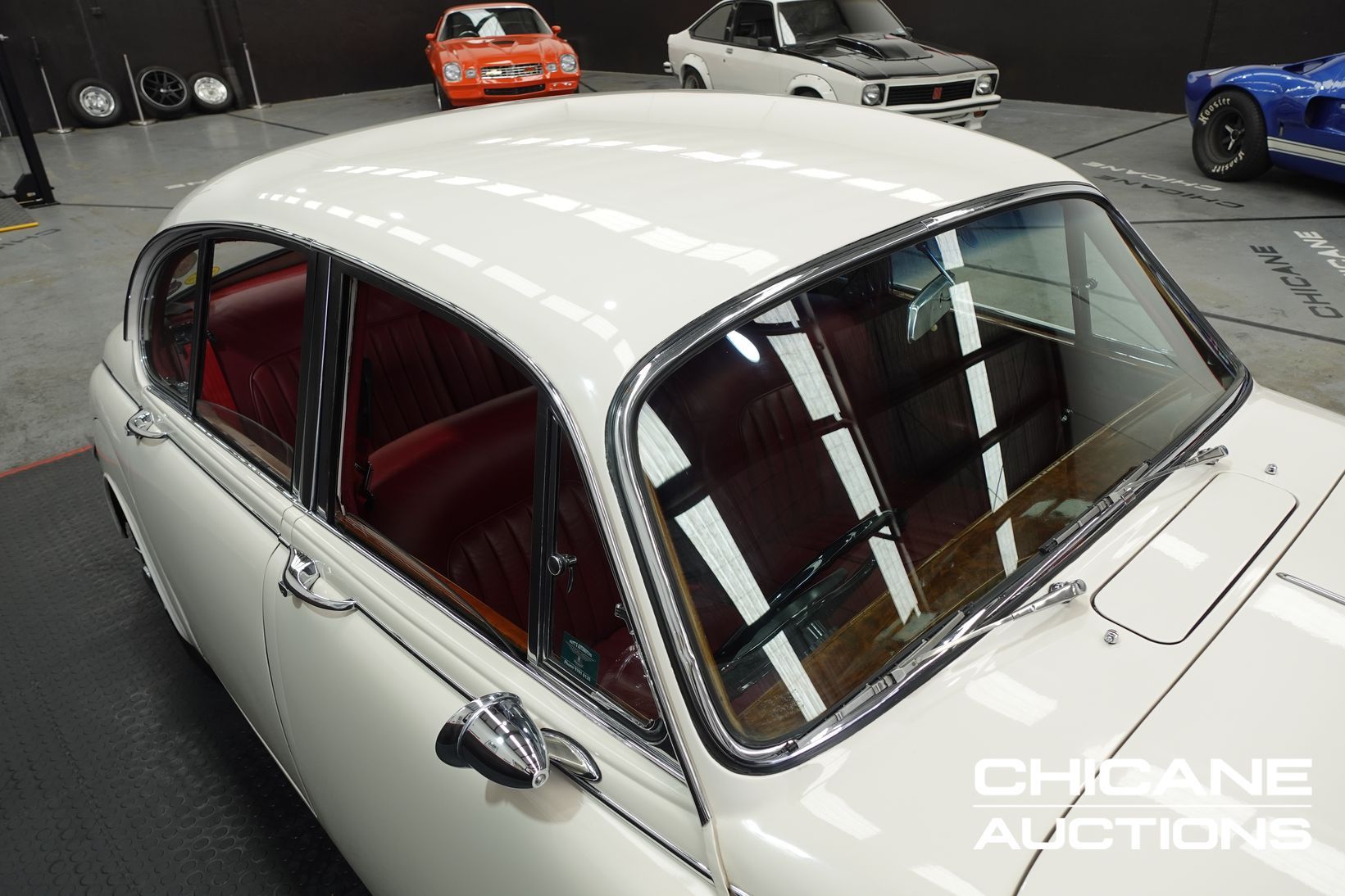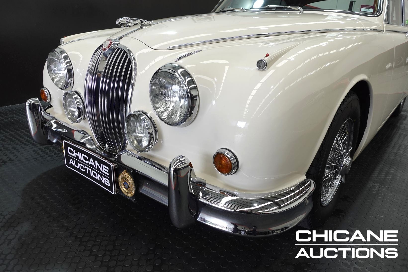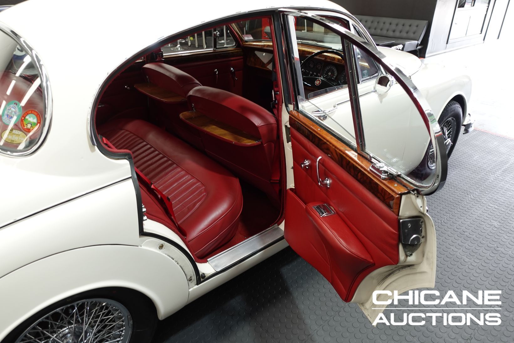 Finished in Old English White, the bodywork presents with crisp panel gaps and a deep lustrous paint finish. The chrome brightwork, including the iconic Jaguar grille, bumpers and window surrounds, gleams without pitting. Distinctive details such as the slim pillar design, rear spats, and elegant chrome wire wheels complete the picture of a quintessential early-1960s British sports saloon. Every aspect of the exterior restoration reflects both correctness and quality.