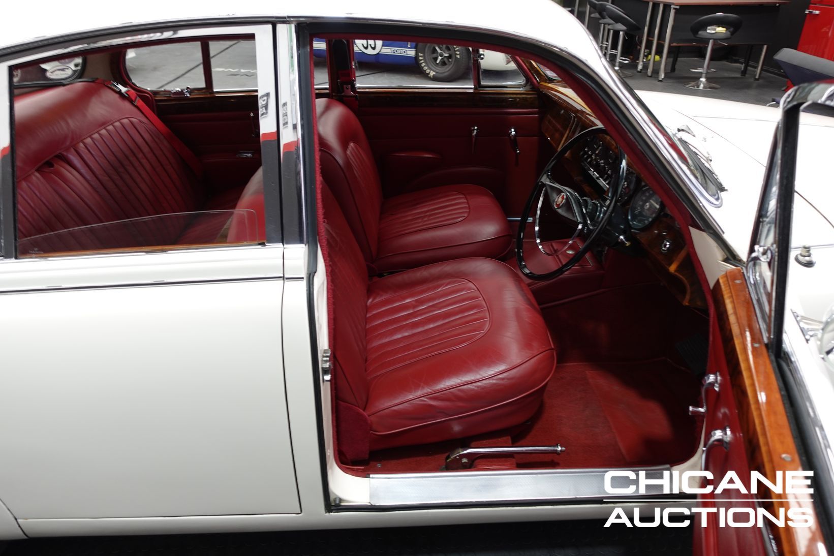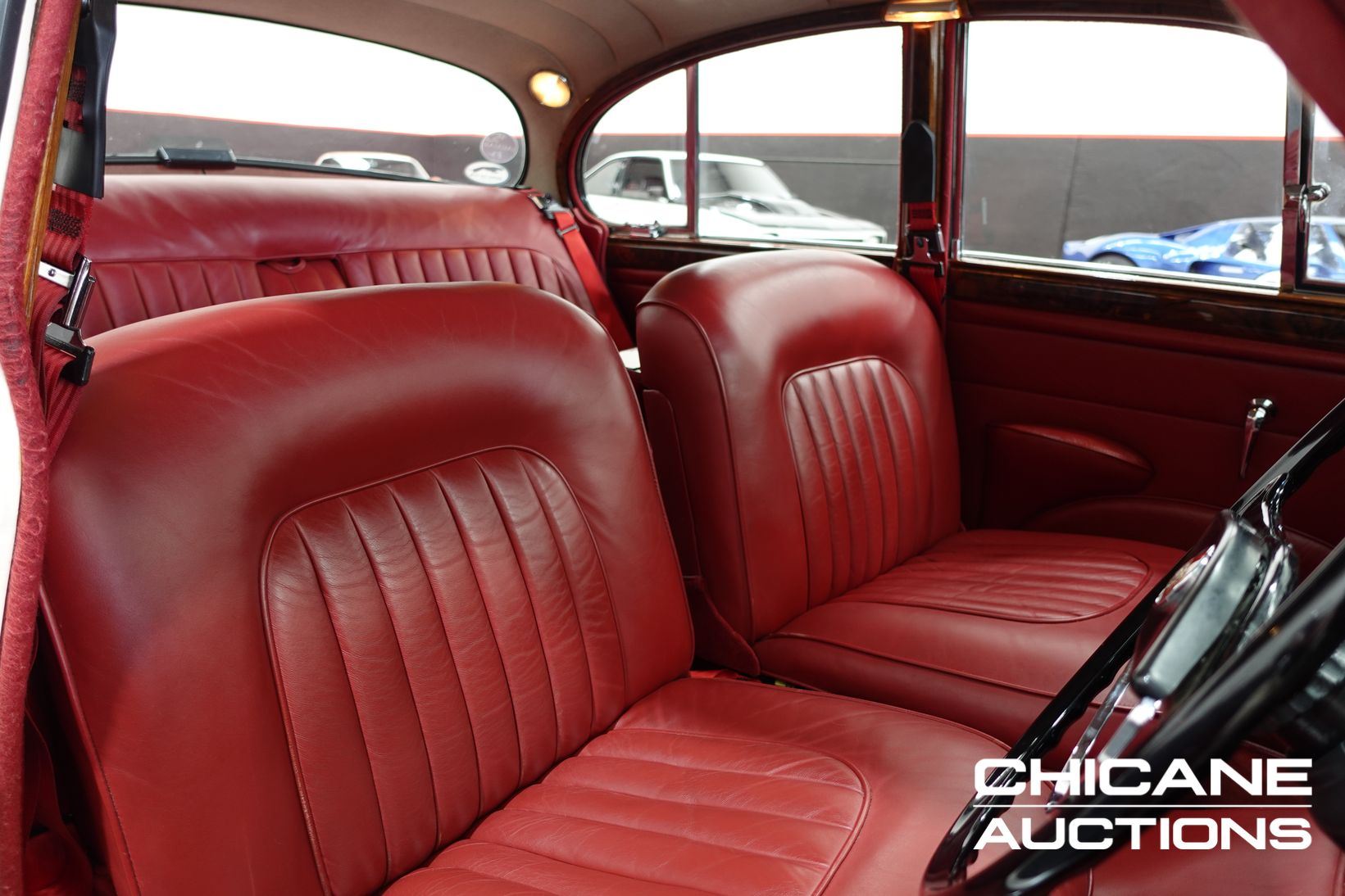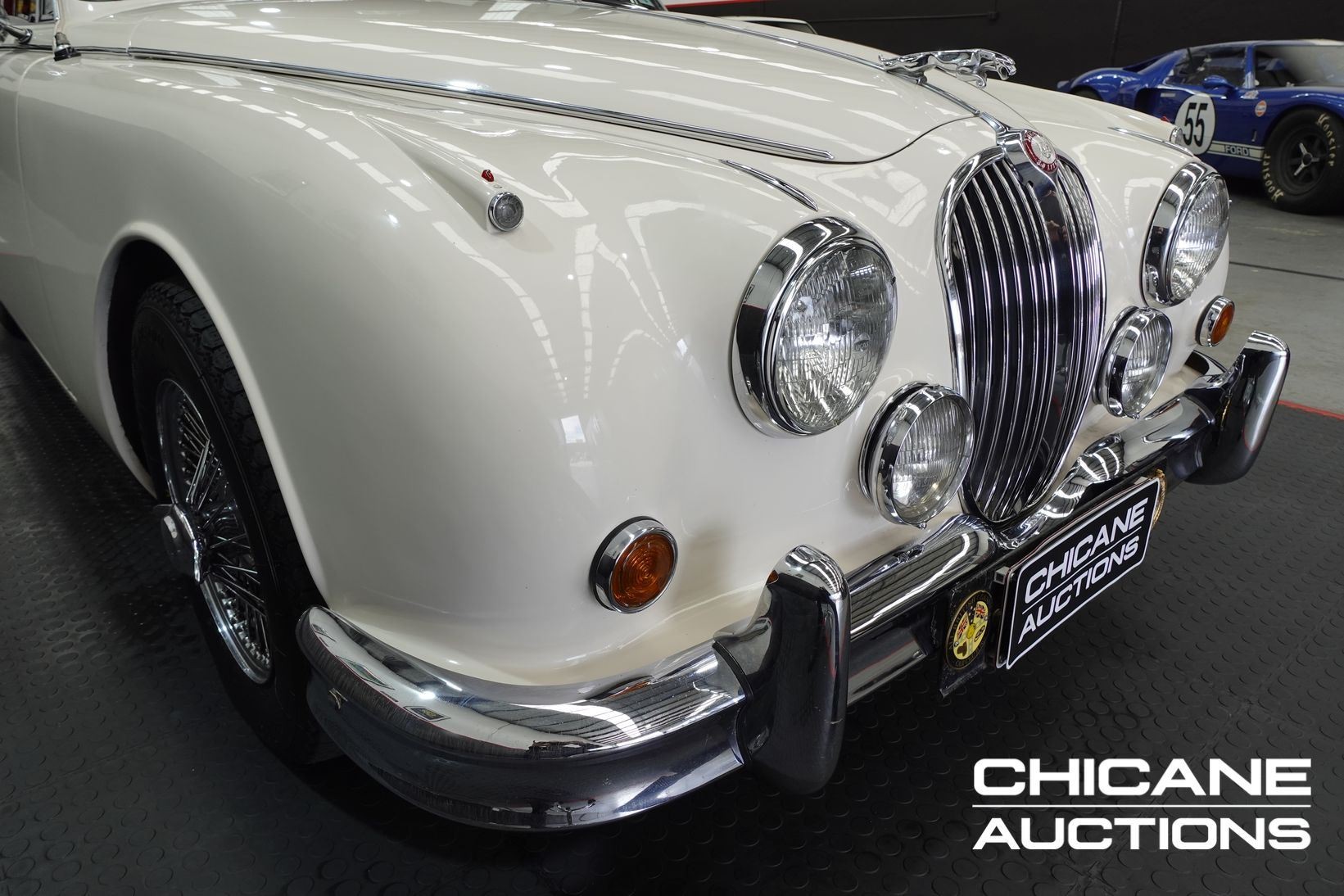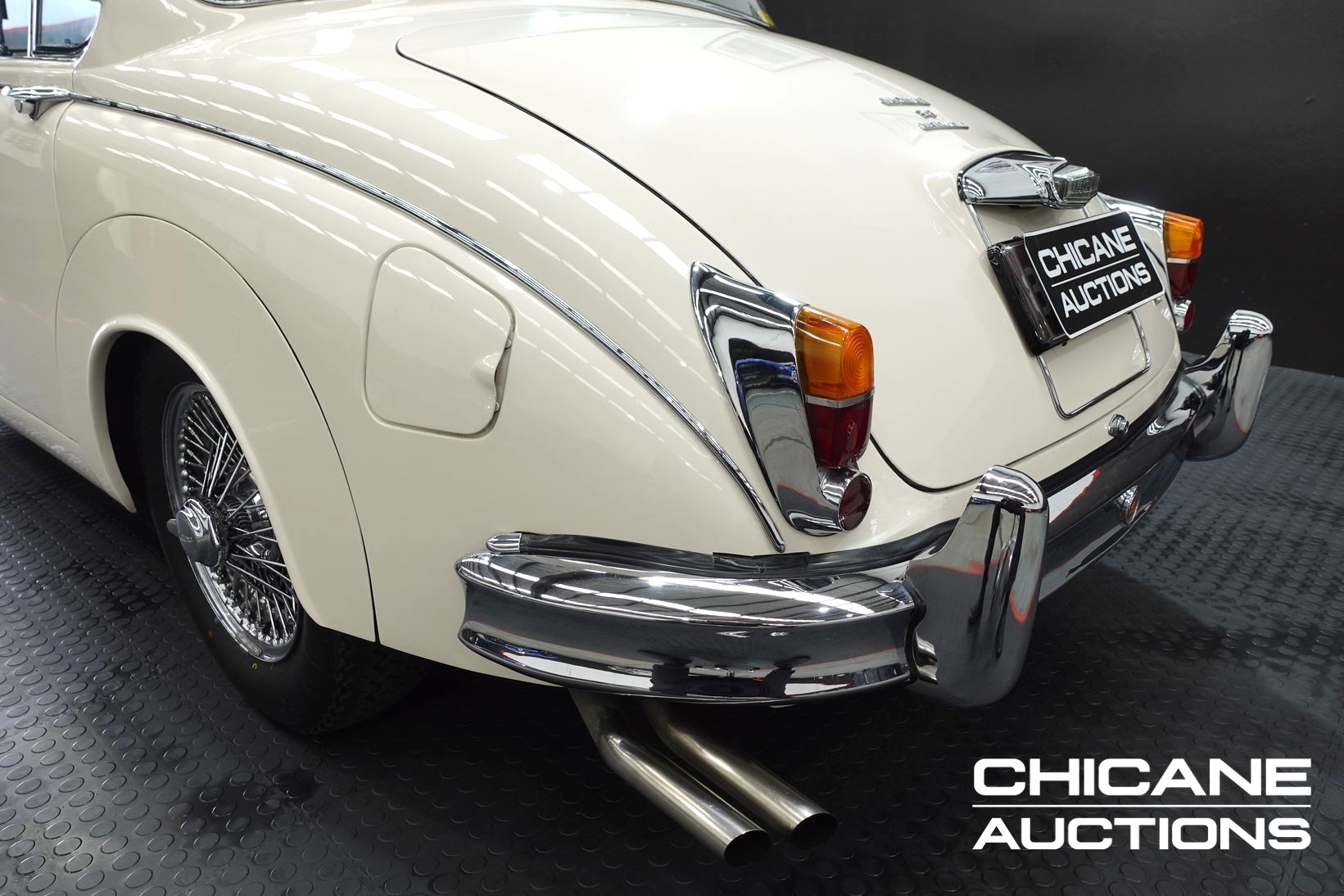 Finished in Old English White, the bodywork presents with crisp panel gaps and a deep lustrous paint finish. The chrome brightwork, including the iconic Jaguar grille, bumpers and window surrounds, gleams without pitting. Distinctive details such as the slim pillar design, rear spats, and elegant chrome wire wheels complete the picture of a quintessential early-1960s British sports saloon. Every aspect of the exterior restoration reflects both correctness and quality.
