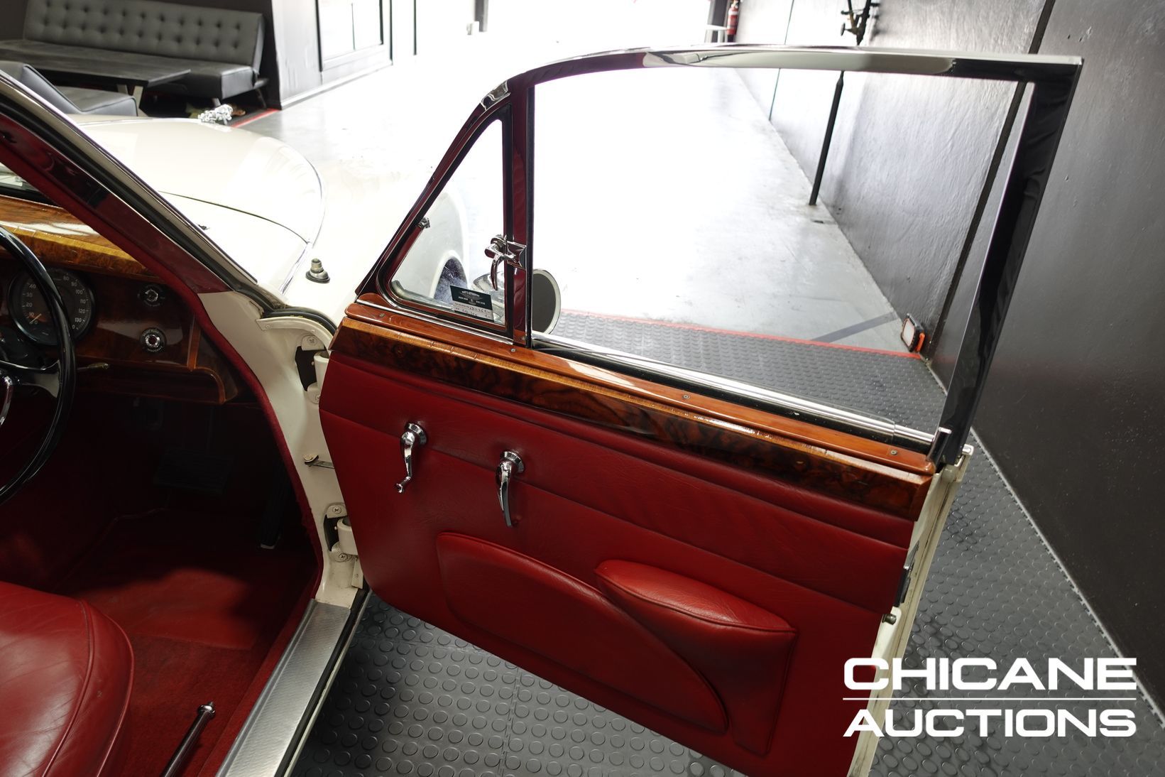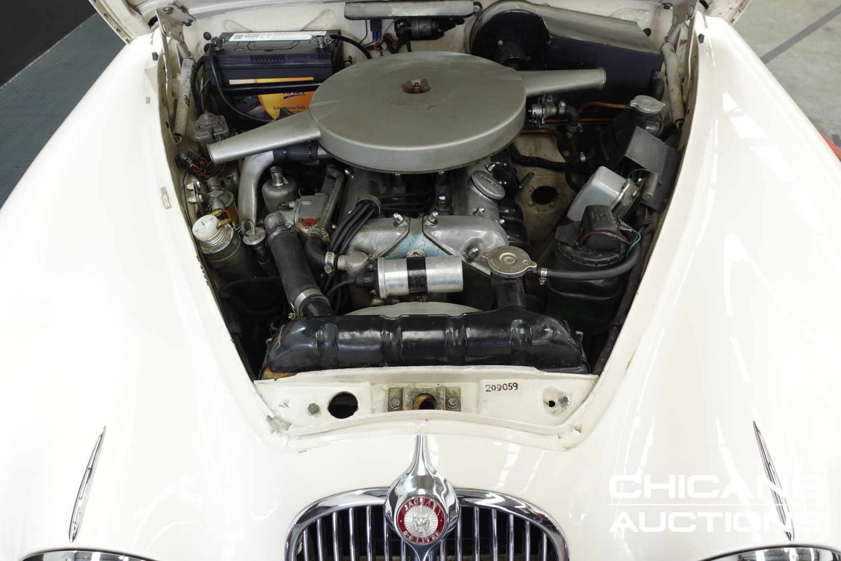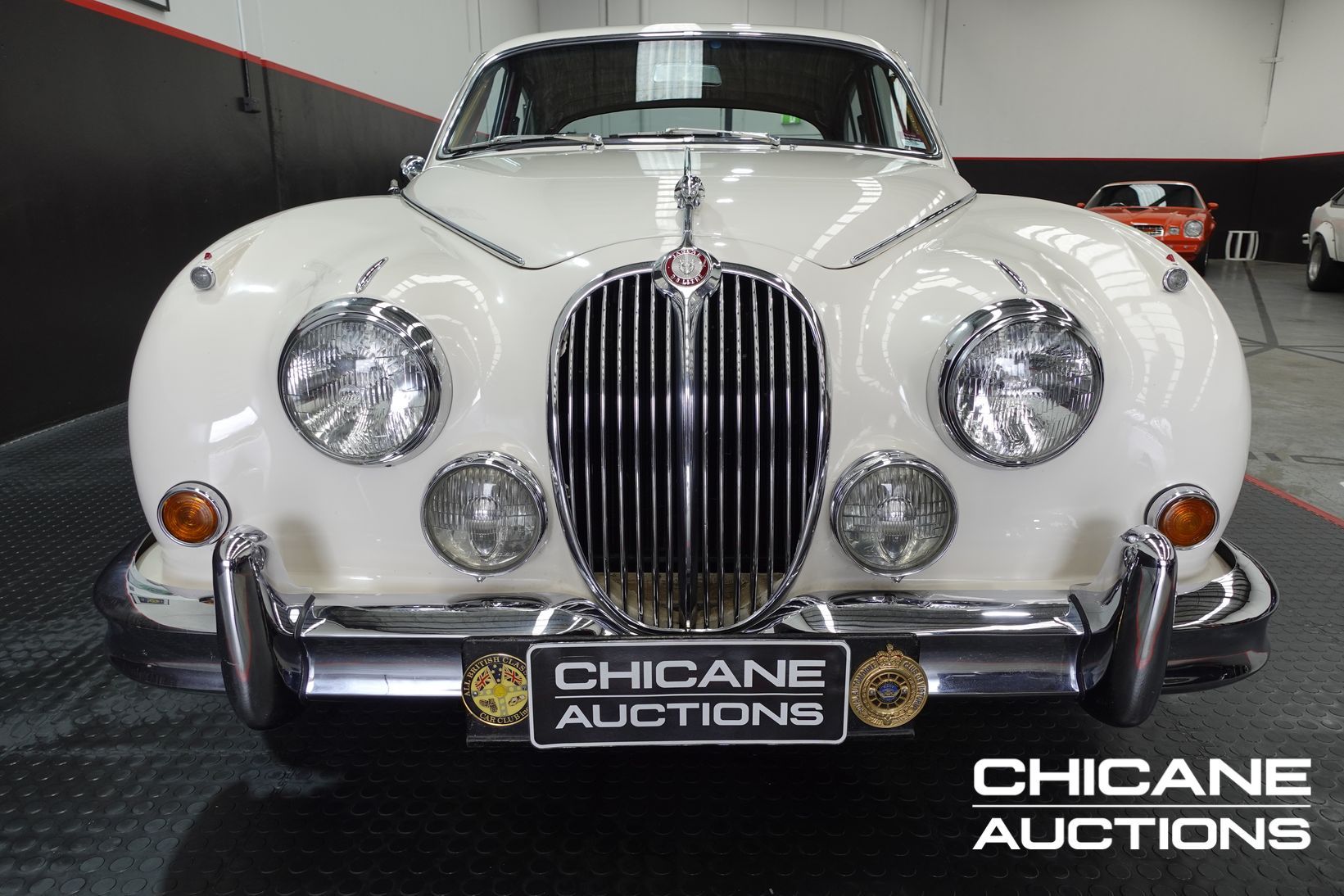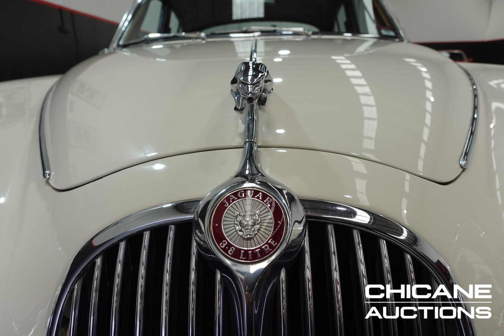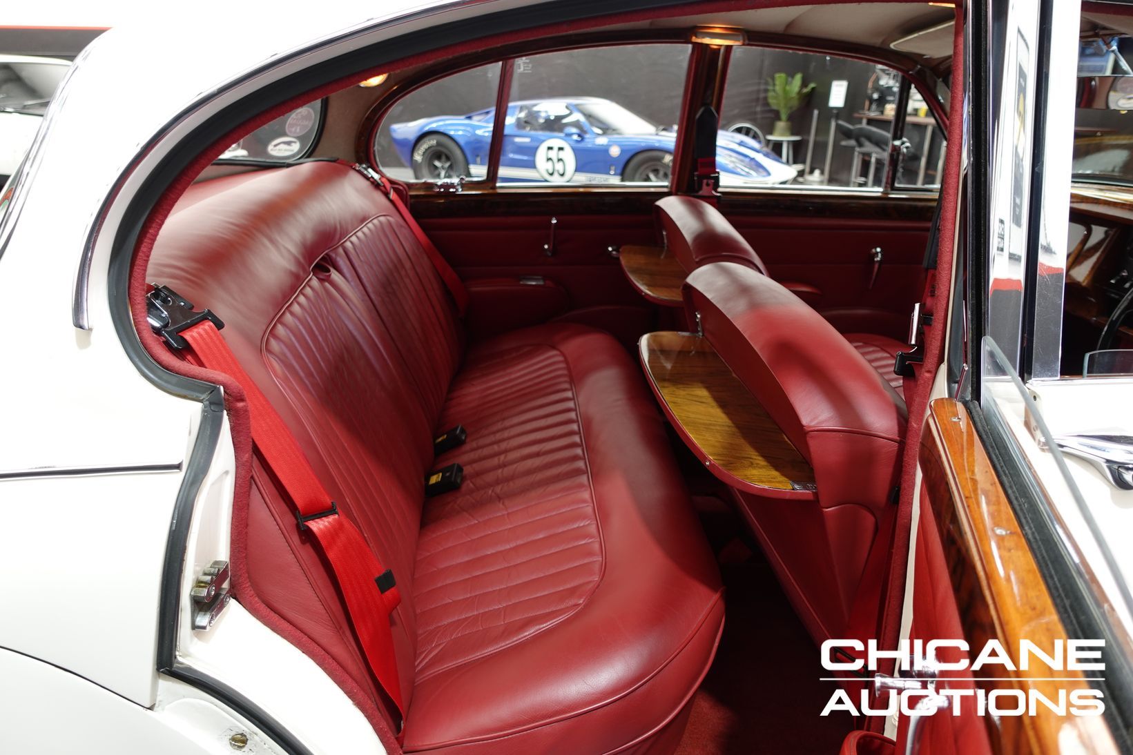 Finished in Old English White, the bodywork presents with crisp panel gaps and a deep lustrous paint finish. The chrome brightwork, including the iconic Jaguar grille, bumpers and window surrounds, gleams without pitting. Distinctive details such as the slim pillar design, rear spats, and elegant chrome wire wheels complete the picture of a quintessential early-1960s British sports saloon. Every aspect of the exterior restoration reflects both correctness and quality.