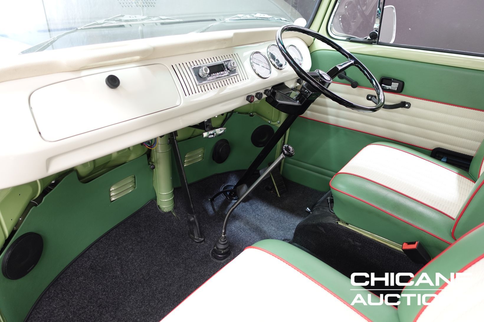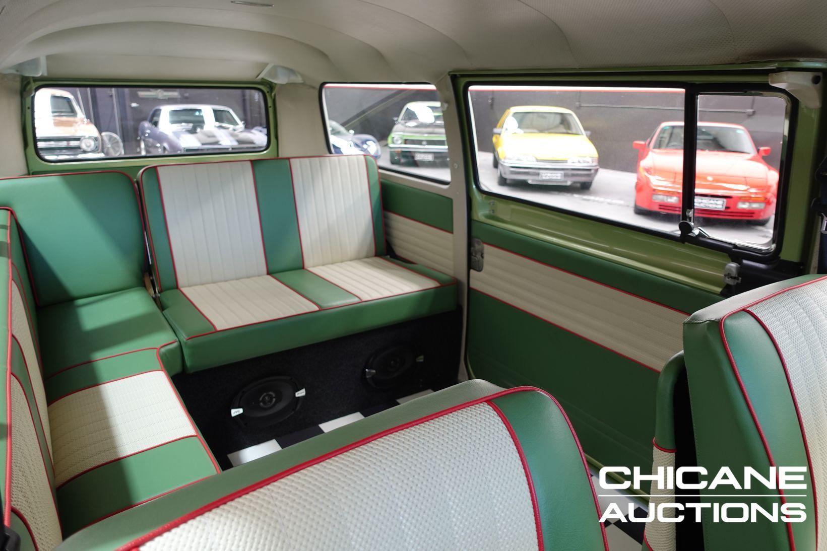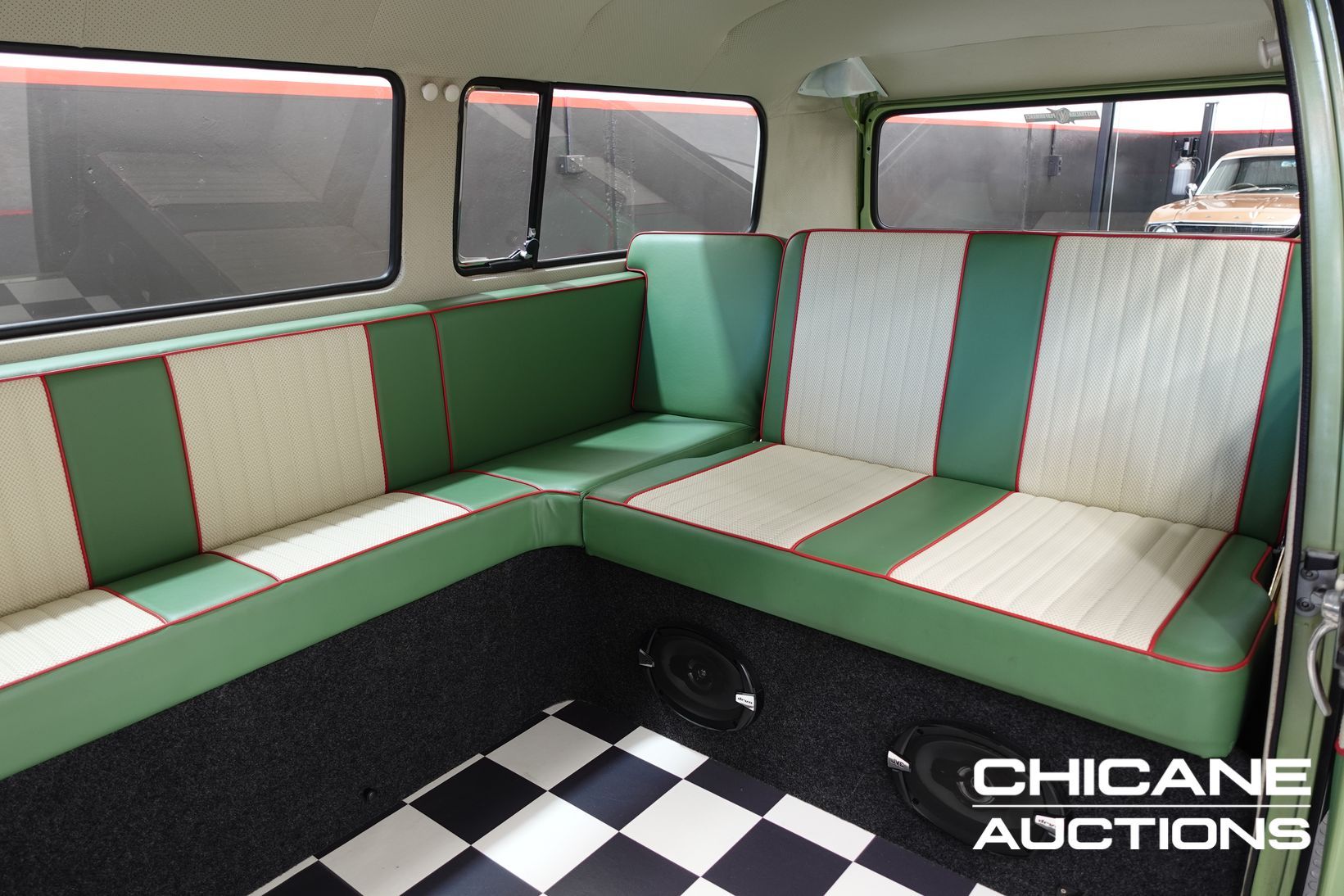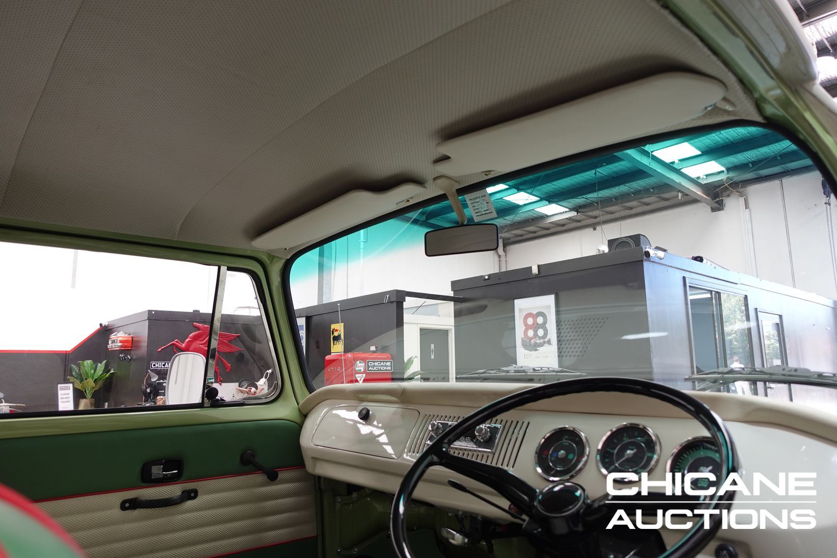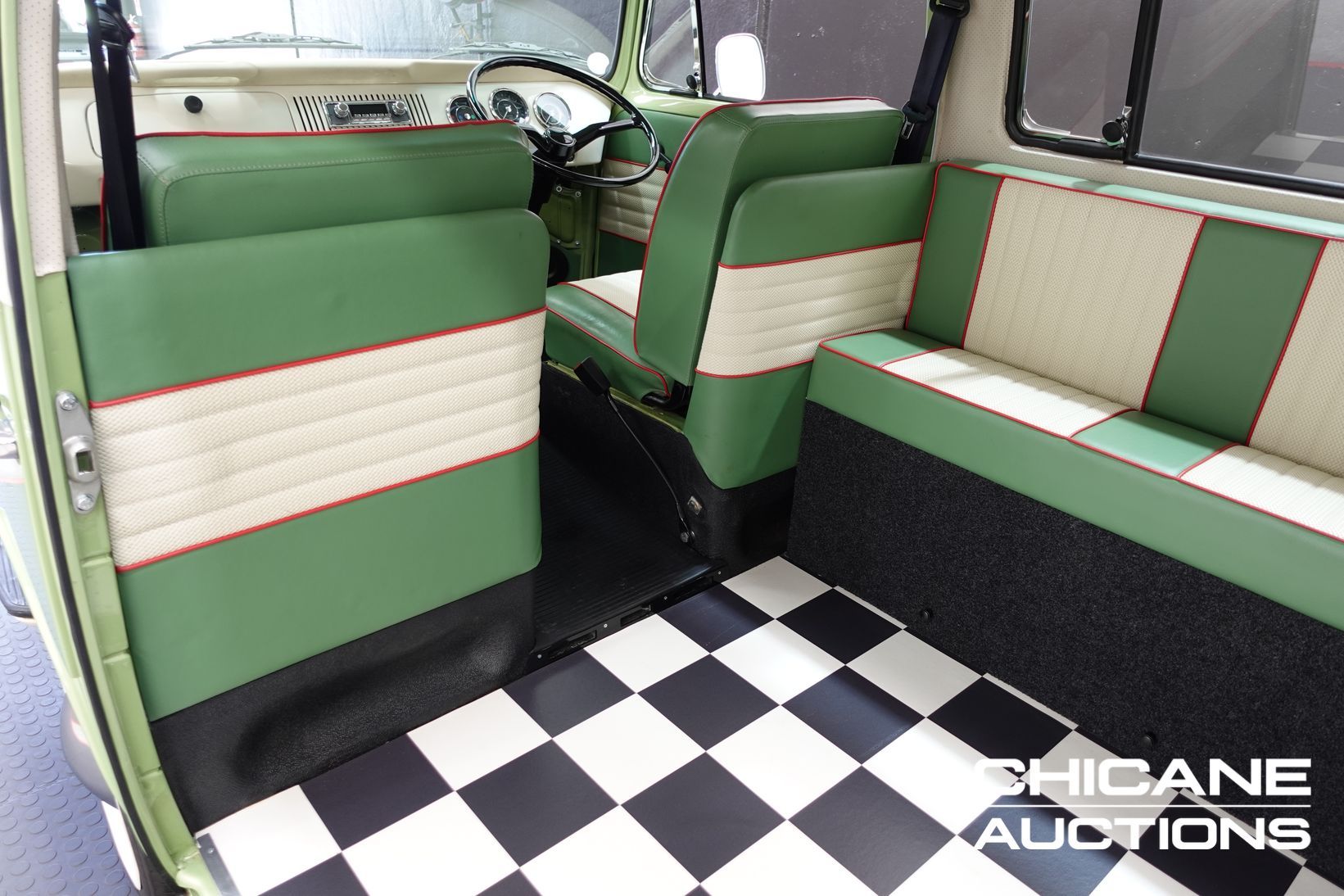 Inside, the Kombi reveals a magnificent, professionally crafted interior where every surface has been refinished to an exceptional standard. The ivory green over cream basket-weave upholstery with contrasting red piping delivers a stunning visual effect, setting a refined and warmly nostalgic tone throughout the cabin. This colour palette is beautifully complemented by the cream headlining and black-and-white chequered flooring, creating a bright, airy and inviting atmosphere.