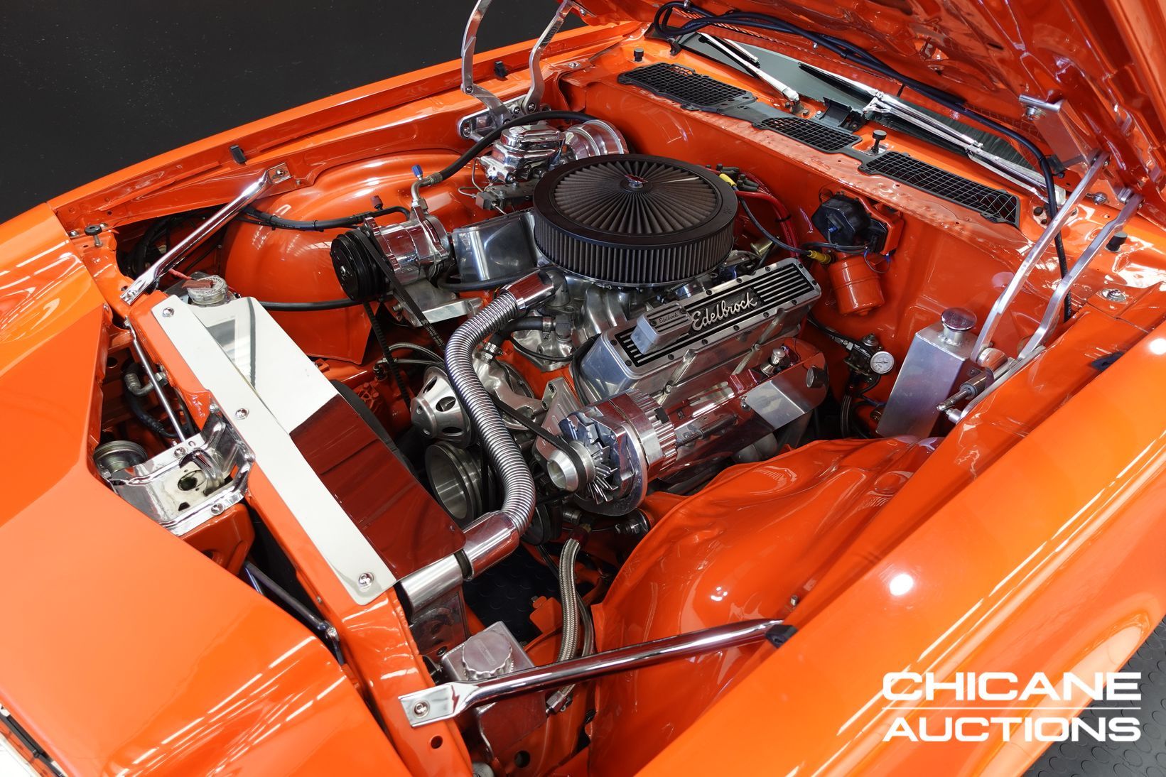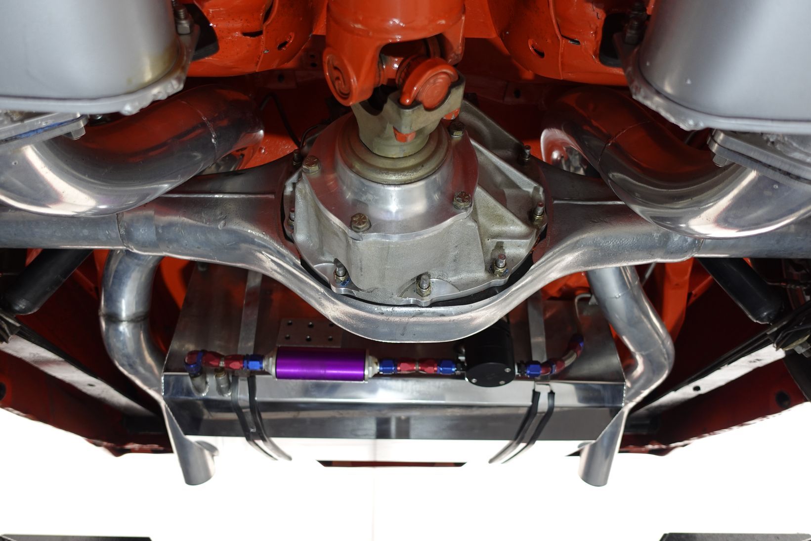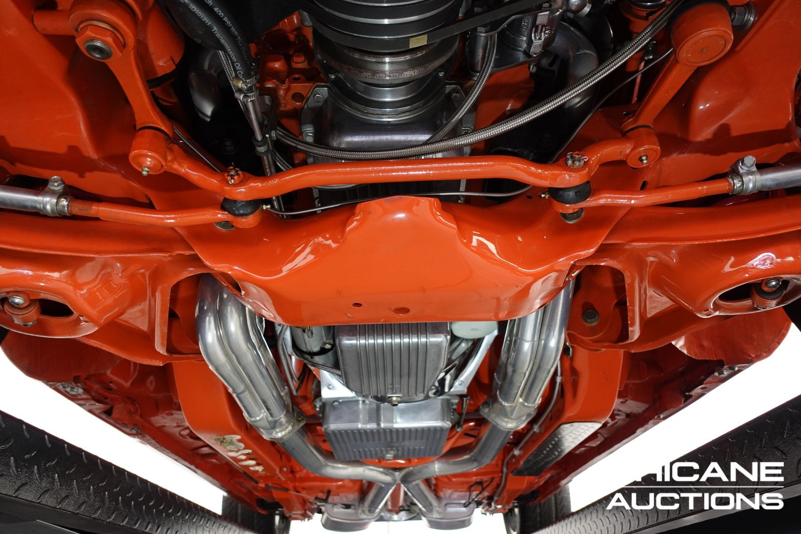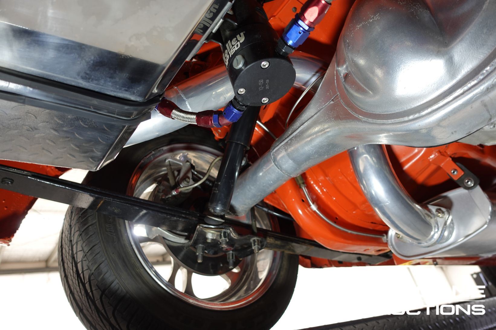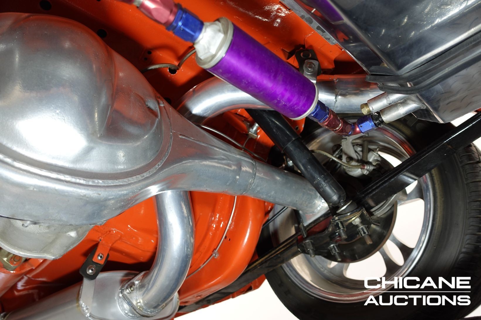Power comes from a stroked 383ci V8 fitted with high-quality internals and externals, all braided lines, and producing a claimed 500+ horsepower. Cooling is handled by a large alloy radiator with a temperature-controlled 16-inch Spal thermo fan and a separate Trans cooler. A built Turbo 400 automatic with stall converter sends power to a fully polished 9-inch limited-slip differential, while four-wheel disc brakes with braided lines provide strong stopping power. The fuel system features a large chromed drop tank, braided lines, filters, fittings, and regulator, with exhaust gases exiting through custom ceramic-coated headers and a stainless steel twin system. The engine bay is presented like a jewellery case, with billet alloy, painted, or chromed components throughout, and the underside chassis finished to the same show standard.
