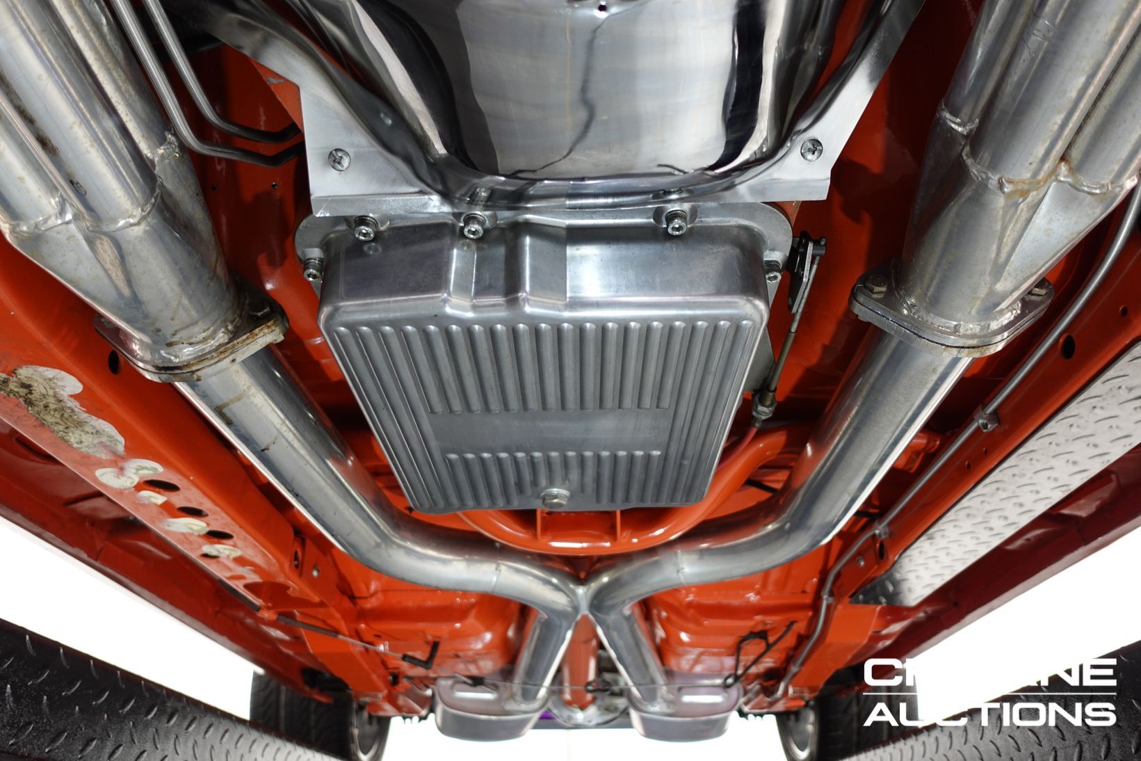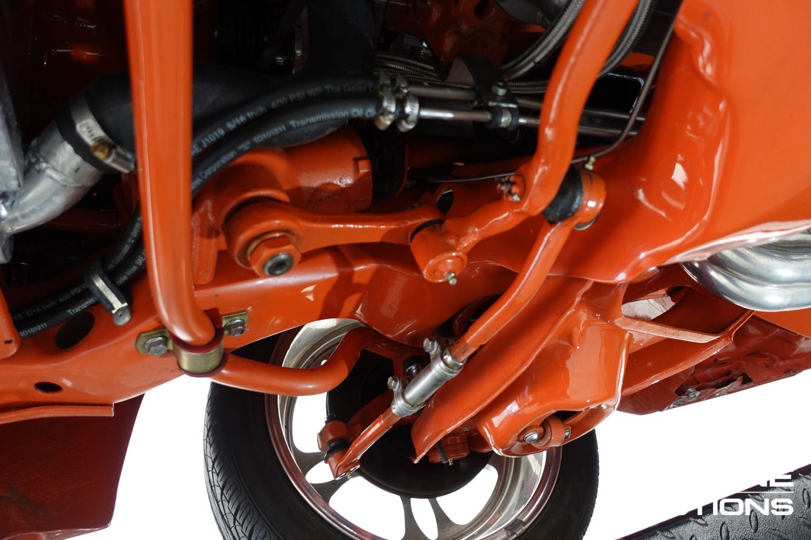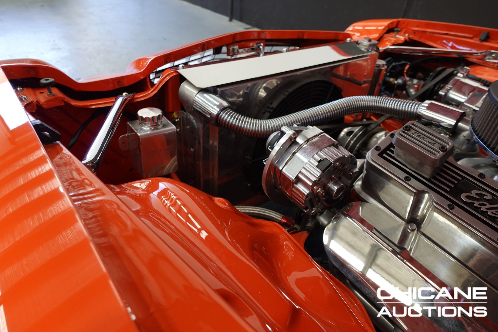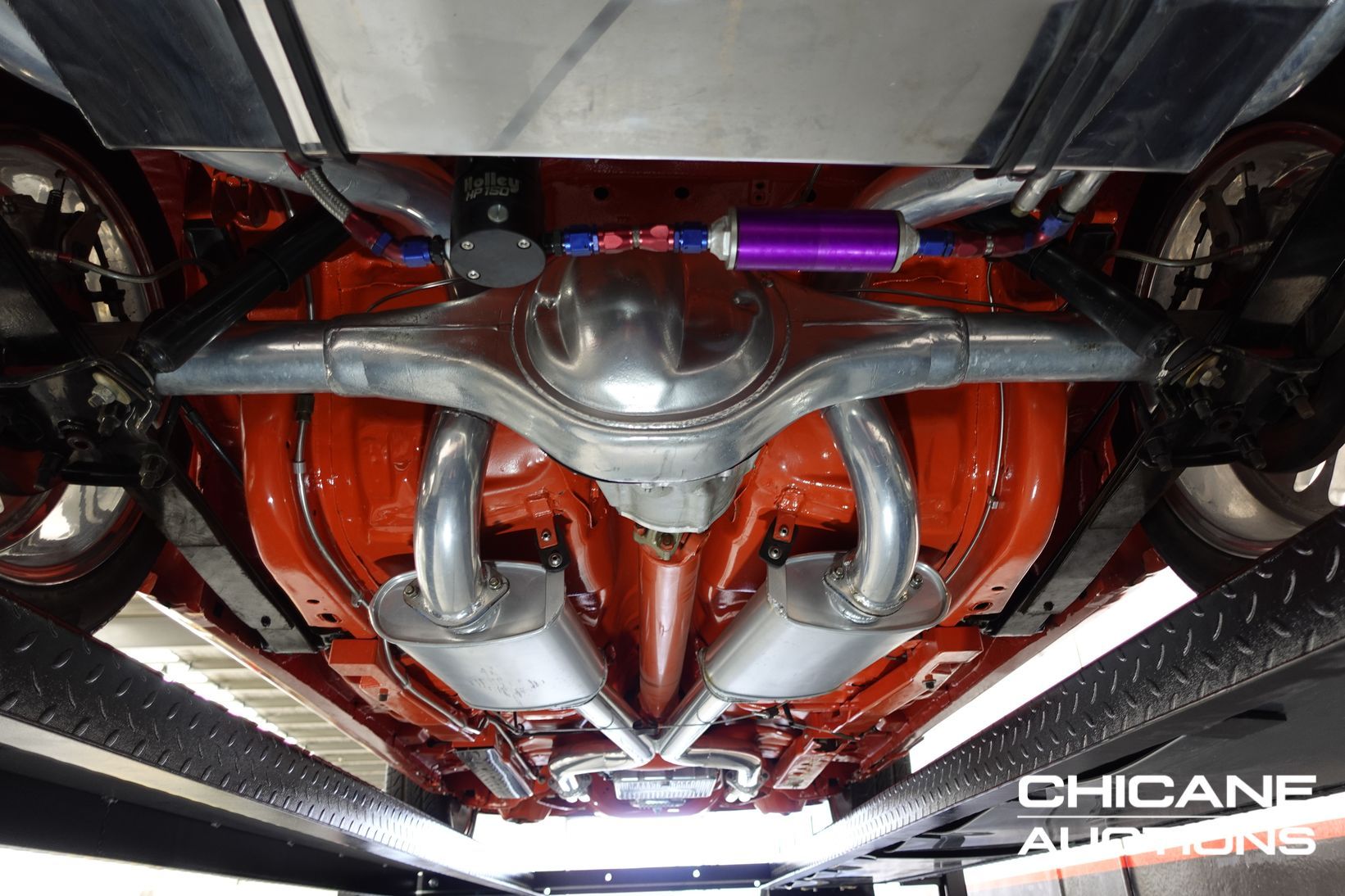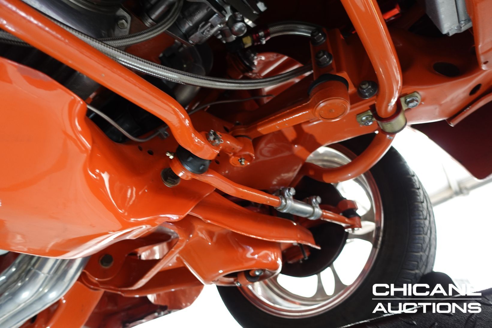 Power comes from a stroked 383ci V8 fitted with high-quality internals and externals, all braided lines, and producing a claimed 500+ horsepower. Cooling is handled by a large alloy radiator with a temperature-controlled 16-inch Spal thermo fan and a separate Trans cooler. A built Turbo 400 automatic with stall converter sends power to a fully polished 9-inch limited-slip differential, while four-wheel disc brakes with braided lines provide strong stopping power. The fuel system features a large chromed drop tank, braided lines, filters, fittings, and regulator, with exhaust gases exiting through custom ceramic-coated headers and a stainless steel twin system. The engine bay is presented like a jewellery case, with billet alloy, painted, or chromed components throughout, and the underside chassis finished to the same show standard.