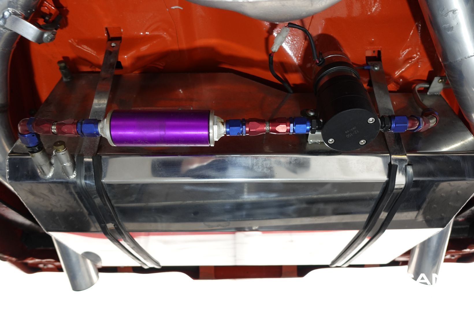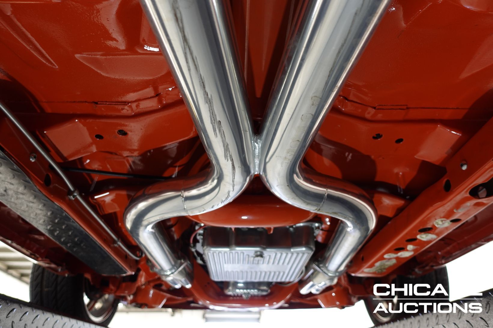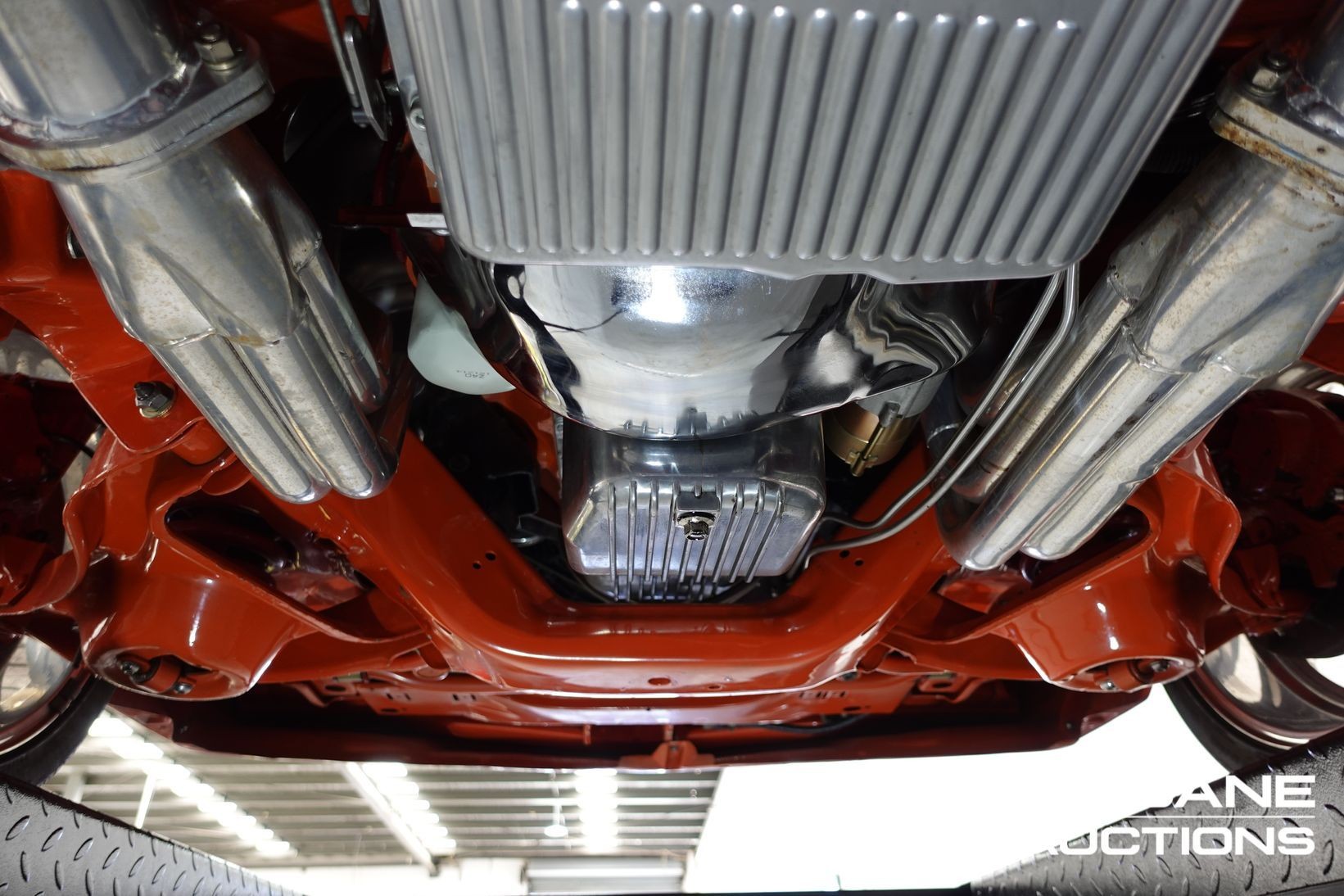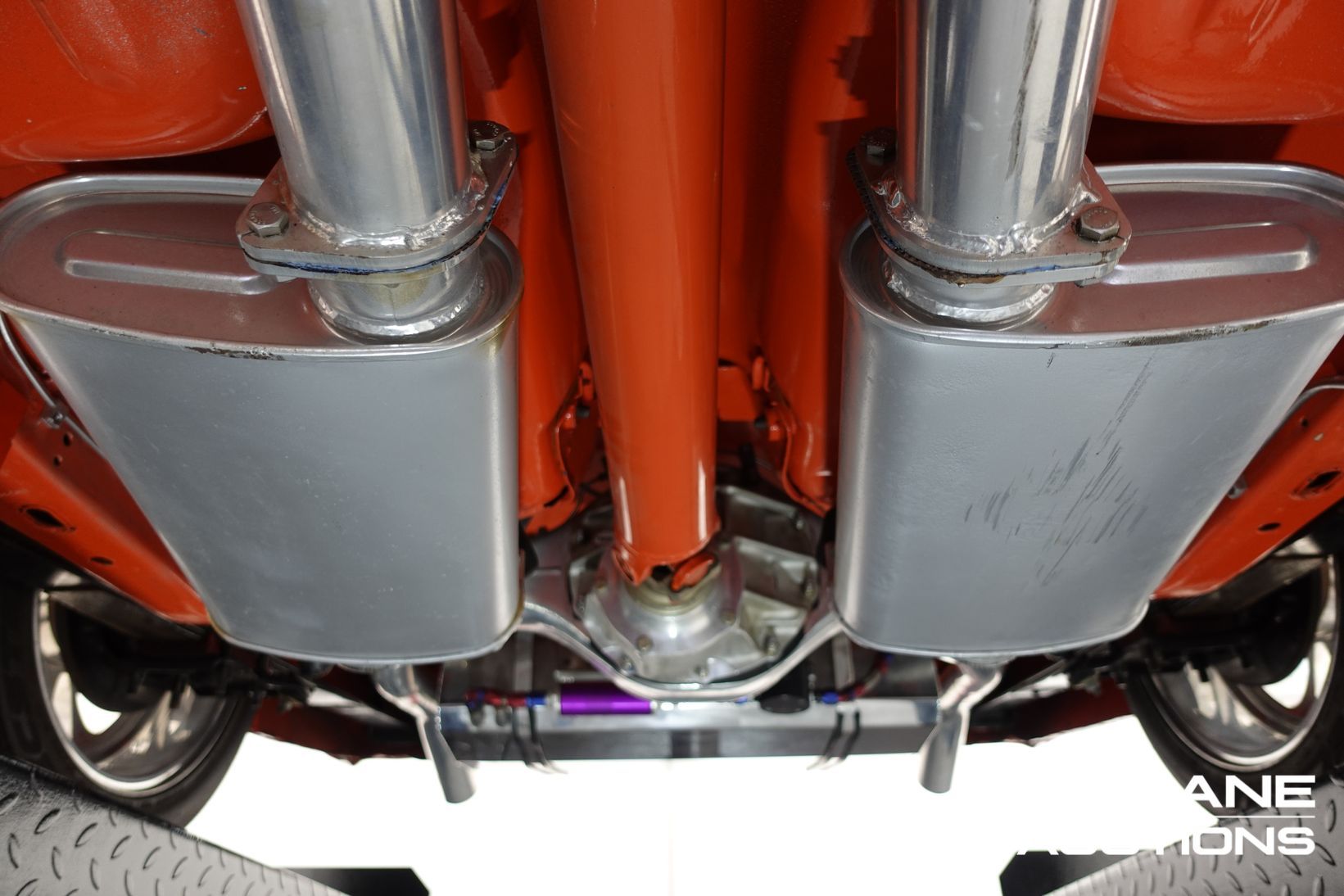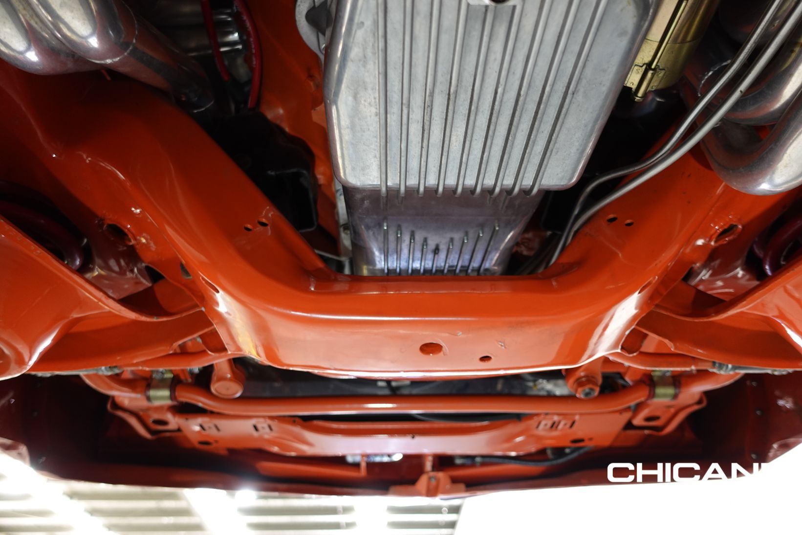 Power comes from a stroked 383ci V8 fitted with high-quality internals and externals, all braided lines, and producing a claimed 500+ horsepower. Cooling is handled by a large alloy radiator with a temperature-controlled 16-inch Spal thermo fan and a separate Trans cooler. A built Turbo 400 automatic with stall converter sends power to a fully polished 9-inch limited-slip differential, while four-wheel disc brakes with braided lines provide strong stopping power. The fuel system features a large chromed drop tank, braided lines, filters, fittings, and regulator, with exhaust gases exiting through custom ceramic-coated headers and a stainless steel twin system. The engine bay is presented like a jewellery case, with billet alloy, painted, or chromed components throughout, and the underside chassis finished to the same show standard.