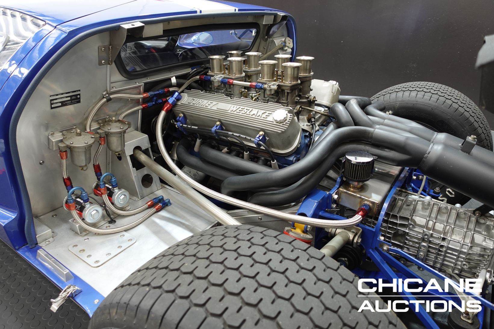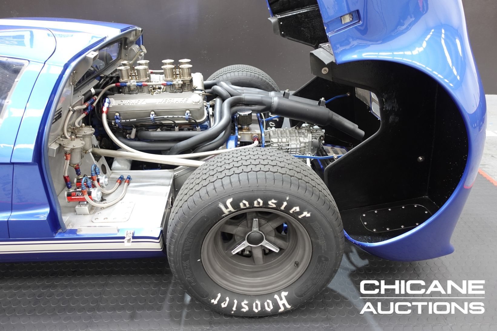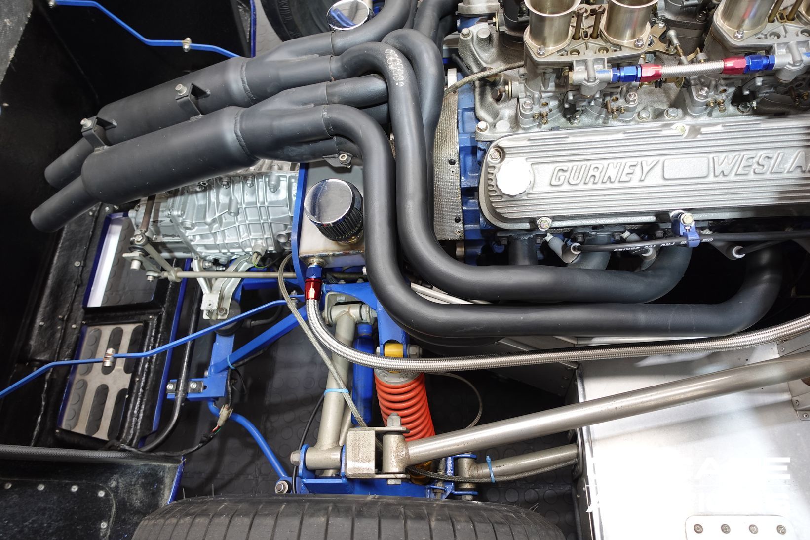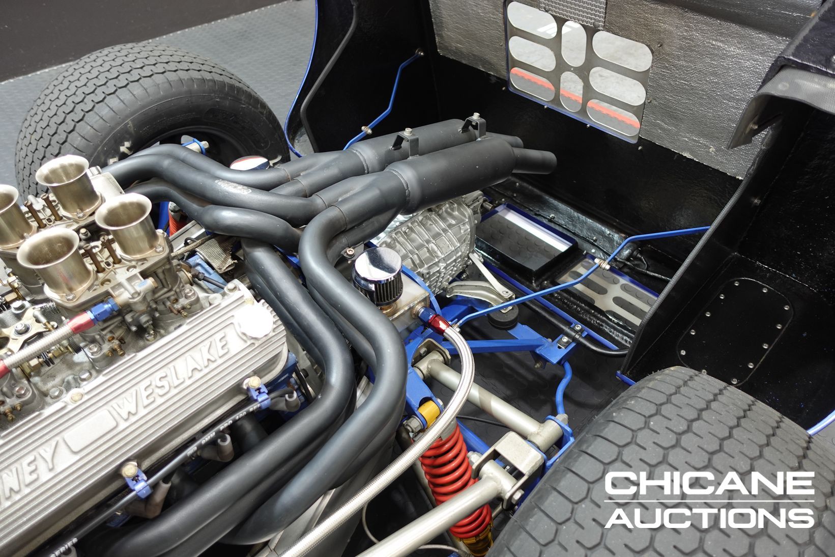 Power comes from a period-style Ford 302 cubic-inch Windsor V8, breathing through a quartet of Weber 48 IDA downdraft carburettors—just as the works GT40s of the 1960s did. The engine delivers both the induction roar and the performance expected of this legendary machine. A robust five-speed Renault UN1 transaxle channels the power to the rear wheels, ensuring strong performance and tractability. Stopping power is delivered by four-wheel disc brakes, completing a driveline package that stays faithful to the engineering ethos of the original.