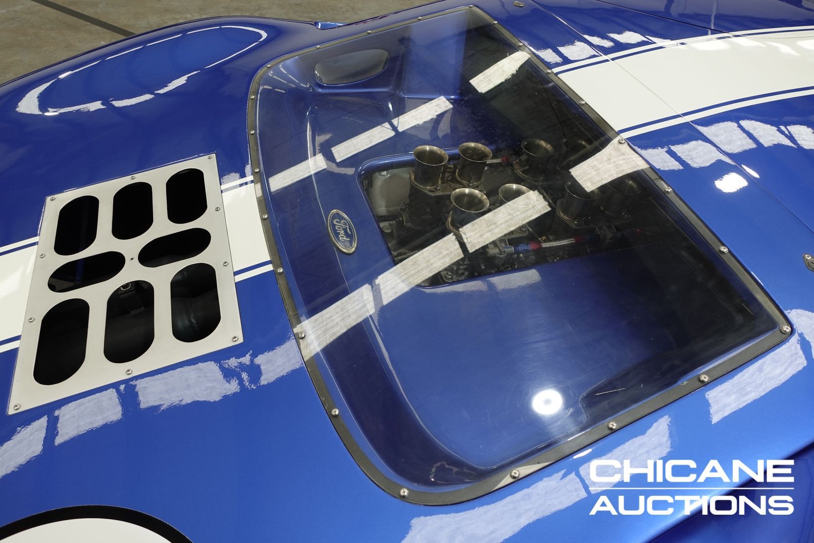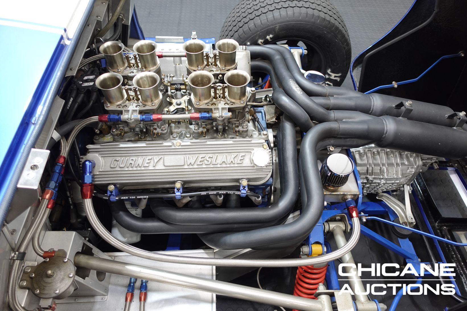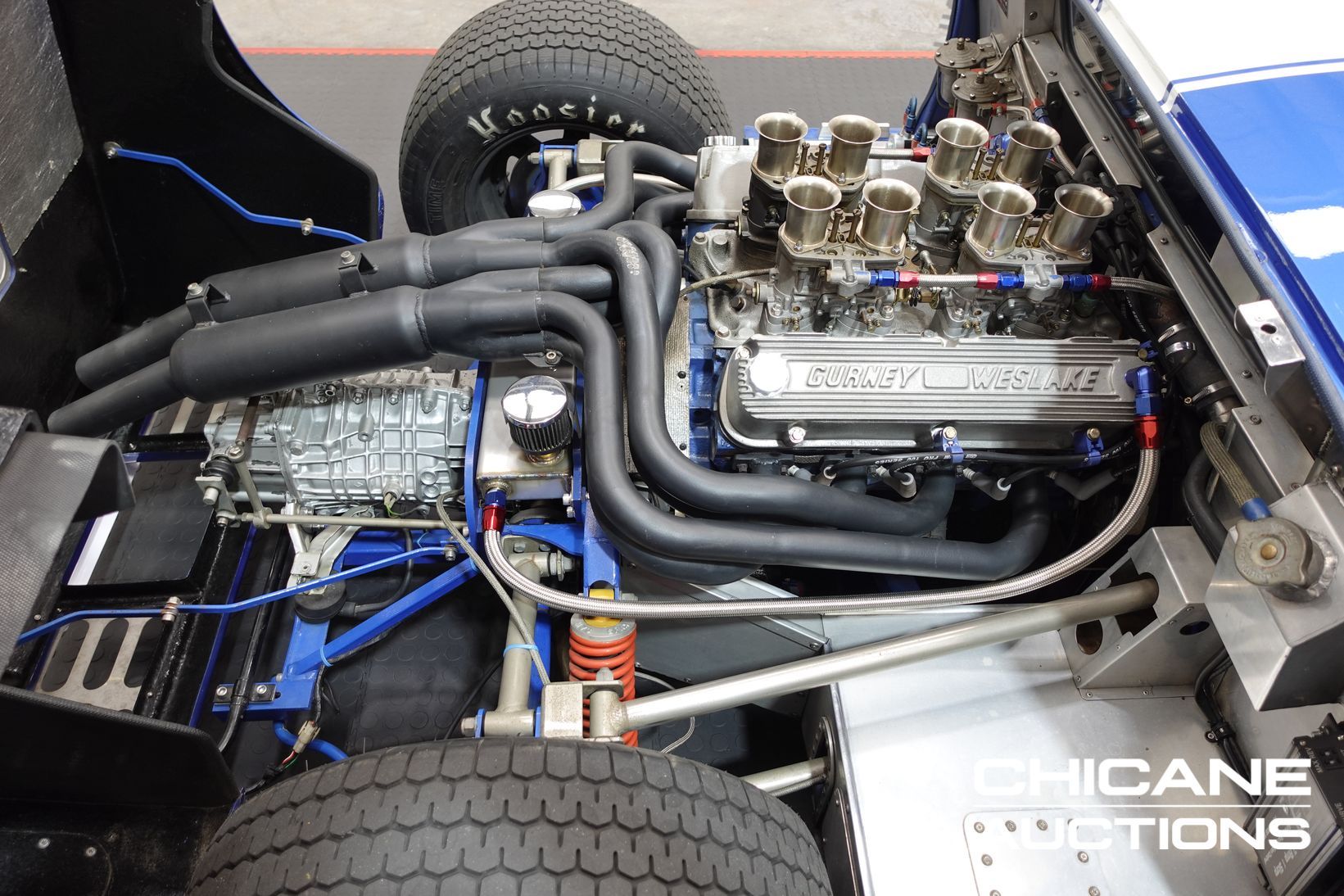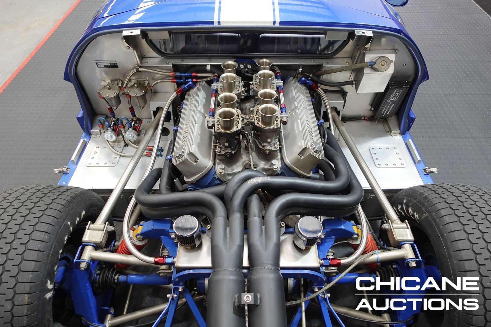 Power comes from a period-style Ford 302 cubic-inch Windsor V8, breathing through a quartet of Weber 48 IDA downdraft carburettors—just as the works GT40s of the 1960s did. The engine delivers both the induction roar and the performance expected of this legendary machine. A robust five-speed Renault UN1 transaxle channels the power to the rear wheels, ensuring strong performance and tractability. Stopping power is delivered by four-wheel disc brakes, completing a driveline package that stays faithful to the engineering ethos of the original.