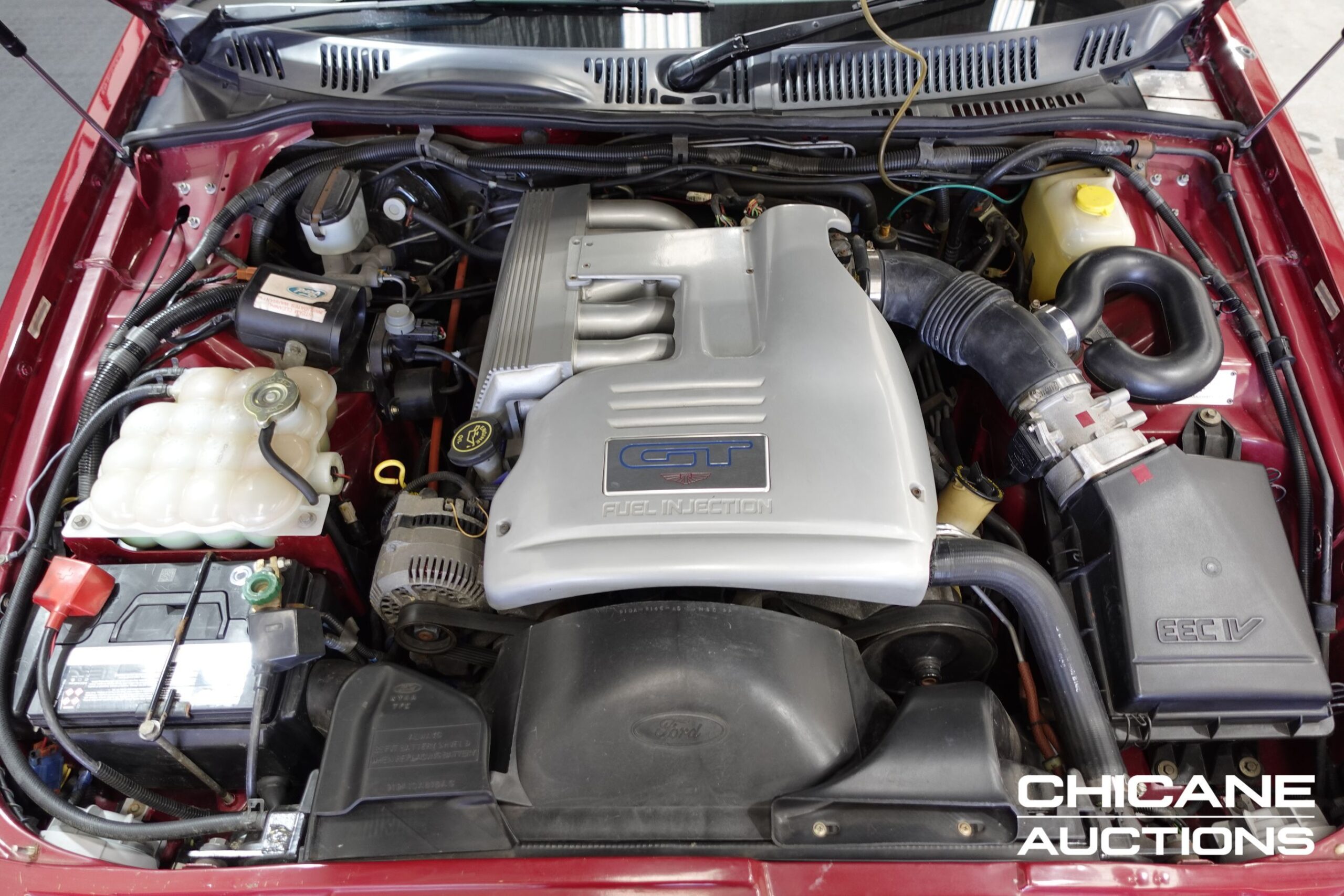 Finished in the model’s signature Cardinal Red, this EB GT presents nicely with all original paint. The styling was among the boldest of its era, with a Tickford-designed body kit that included a deep front spoiler, unique side skirts, flared guards, and a prominent rear wing.