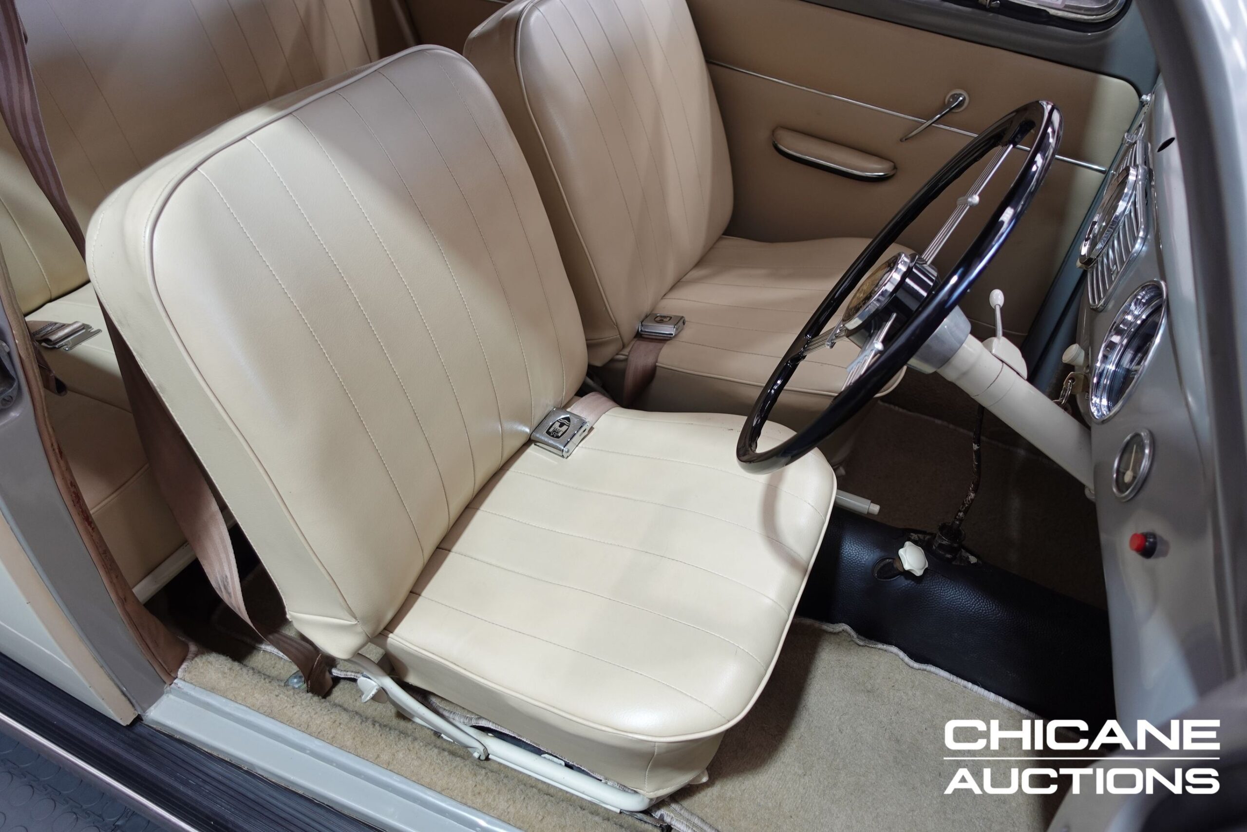The interior of the car is bright, clean, and includes cleverly styled items. Professionally upholstered in cream vinyl, the seats and door cards along with headlining and carpets present in very fine condition, with no major marks or wear visible. Rubbers and door seals have been replaced for a solid feel. The dashboard is finished in beige grey and retains the correct gauge cluster and interior chrome detailing, all of which presents with a soft shine and minimal signs of age.