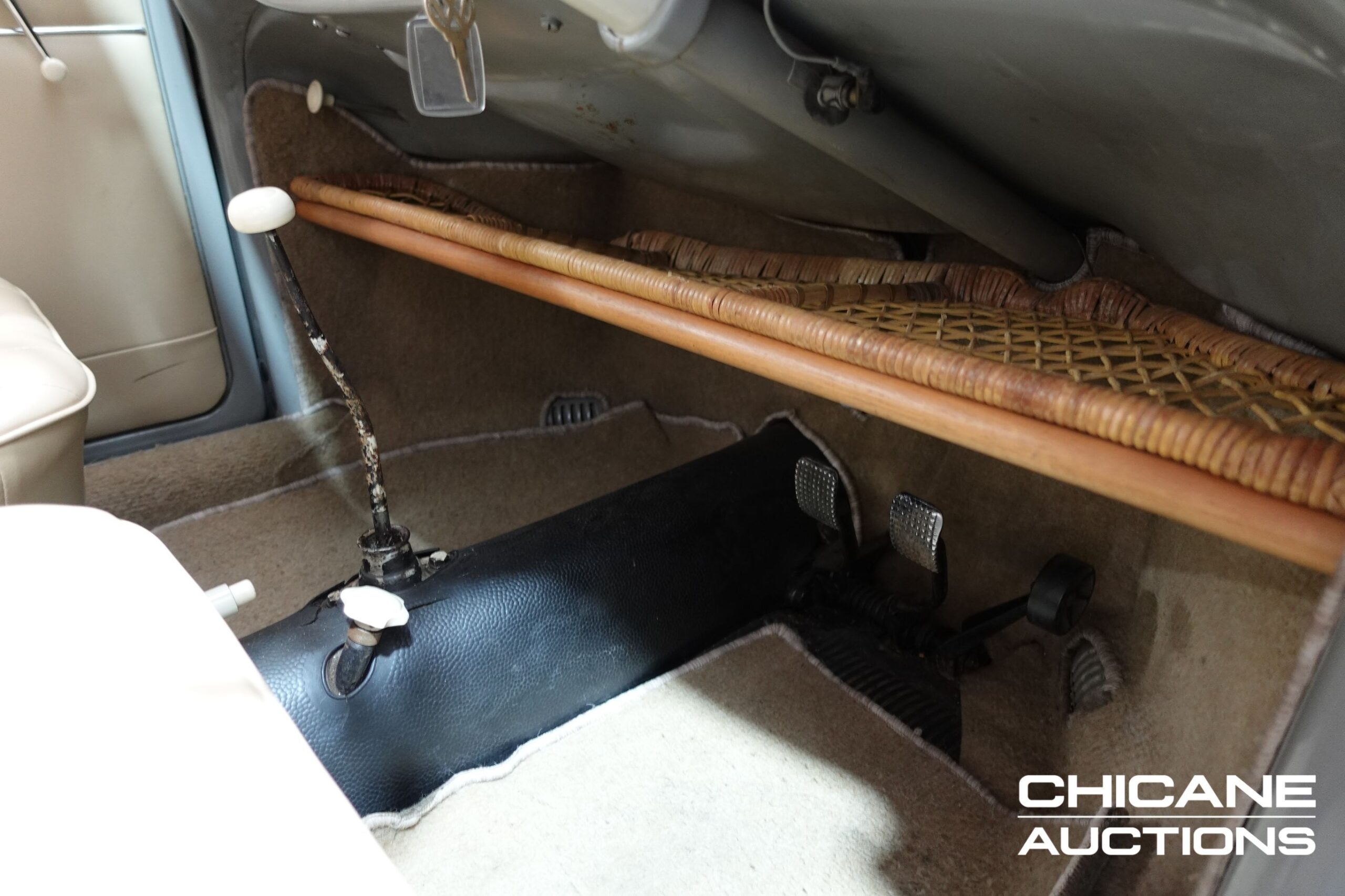 Instrumentation is clear, functional, and correct for the model year, with no aftermarket modifications detracting from the factory look. Added additions of a wicker dash shelf and fantastic little Venetian blind for the rear window add character. The feel of the cabin is both welcoming and authentic, combining 1950s simplicity with thoughtful preservation.