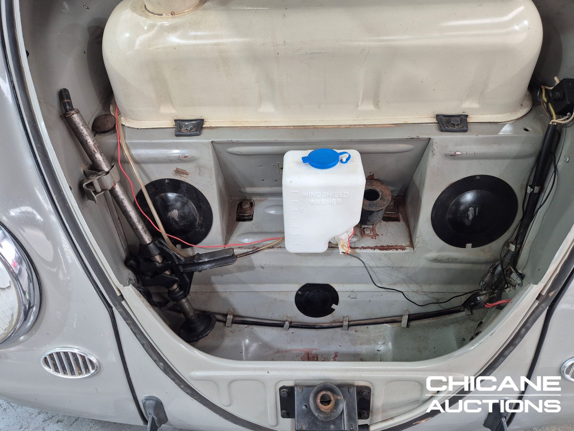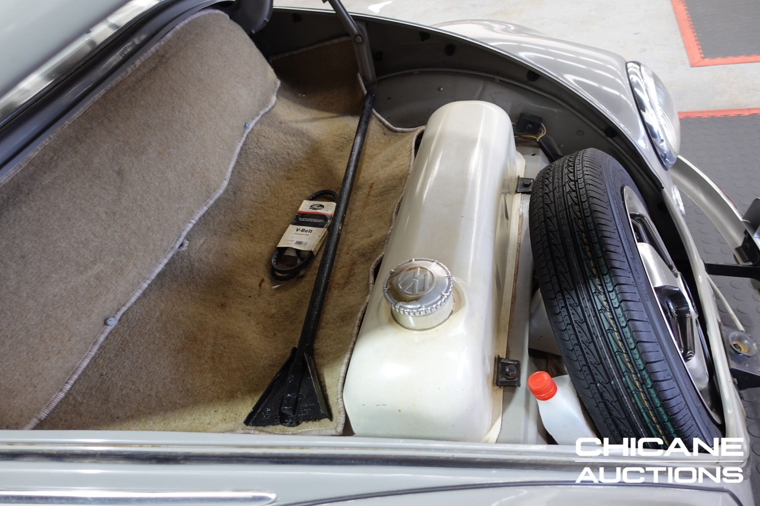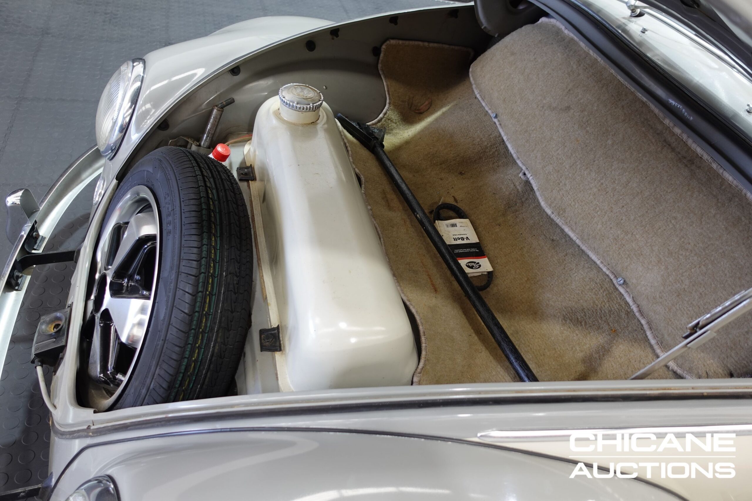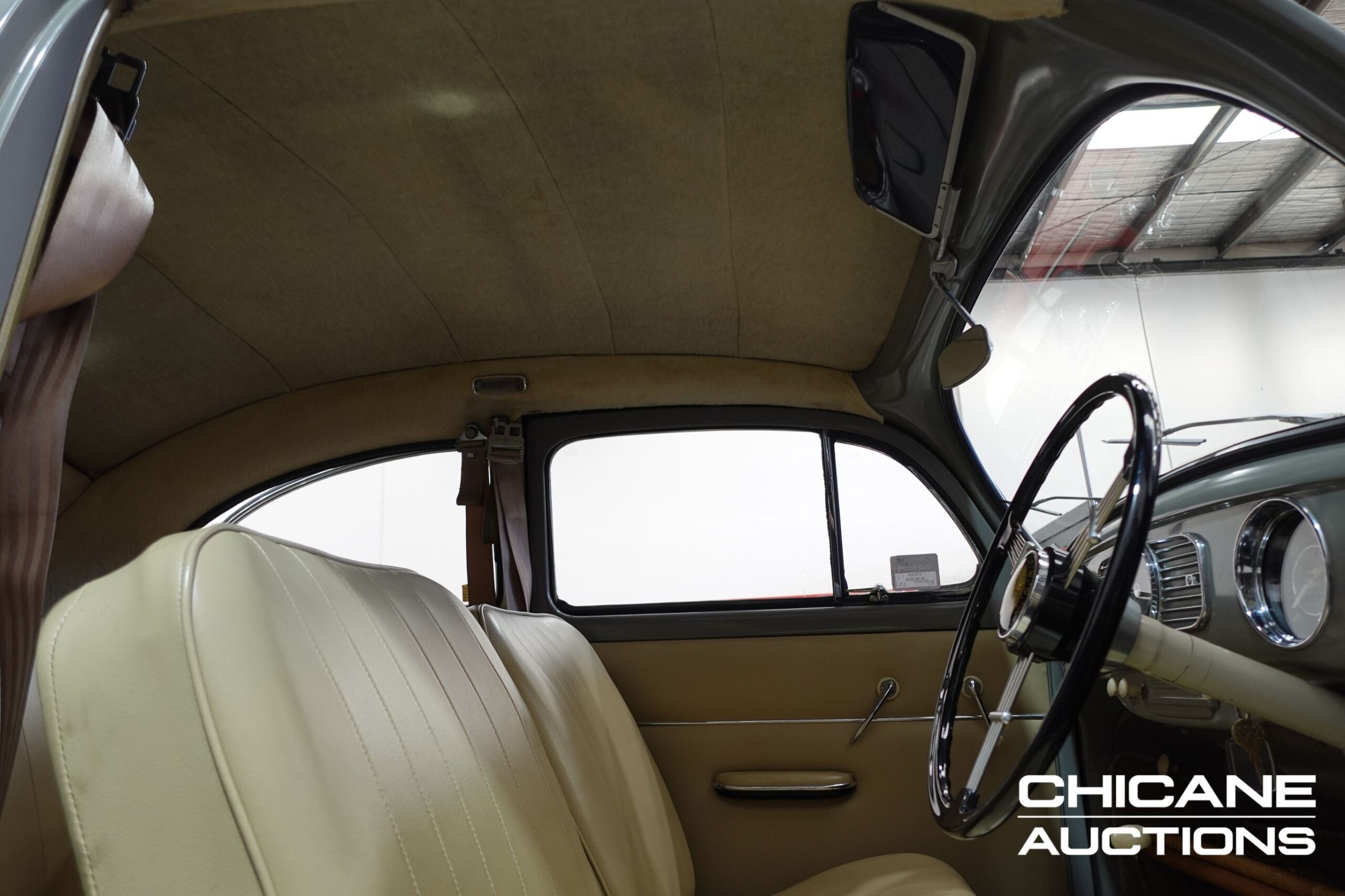 Finished in Beige Grey over Savannah Beige, this Beetle’s paintwork has a mild weathered patina that enhances its vintage character. The body panels are straight, panel fitment is good, and the overall appearance is honest and inviting. The Floor pans are very clean with no signs of rust. Chrome bumpers, window trims, and lighting bezels remain bright and in good order, with only light wear consistent with use.