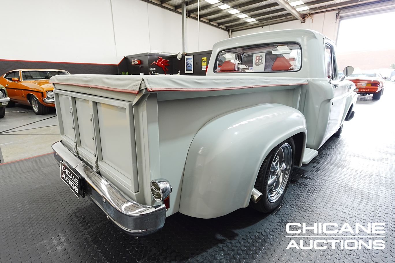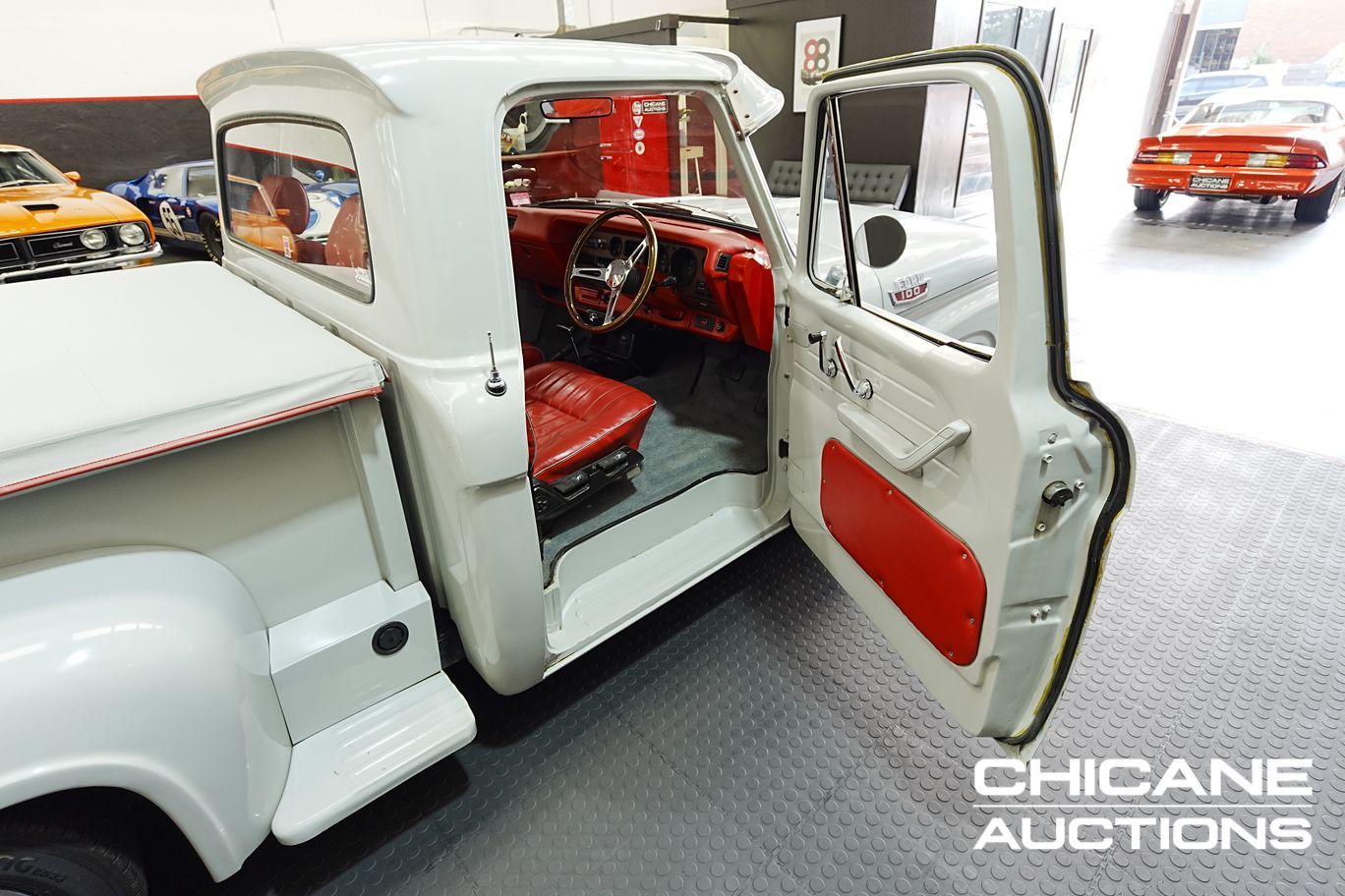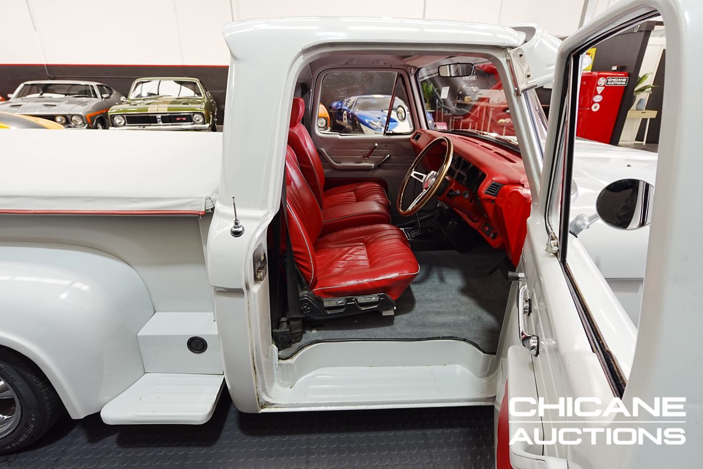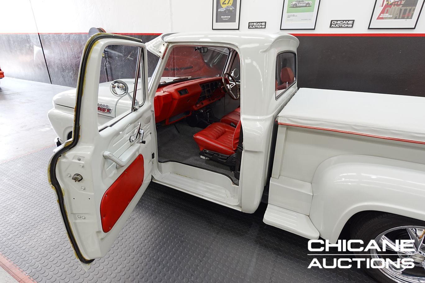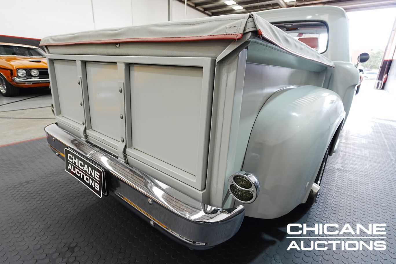 Offered is this fantastic old-school custom 61 F100 Custom that blends a more modern Holden HZ 1-Tonner chassis with the iconic Ford F100 cab and side-step tub, all professionally engineered and certified as a Modified Production Vehicle. Under the bonnet, the Holden 308ci V8 is paired with a Turbo 350 automatic and 10 bolt diff. Inside, the bright red custom trim features bucket seats, full instrumentation and a JVC sound system, while the exterior adds practicality with a lockable hard lid and drop-down tailgate.