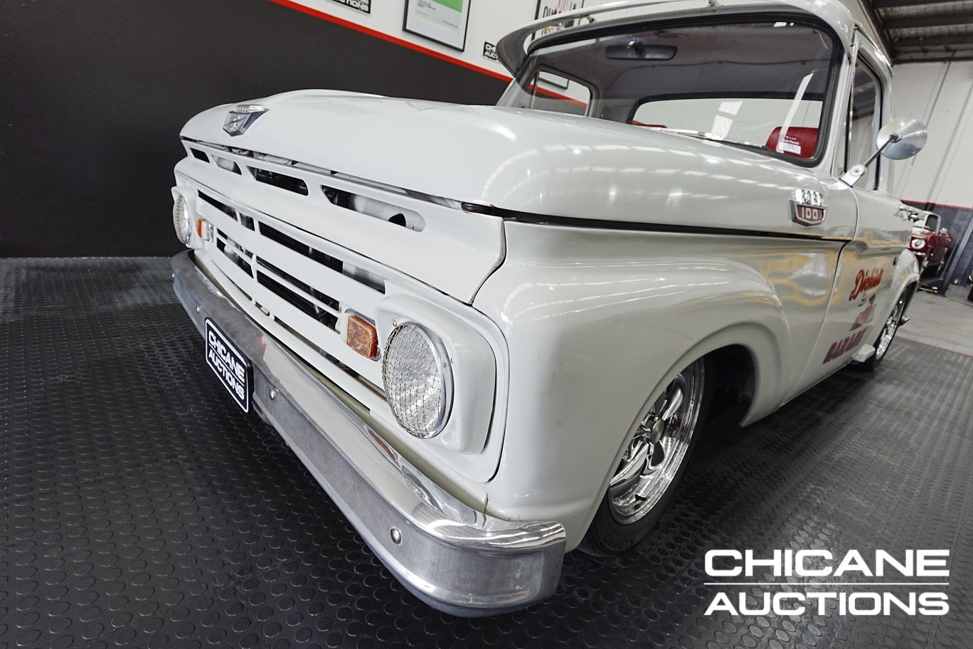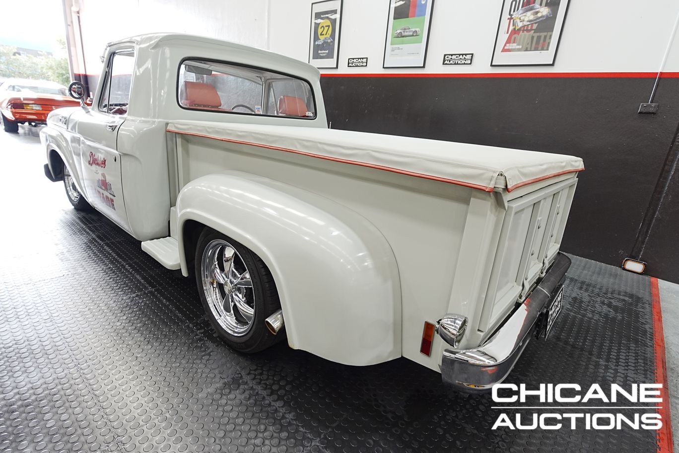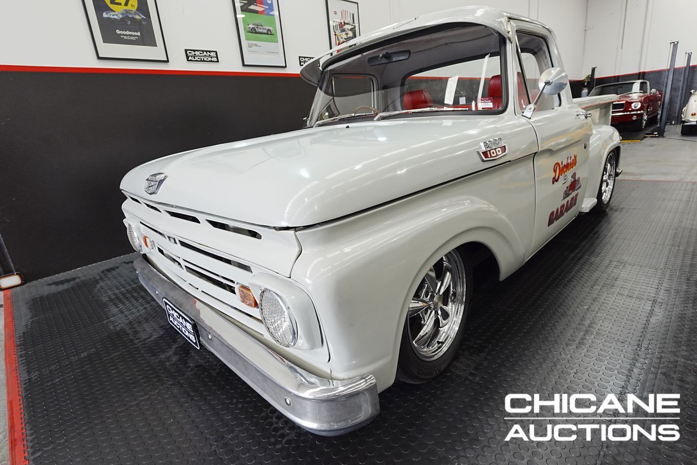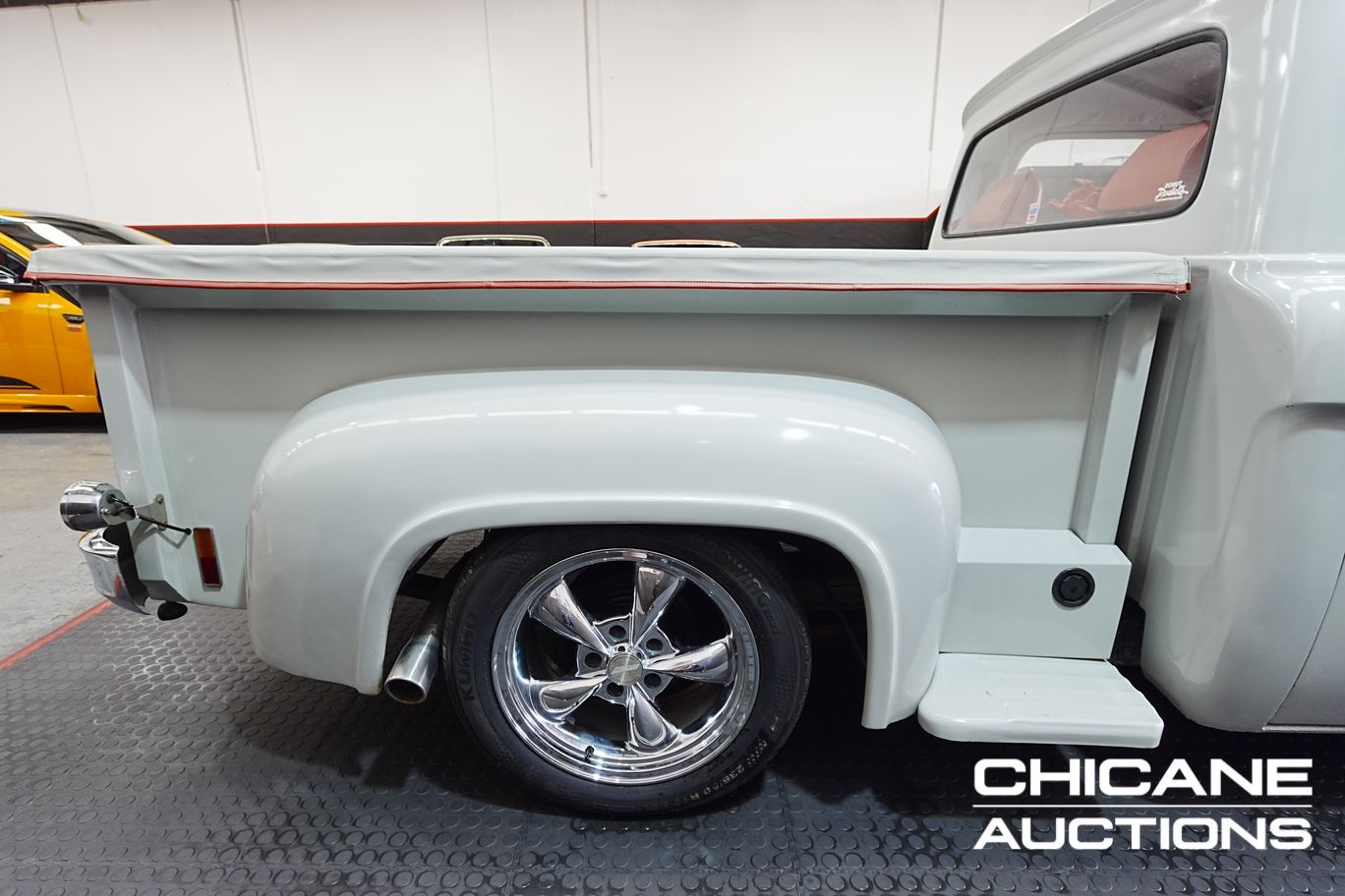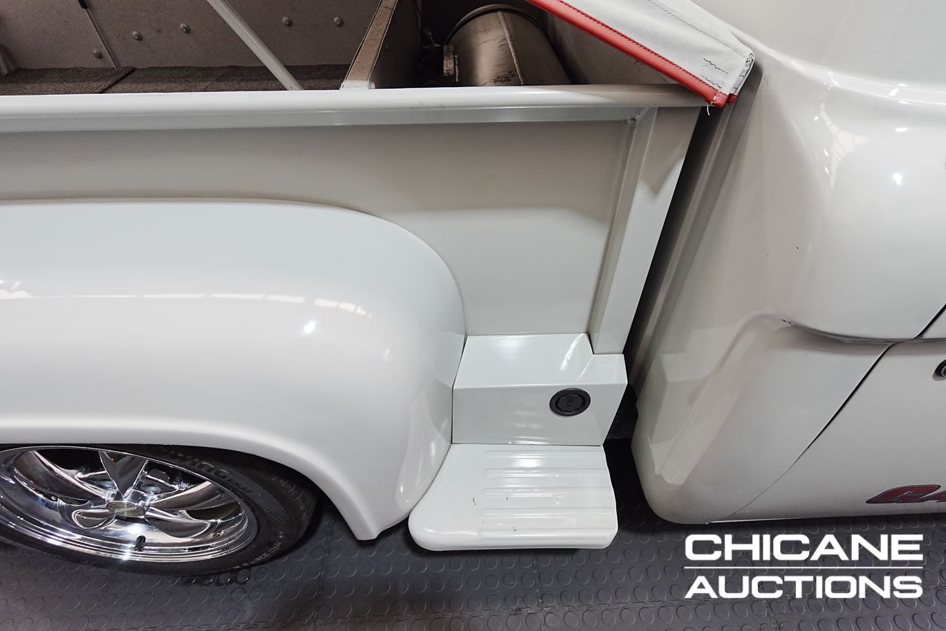 Offered is this fantastic old-school custom 61 F100 Custom that blends a more modern Holden HZ 1-Tonner chassis with the iconic Ford F100 cab and side-step tub, all professionally engineered and certified as a Modified Production Vehicle. Under the bonnet, the Holden 308ci V8 is paired with a Turbo 350 automatic and 10 bolt diff. Inside, the bright red custom trim features bucket seats, full instrumentation and a JVC sound system, while the exterior adds practicality with a lockable hard lid and drop-down tailgate.