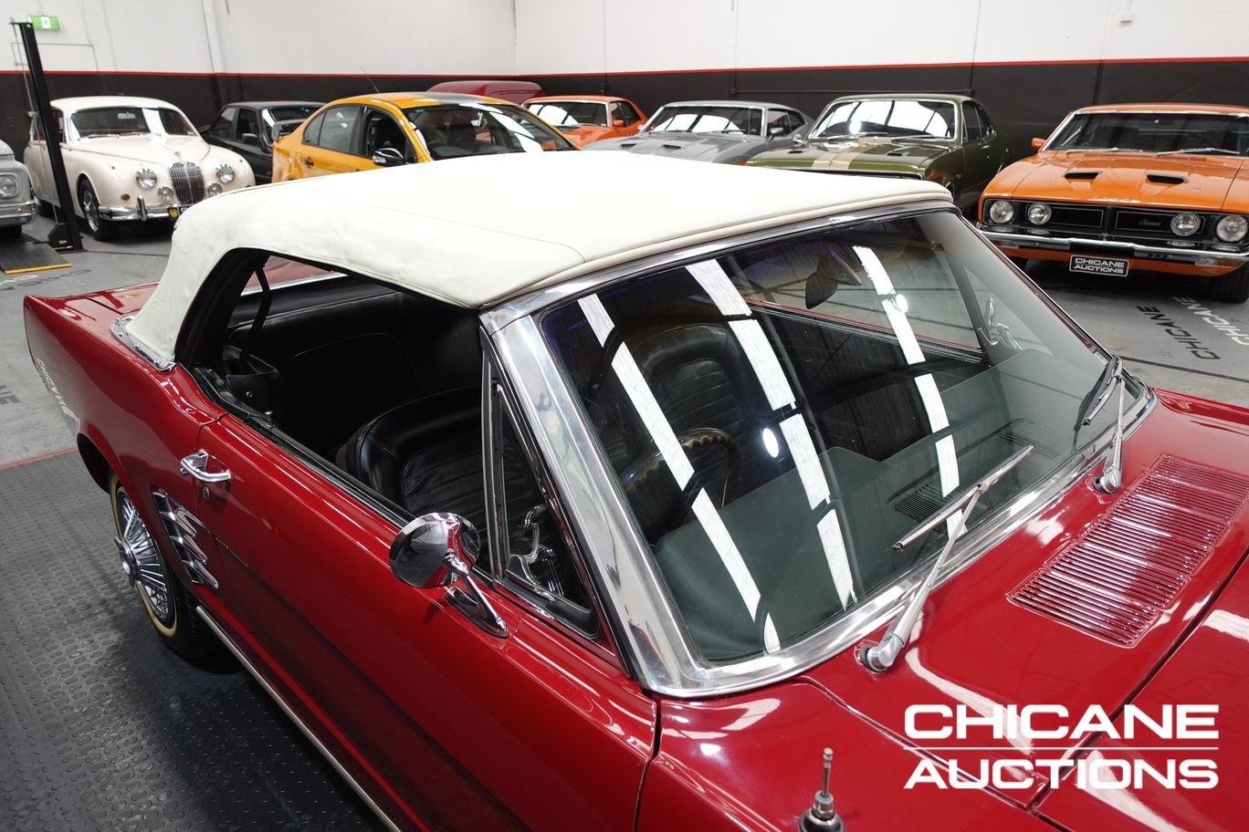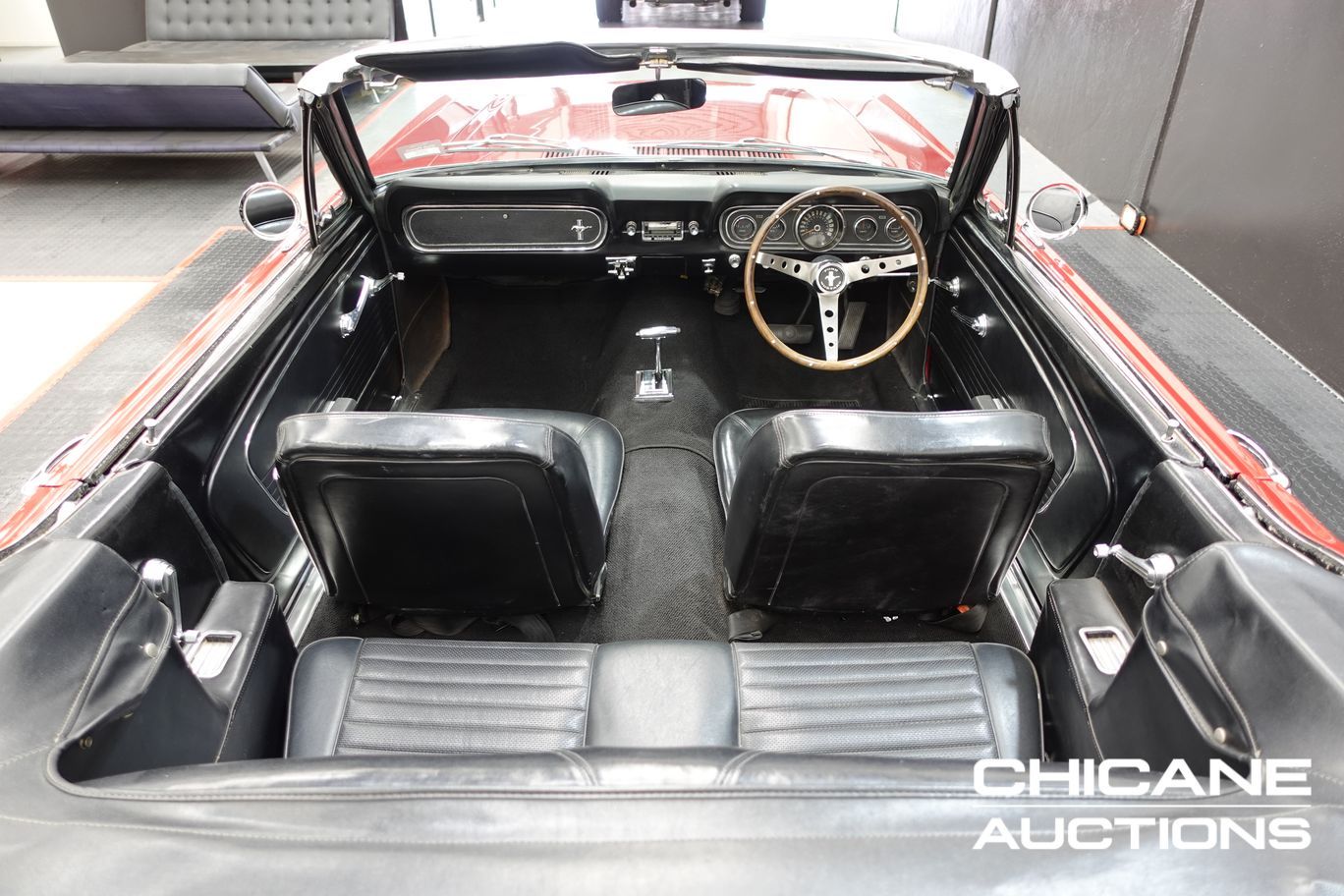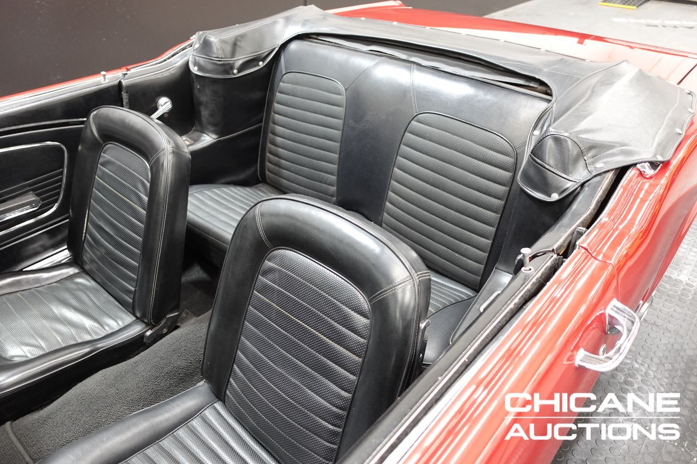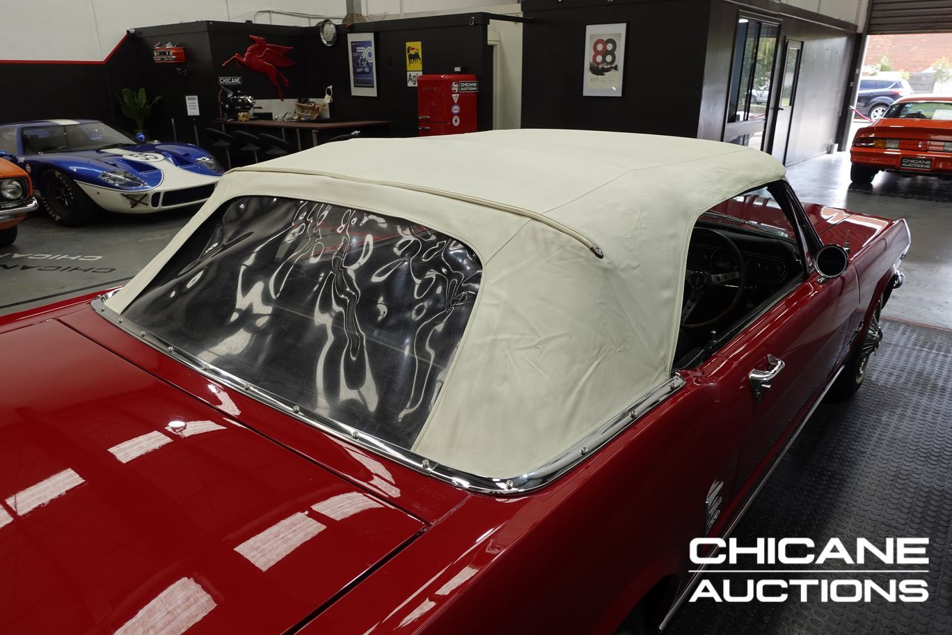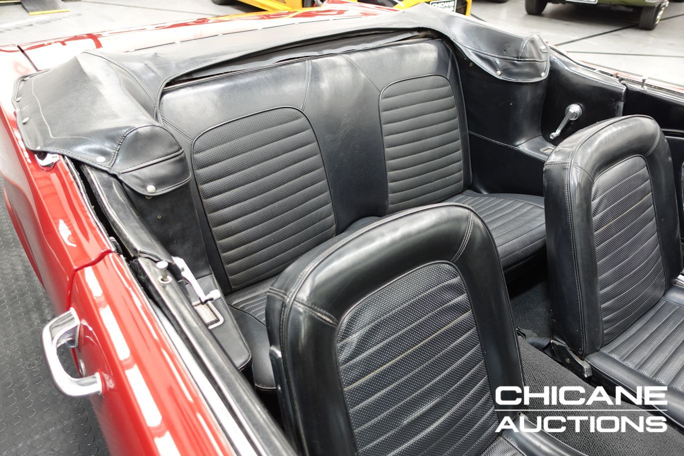 Inside, the Mustang features black vinyl trim that contrasts neatly with the dark red exterior. Bucket seats, tidy door trims, and factory-style dash layout give an authentic 1960s feel. The interior is in clean and tidy order, presenting comfortably for everyday use or weekend drives. The black cabin is further complemented by the cream convertible roof lining when raised, giving a classic dual-tone presentation.