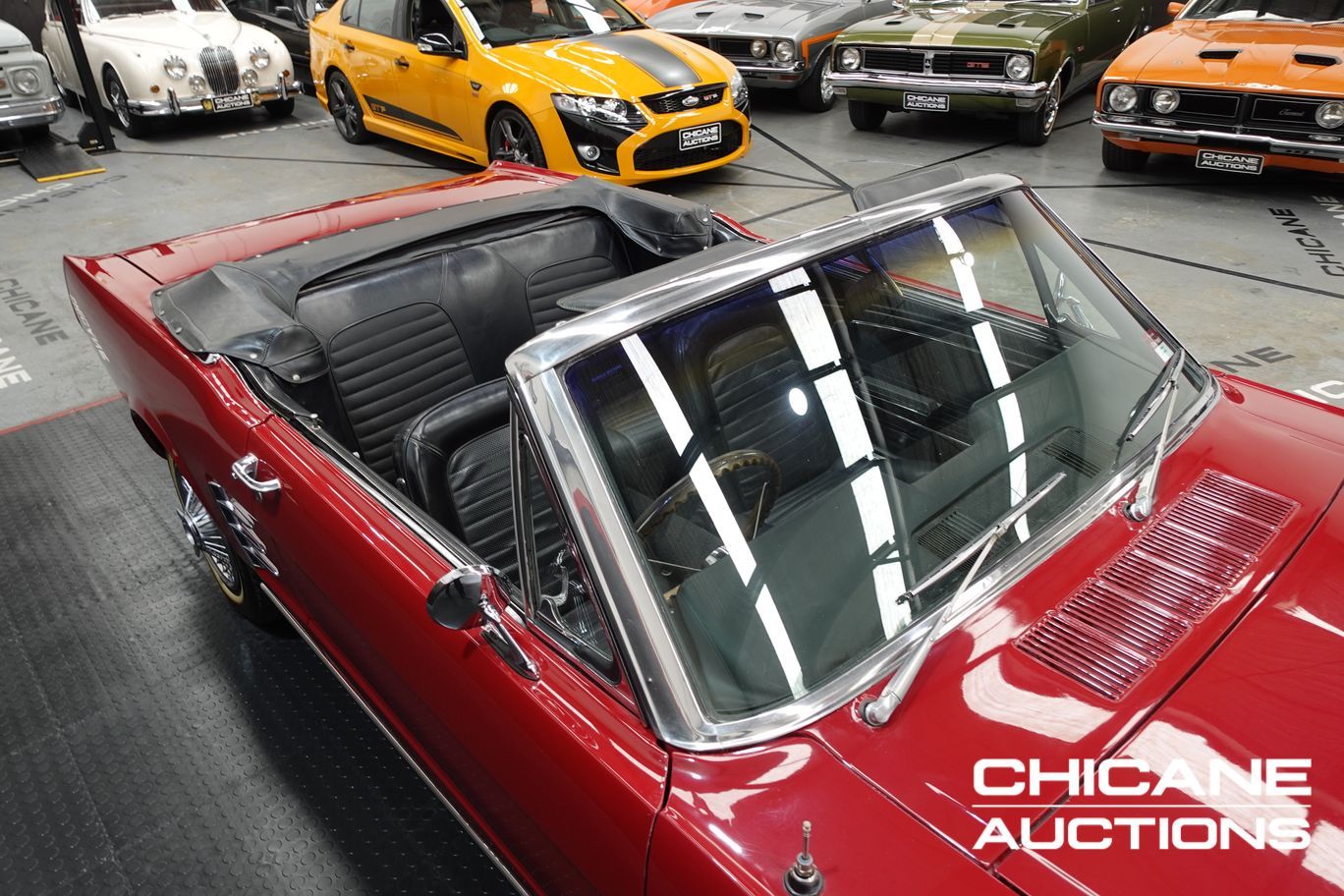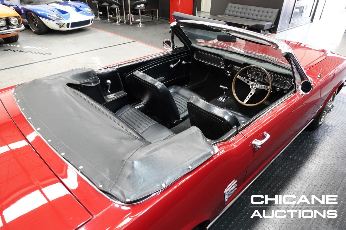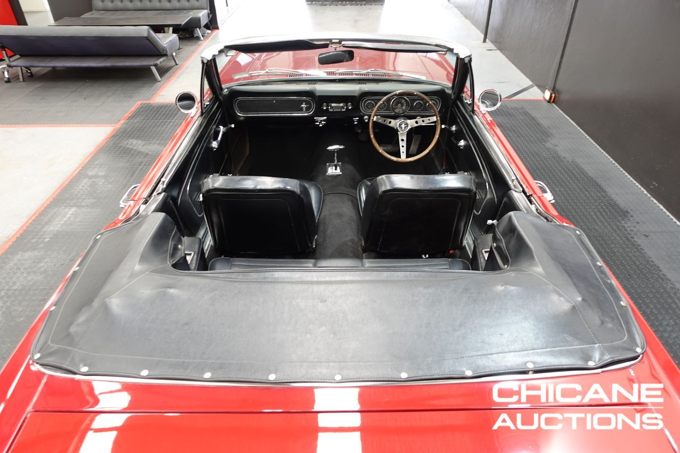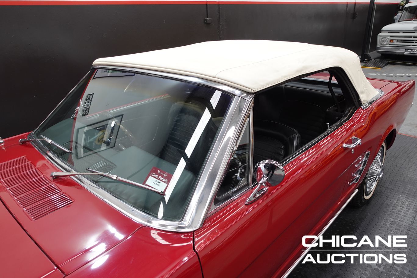 Inside, the Mustang features black vinyl trim that contrasts neatly with the dark red exterior. Bucket seats, tidy door trims, and factory-style dash layout give an authentic 1960s feel. The interior is in clean and tidy order, presenting comfortably for everyday use or weekend drives. The black cabin is further complemented by the cream convertible roof lining when raised, giving a classic dual-tone presentation.