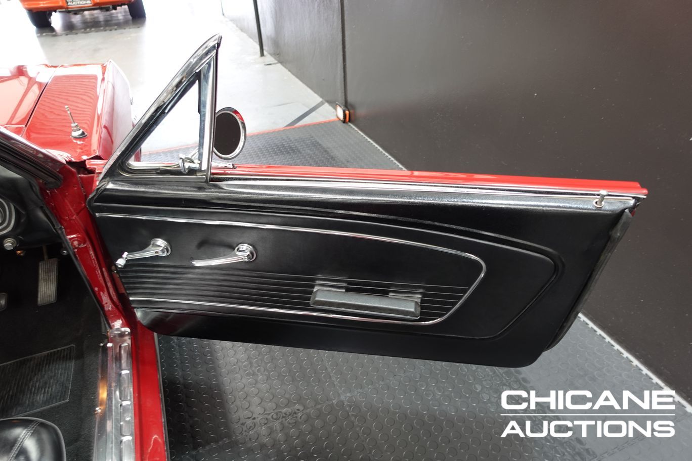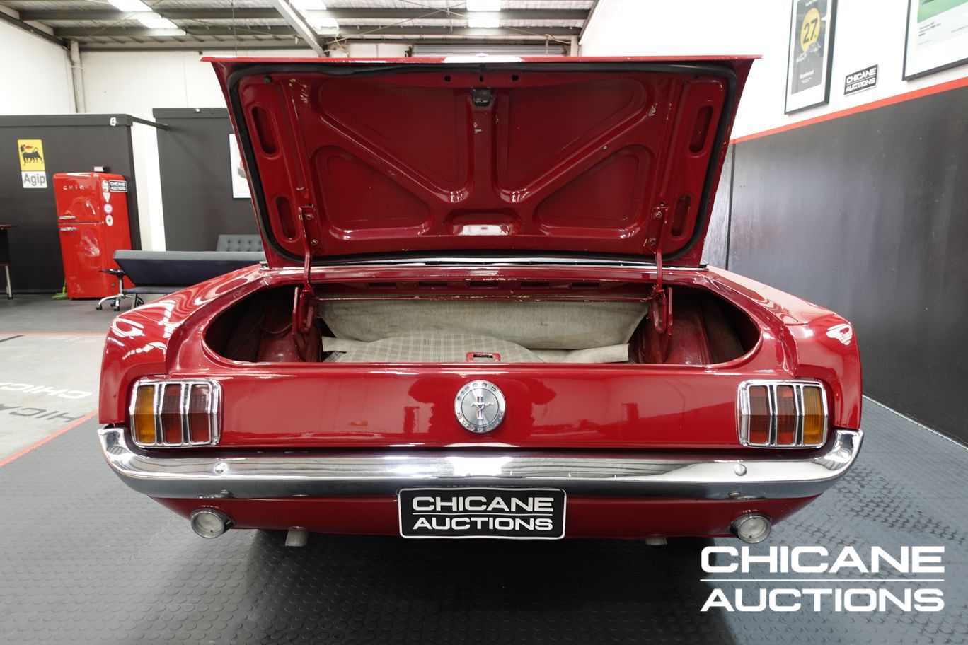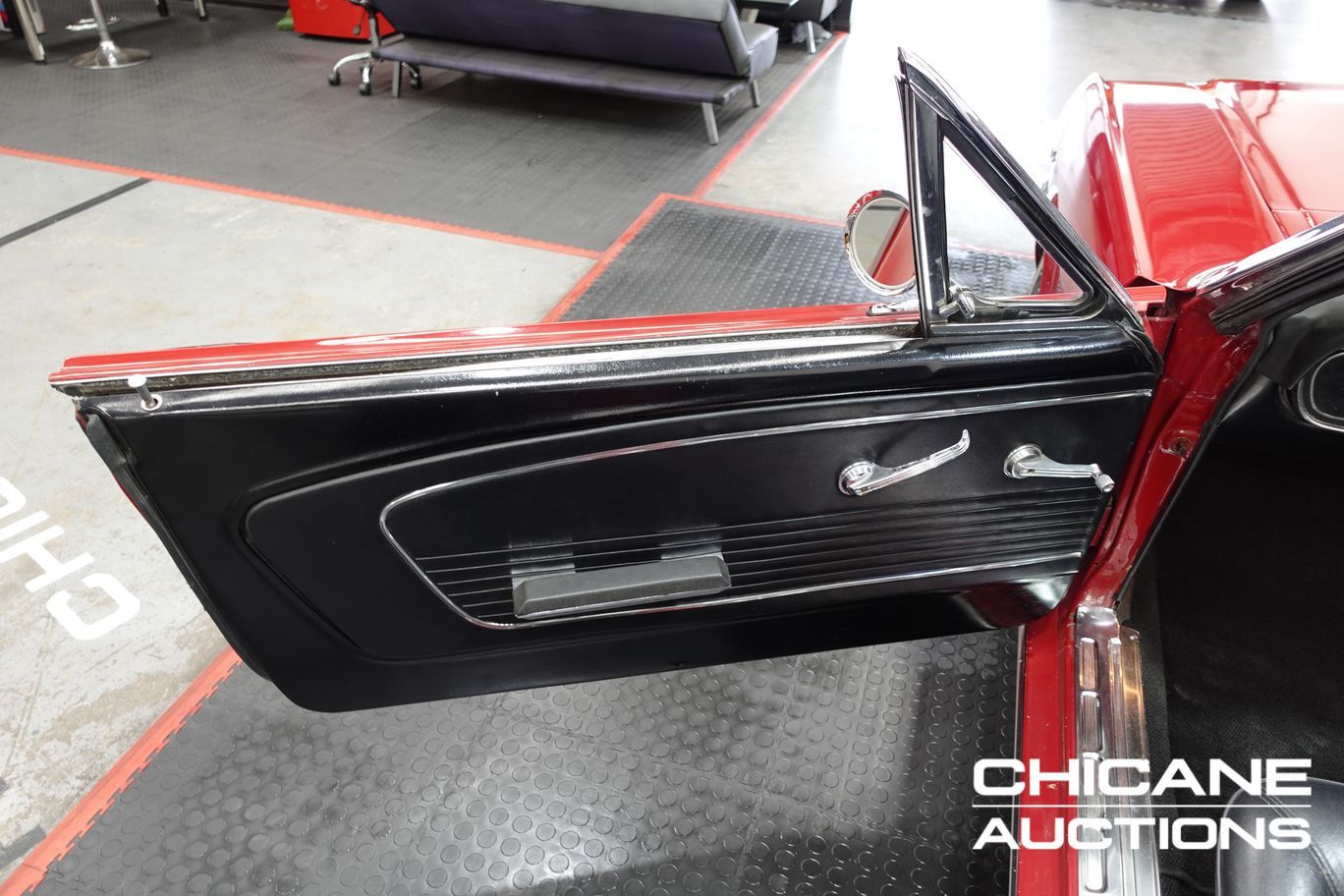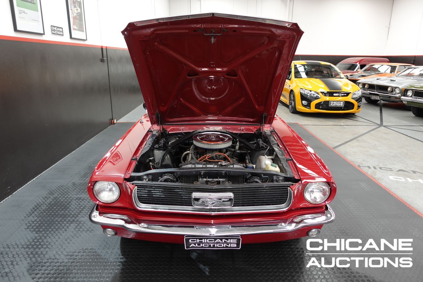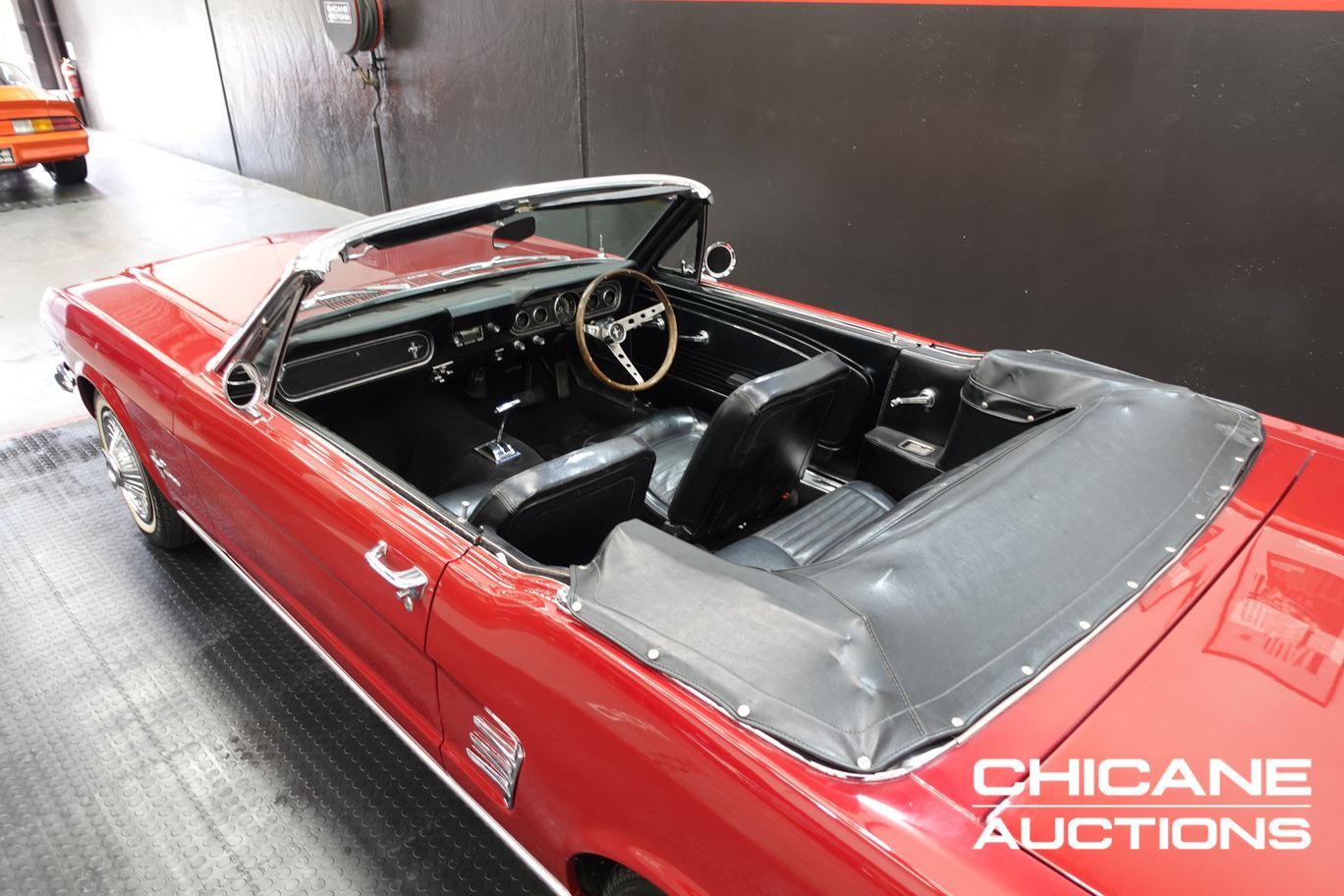 Inside, the Mustang features black vinyl trim that contrasts neatly with the dark red exterior. Bucket seats, tidy door trims, and factory-style dash layout give an authentic 1960s feel. The interior is in clean and tidy order, presenting comfortably for everyday use or weekend drives. The black cabin is further complemented by the cream convertible roof lining when raised, giving a classic dual-tone presentation.
