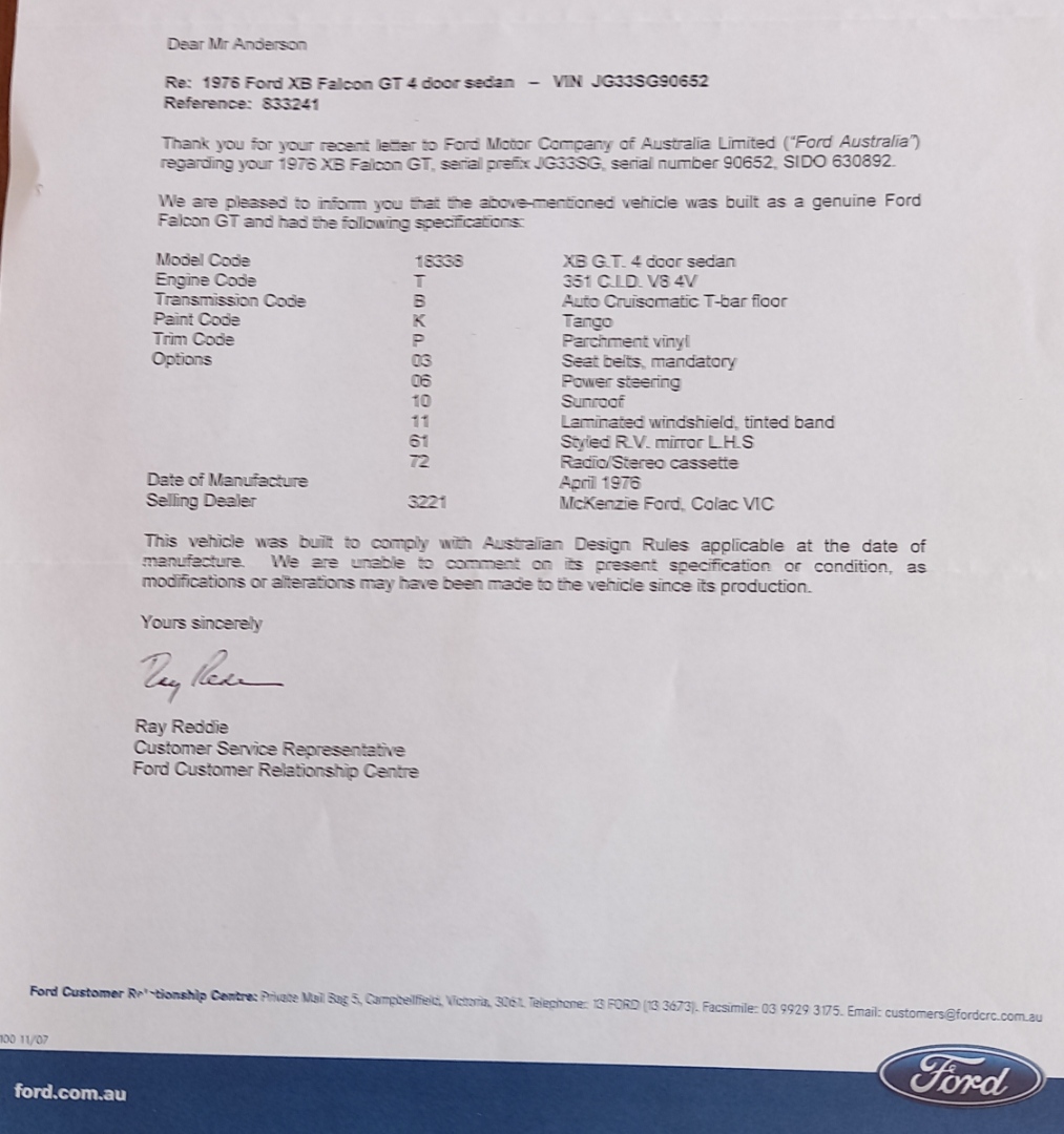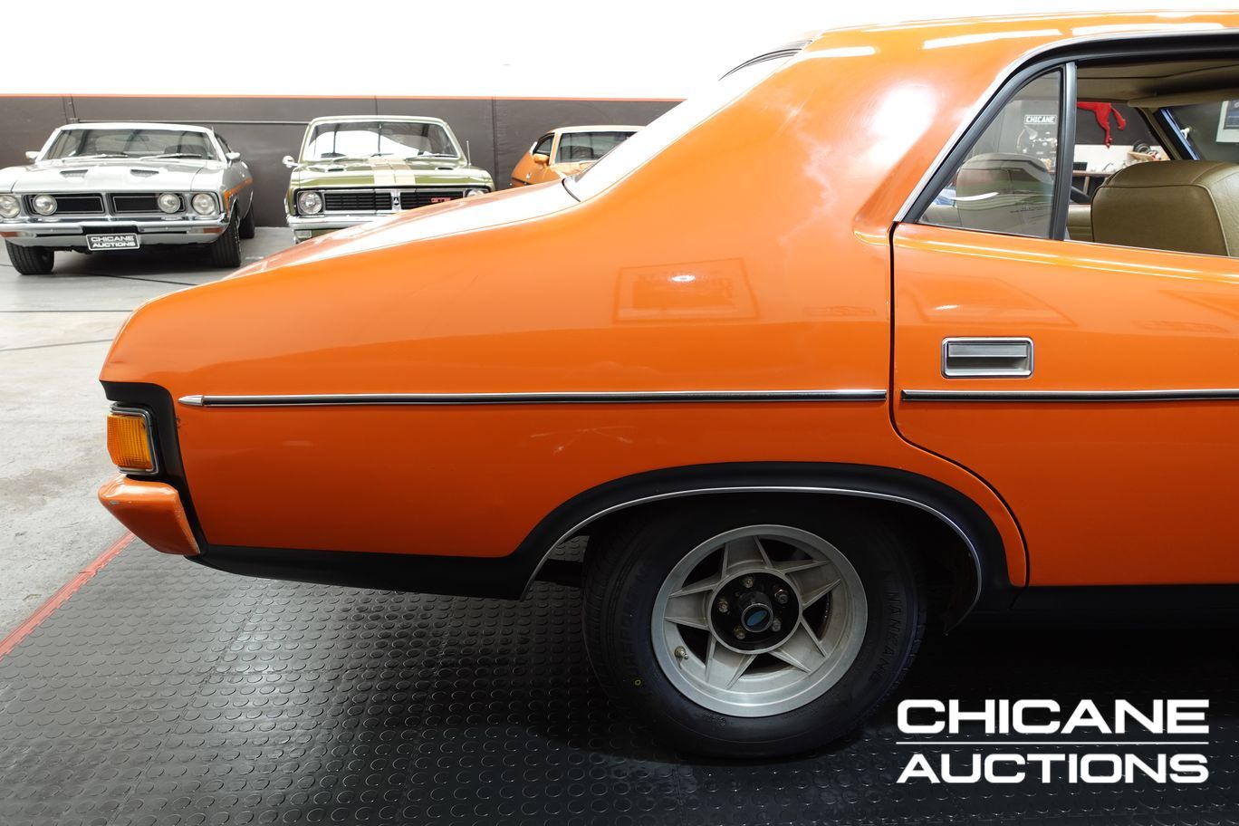 On offer is a genuine two-owner 1976 Ford Falcon XB GT Sedan — one of the final GT Falcons built in the 1970’s. This example is an original, matching-numbers car finished in rare factory ‘Code K’ Tango with contrasting Parchment vinyl trim. Delivered new through Ansett Motors / McKenzie Ford in Victoria, it is confirmed as a unique one-of-one build in this specification and a standout in Ford Australia’s GT history. Having travelled an indicated 192,340 kilometres from new, it has enjoyed long-term 45 year ownership and care with its current Owner since 1980. Exceptionally authentic and remarkably well-preserved, it is offered with its original black-and-white Victorian registration plates, underscoring its provenance and originality.