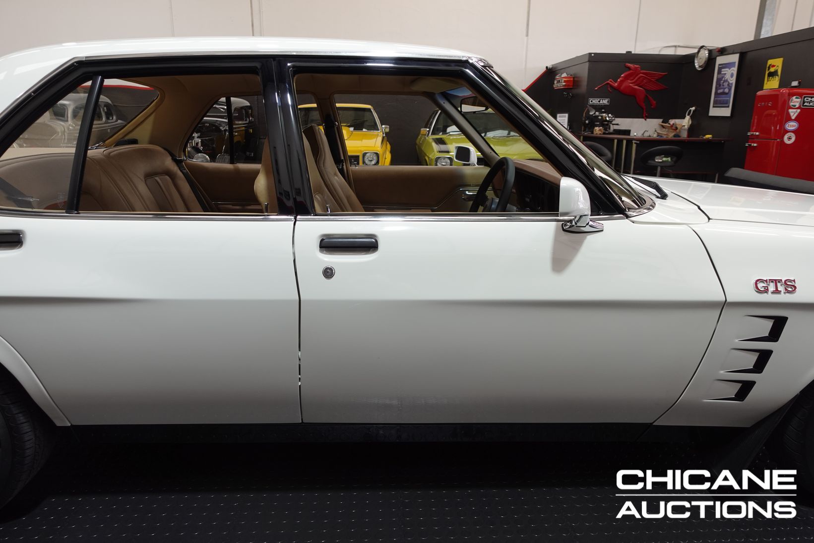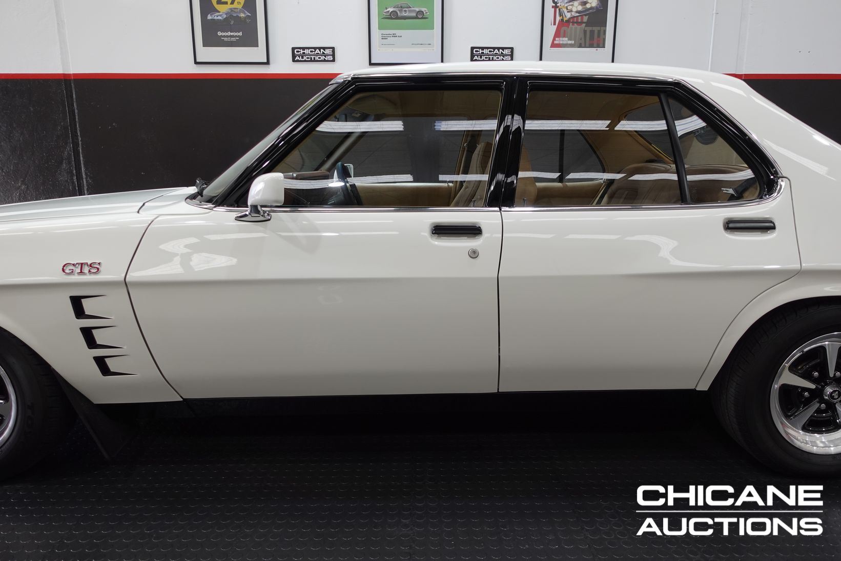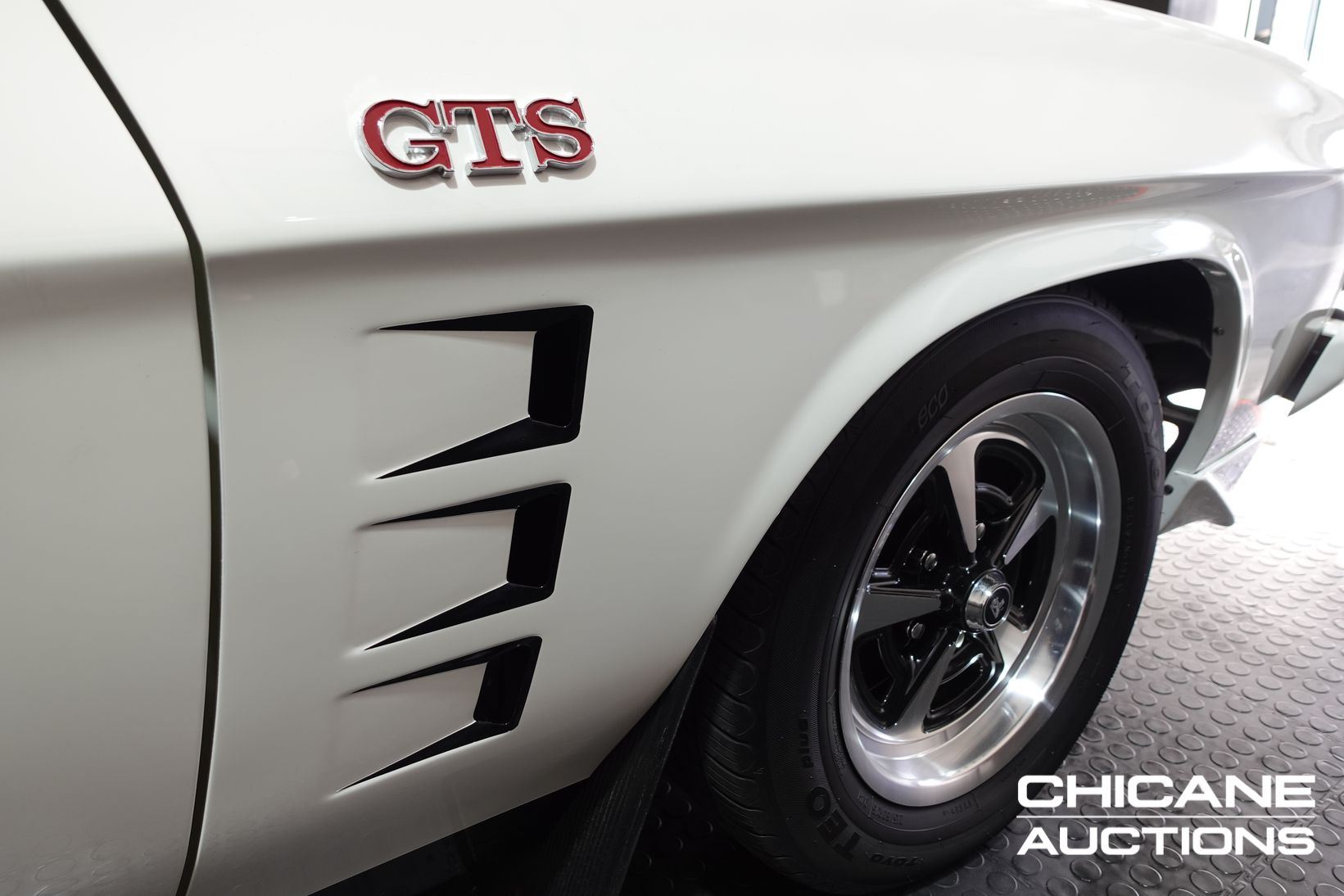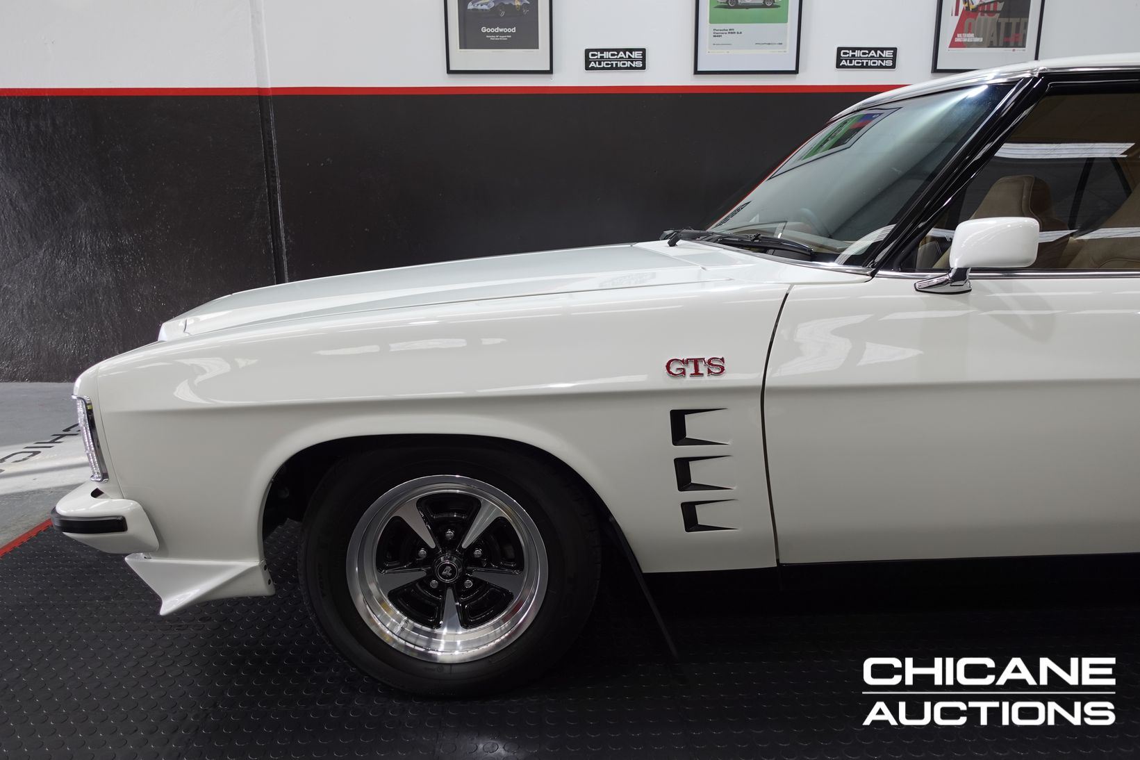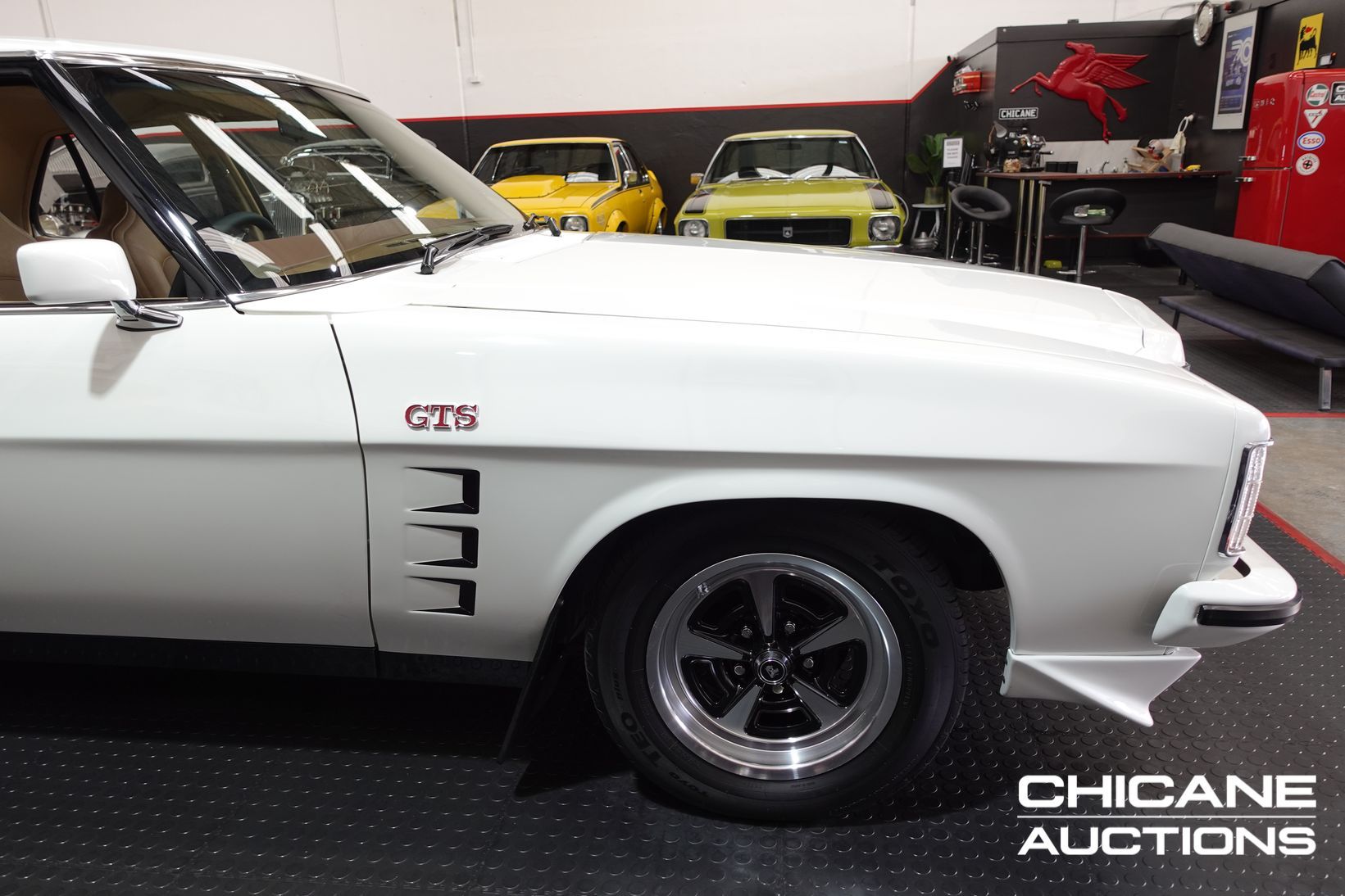 Presented in its correct Palais White (code 30521), the body has been restored to an exceptionally high standard, with straight panels, precise alignment, and deep, high-gloss paintwork. All GTS-specific features are present, including the colour-coded sports grille, body side flutes, quad headlamp front, and appropriate badging. The exterior detailing extends to correctly refinished brightwork, restored bumpers, and new weather seals. Currently 15″ GTS style wheels are fitted, with the full set of GMH factory original Factory 14″ GTS wheels with matching Maxxis tyres in mint condition are supplied with the car for authenticity. The overall finish and attention to detail place this example among the very best of its kind, with presentation that would satisfy the most discerning collector.