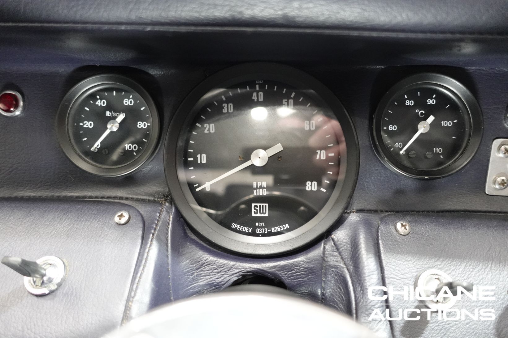 Power comes from a period-style Ford 302 cubic-inch Windsor V8, breathing through a quartet of Weber 48 IDF downdraft carburettors — similar style to the works GT40’s that raced at Lemans. The engine delivers both the induction roar and the performance expected of this legendary machine. A robust five-speed Renault UN1 transaxle channels the power to the rear wheels, ensuring strong performance and tractability. Stopping power is delivered by four-wheel disc brakes with BRM replica alloy wheels with period Hoosier tyres for the correct look, completing a driveline package that stays faithful to the engineering ethos of the original.
